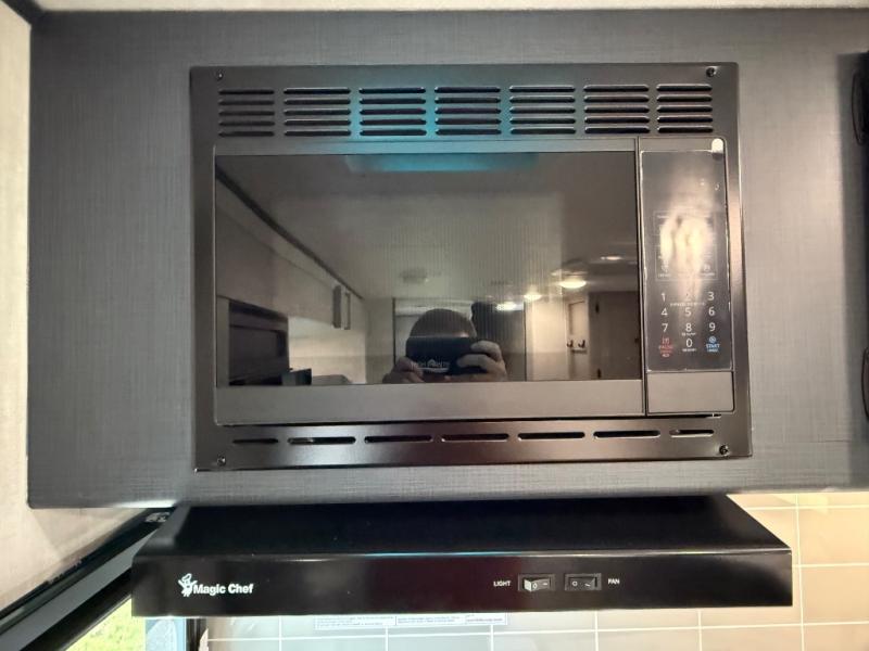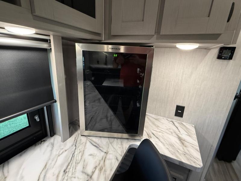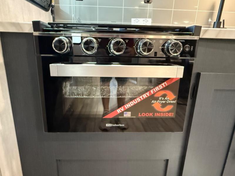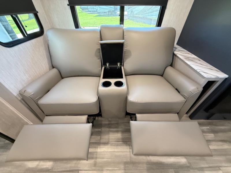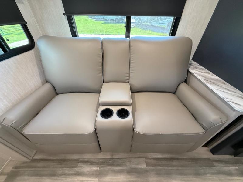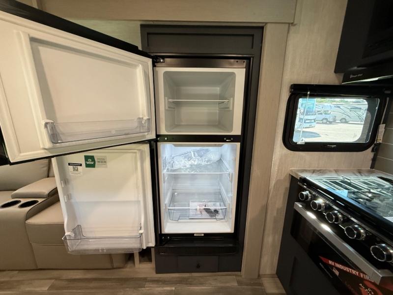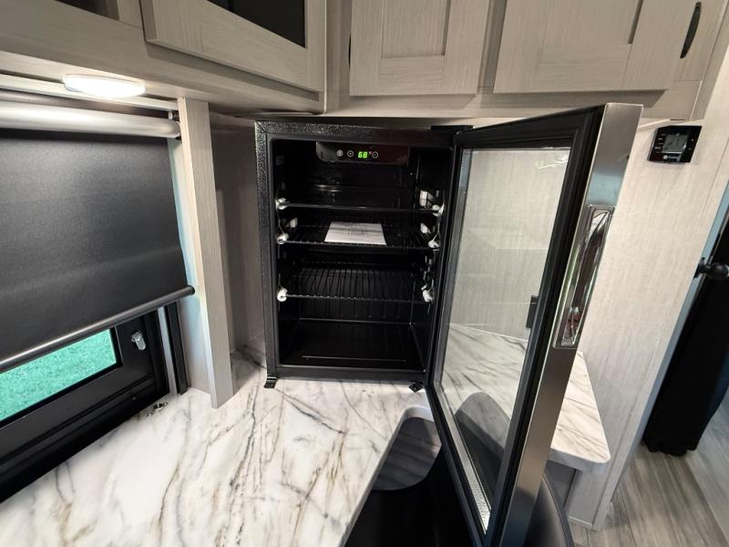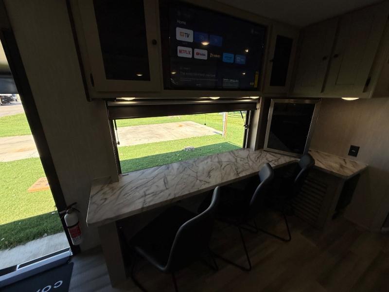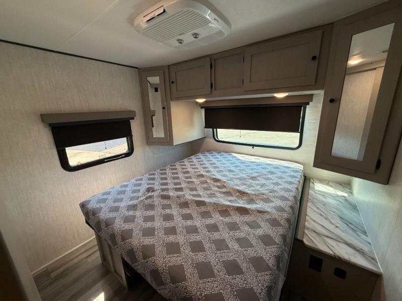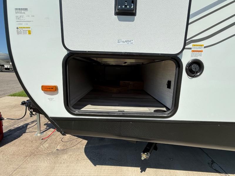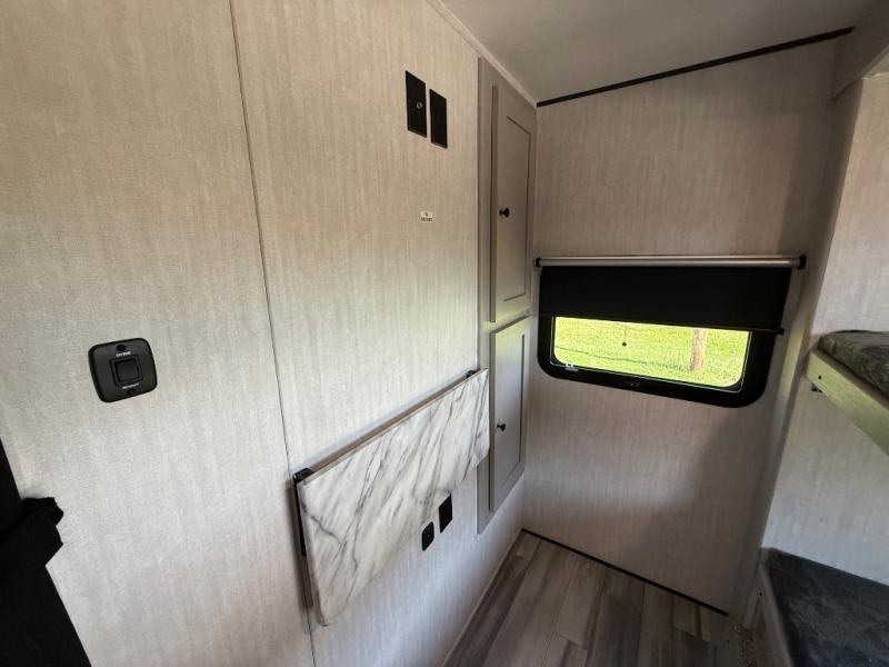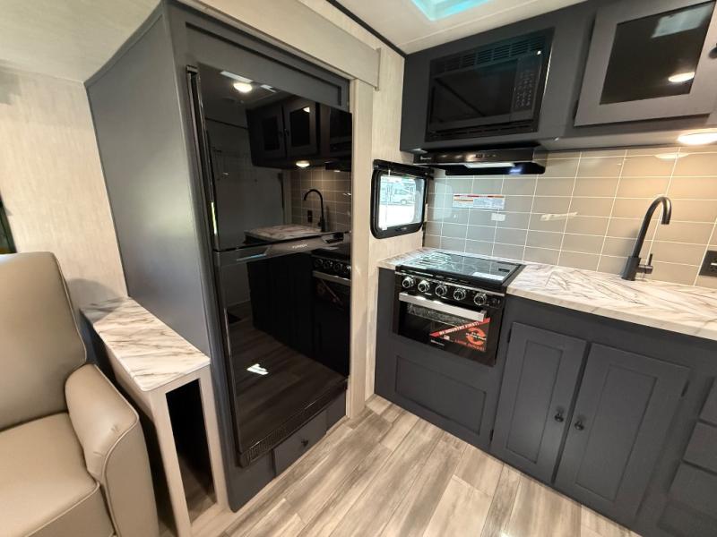 This travel trailer resembles the layout of 242BARV, but you'll enjoy the added semi-private bunkhouse in this unit. There is a 30" x 74" bottom bunk with storage and a 30" x 74" tilt-up bunk above, plus a wardrobe and flip-up TV prep in the wall. The owners will enjoy the front private bedroom with a 60 x 80 queen bed with super storage, dual wardrobes beside the bed and a overhead cabinet. In the kitchen area you will find a 12V refrigerator, pantry, three burner cooktop and a bar countertop with chairs. There is also a tri-fold sofa slide for more seating and sleeping space. This unit also includes a spacious full bath with one of the dual entry doors to the unit for added convenience!