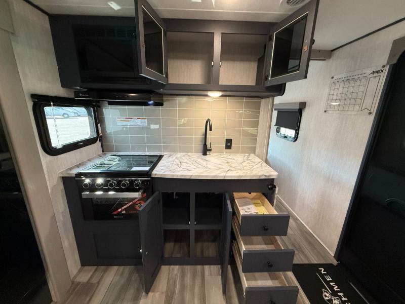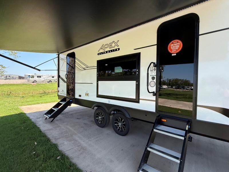 Lightweight living and camping is found with the Apex Ultra-Lite travel trailers by Coachmen. These eco-friendly units are made to last thanks to the Azdel composite sidewalls, the laminated aluminum floor, and the vacuum-bonded laminated trussed roof. Super lube axles make towing easier than ever, plus there is a friction hinge entrance door, a 200-watt solar panel with a 30 Amp control charger, and slam latch baggage door catches for easy unloading. Some of the interior comforts you'll fall in love with are the one-piece seamless edge countertops, the hard valances with roller shades, the matte black hardware, and the Casino Bisque cabinetry. The Apex Ultra-Lite trailers also include a USB charge station, plus a digital TV antenna with cable hook-ups and Wi-Fi capability for the option to stay connected as you camp!