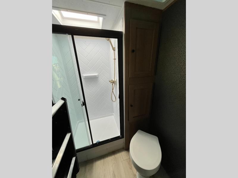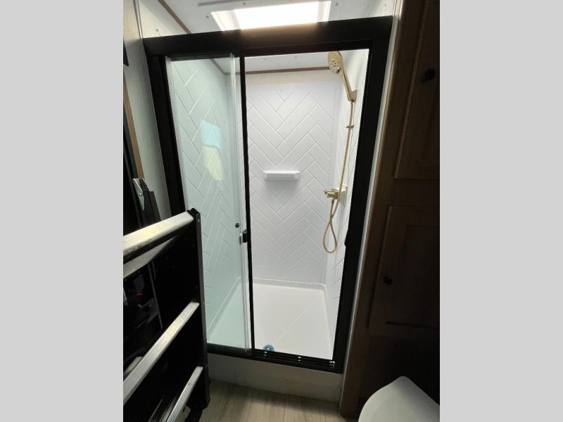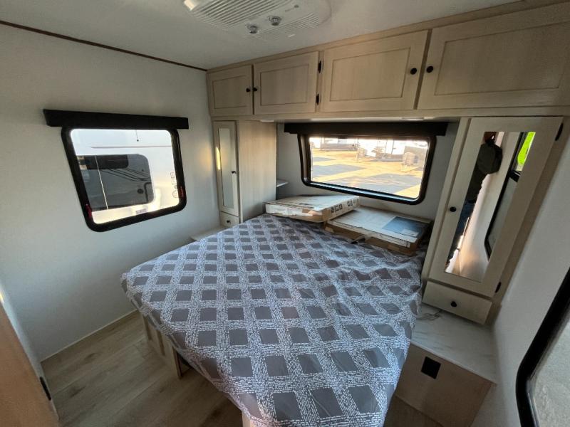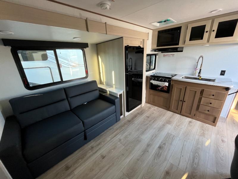 This travel trailer resembles the layout of 242BARV, but you'll enjoy the added semi-private bunkhouse in this unit. There is a 30" x 74" bottom bunk with storage and a 30" x 74" tilt-up bunk above, plus a wardrobe and flip-up TV prep in the wall. The owners will enjoy the front private bedroom with a 60 x 80 queen bed with super storage, dual wardrobes beside the bed and a overhead cabinet. In the kitchen area you will find a 12V refrigerator, pantry, three burner cooktop and a bar countertop with chairs. There is also a tri-fold sofa slide for more seating and sleeping space. This unit also includes a spacious full bath with one of the dual entry doors to the unit for added convenience!