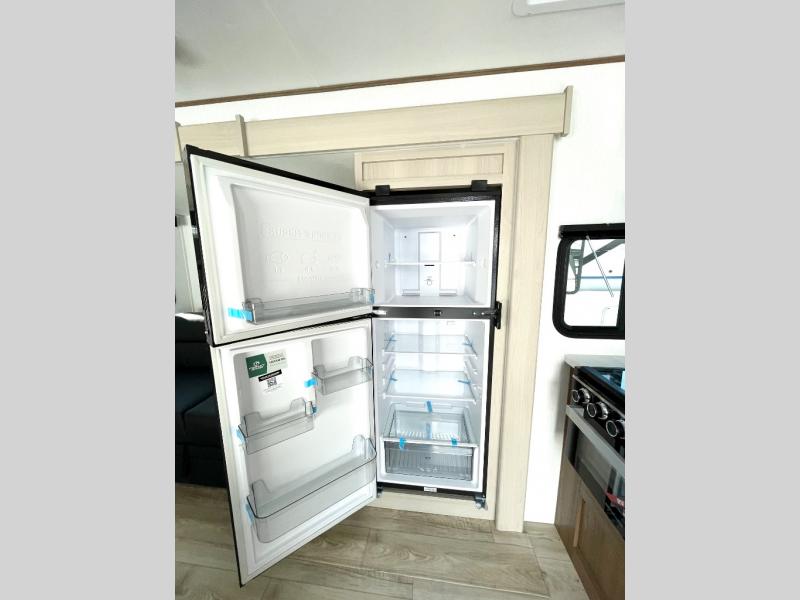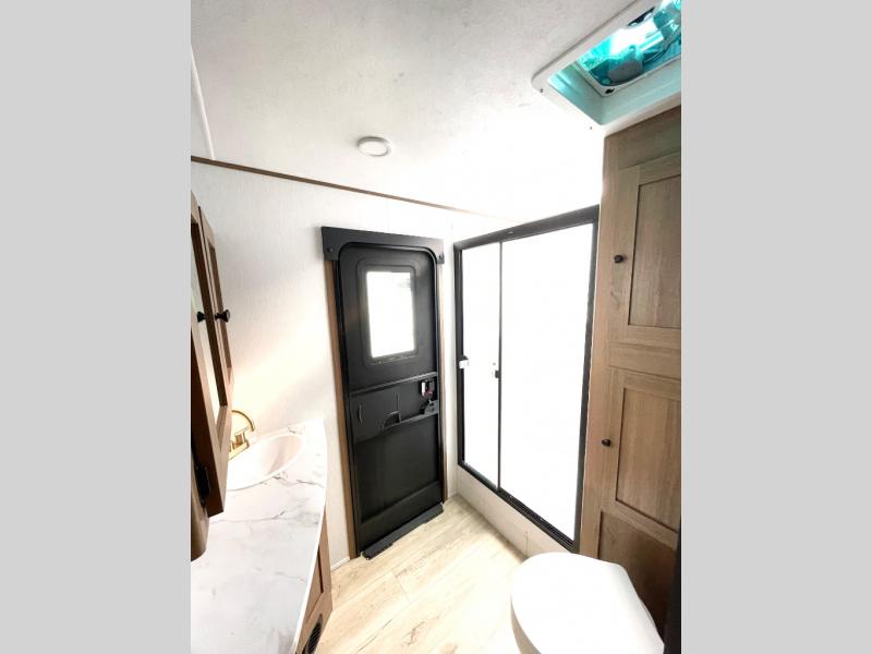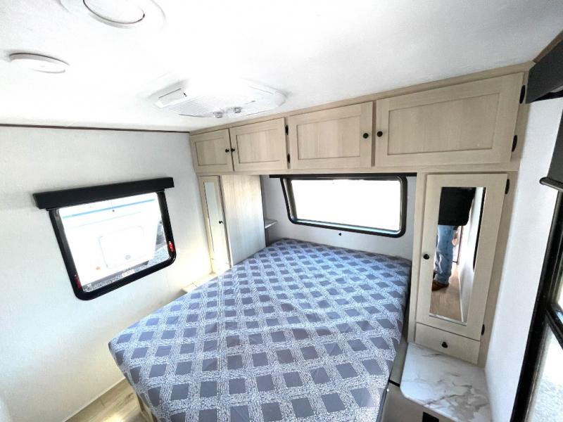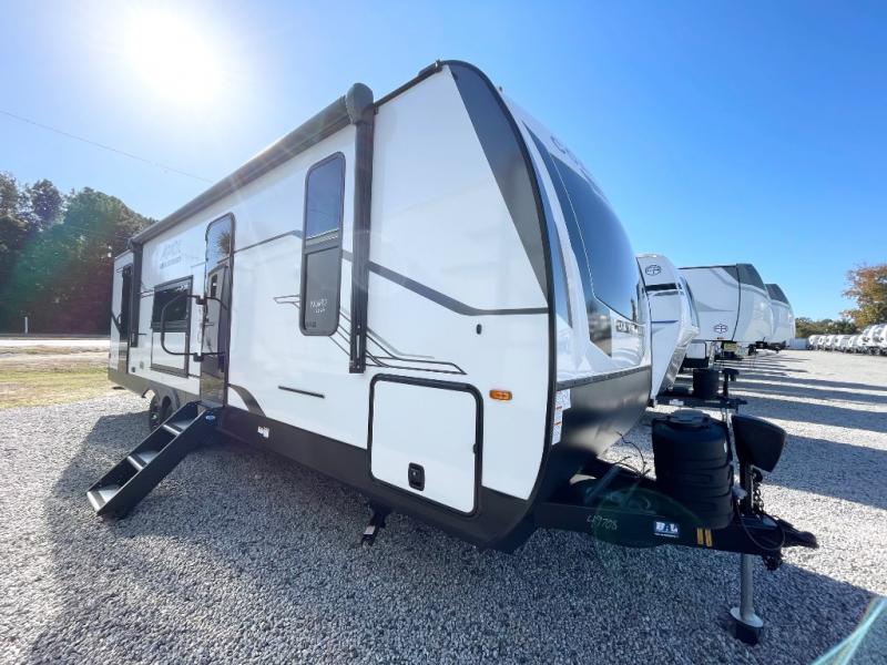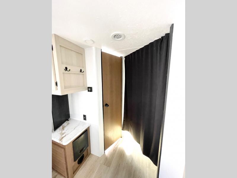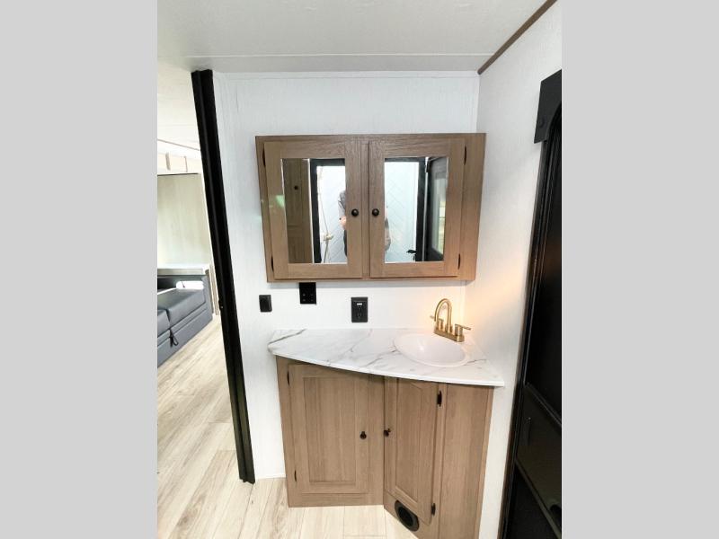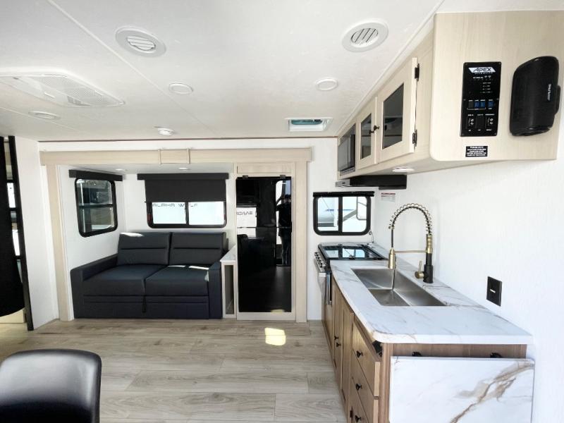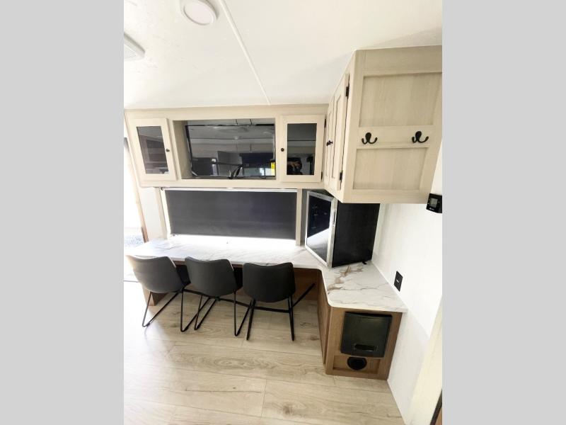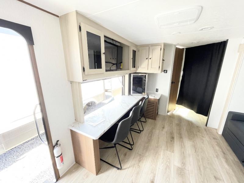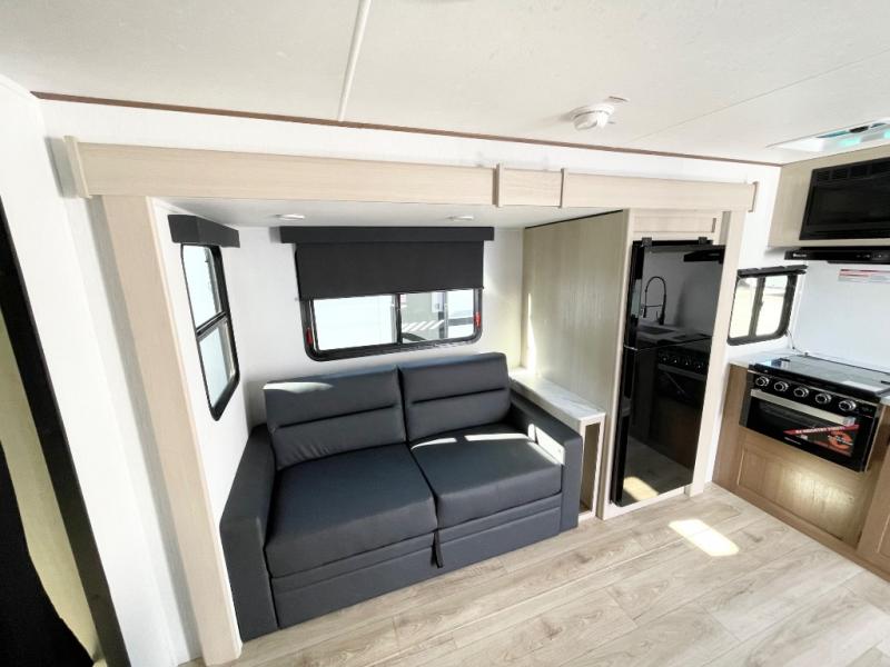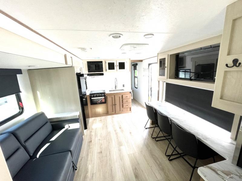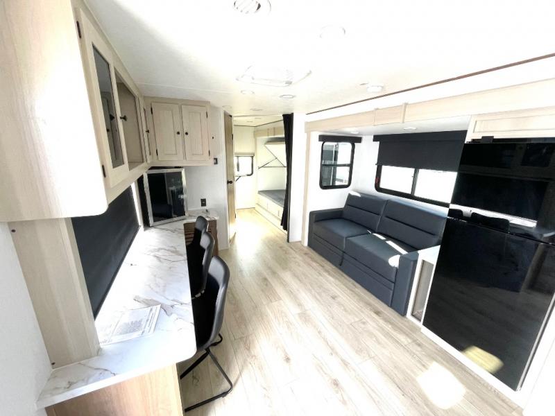 This travel trailer resembles the layout of 242BARV, but you'll enjoy the added semi-private bunkhouse in this unit. There is a 30" x 74" bottom bunk with storage and a 30" x 74" tilt-up bunk above, plus a wardrobe and flip-up TV prep in the wall. The owners will enjoy the front private bedroom with a 60 x 80 queen bed with super storage, dual wardrobes beside the bed and a overhead cabinet. In the kitchen area you will find a 12V refrigerator, pantry, three burner cooktop and a bar countertop with chairs. There is also a tri-fold sofa slide for more seating and sleeping space. This unit also includes a spacious full bath with one of the dual entry doors to the unit for added convenience!
