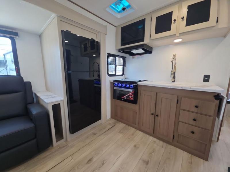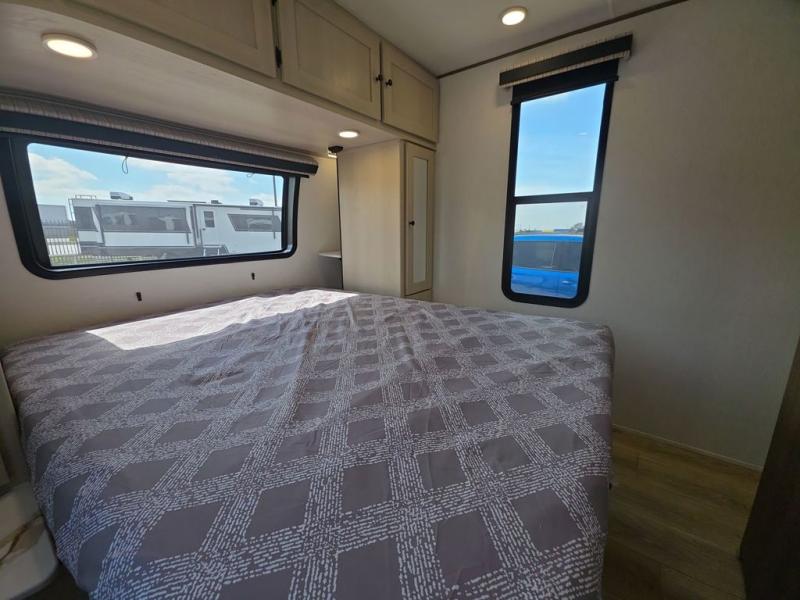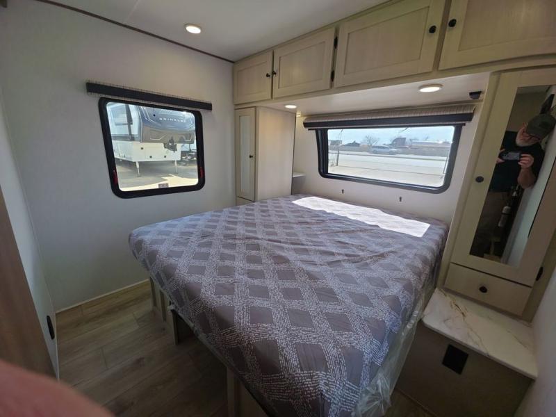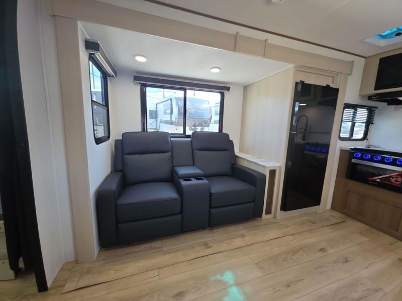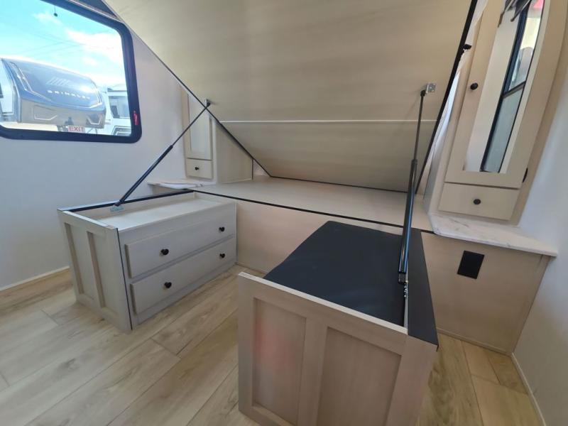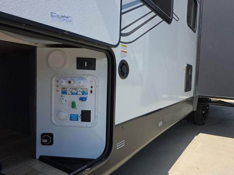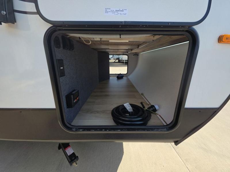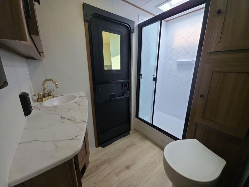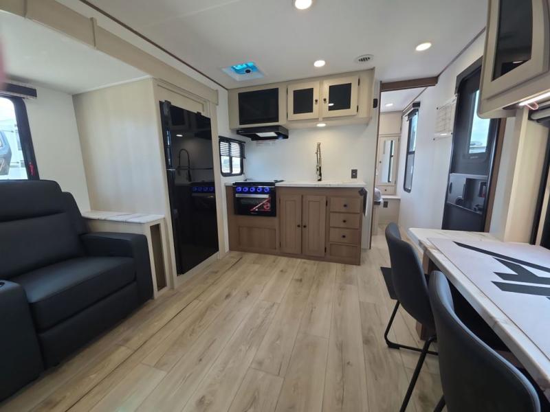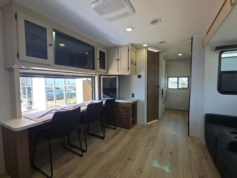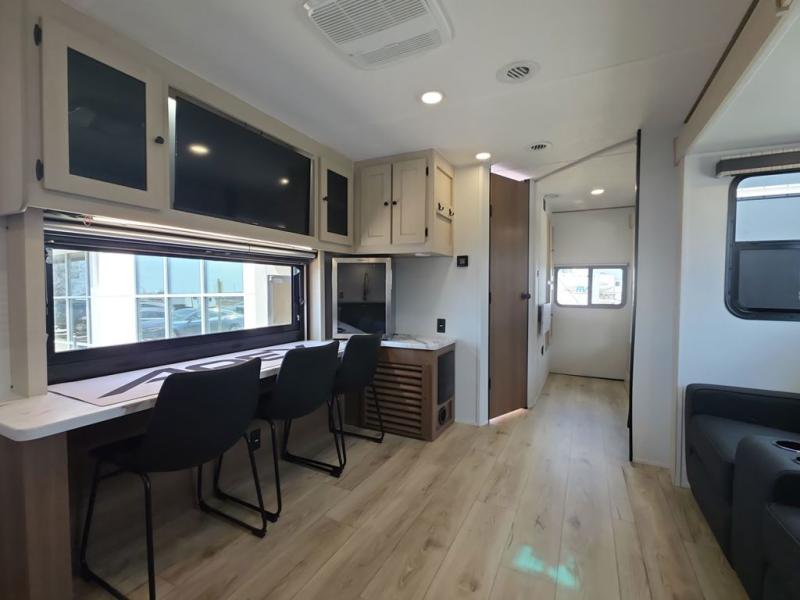 This travel trailer resembles the layout of 242BARV, but you'll enjoy the added semi-private bunkhouse in this unit. There is a 30" x 74" bottom bunk with storage and a 30" x 74" tilt-up bunk above, plus a wardrobe and flip-up TV prep in the wall. The owners will enjoy the front private bedroom with a 60 x 80 queen bed with super storage, dual wardrobes beside the bed and a overhead cabinet. In the kitchen area you will find a 12V refrigerator, pantry, three burner cooktop and a bar countertop with chairs. There is also a tri-fold sofa slide for more seating and sleeping space. This unit also includes a spacious full bath with one of the dual entry doors to the unit for added convenience!