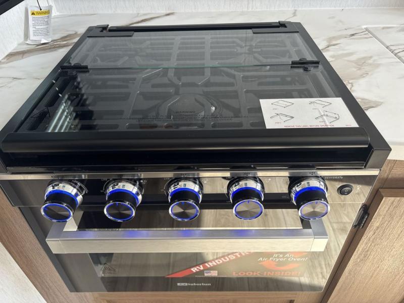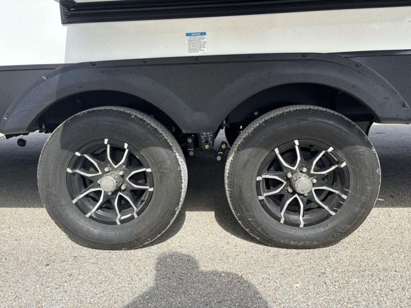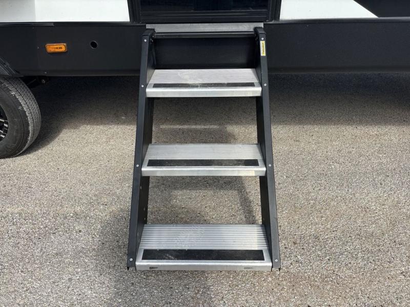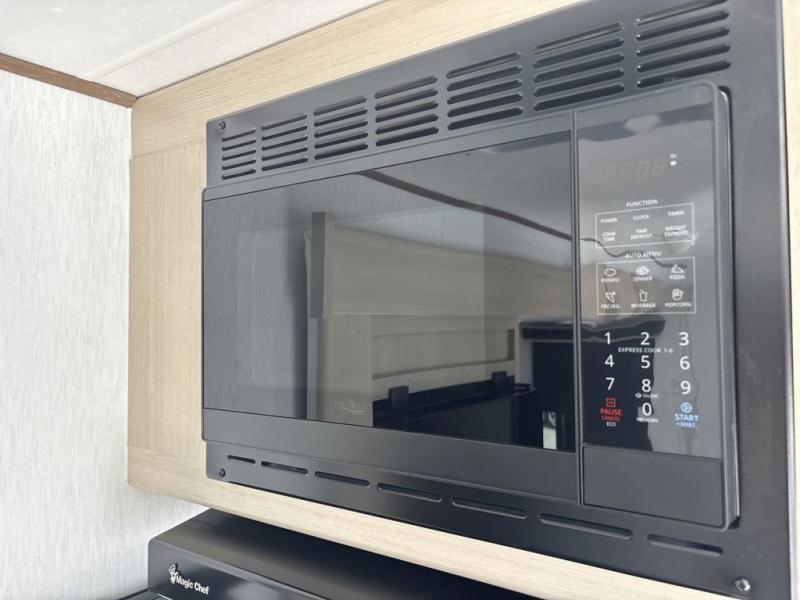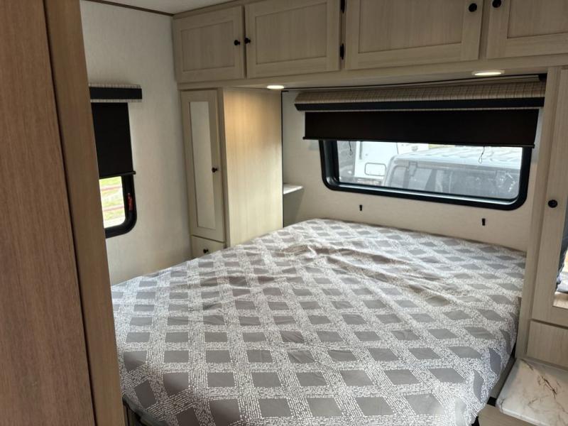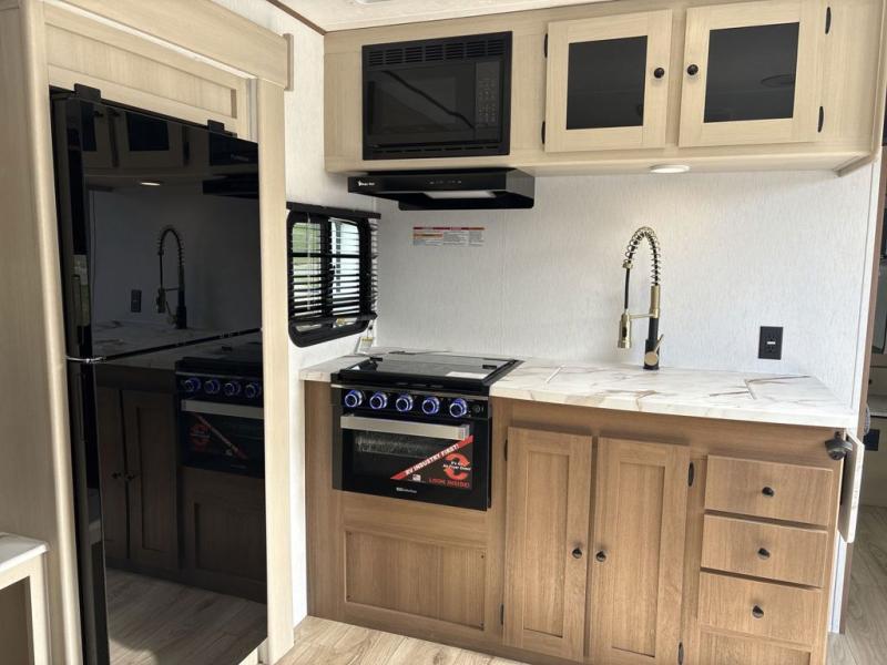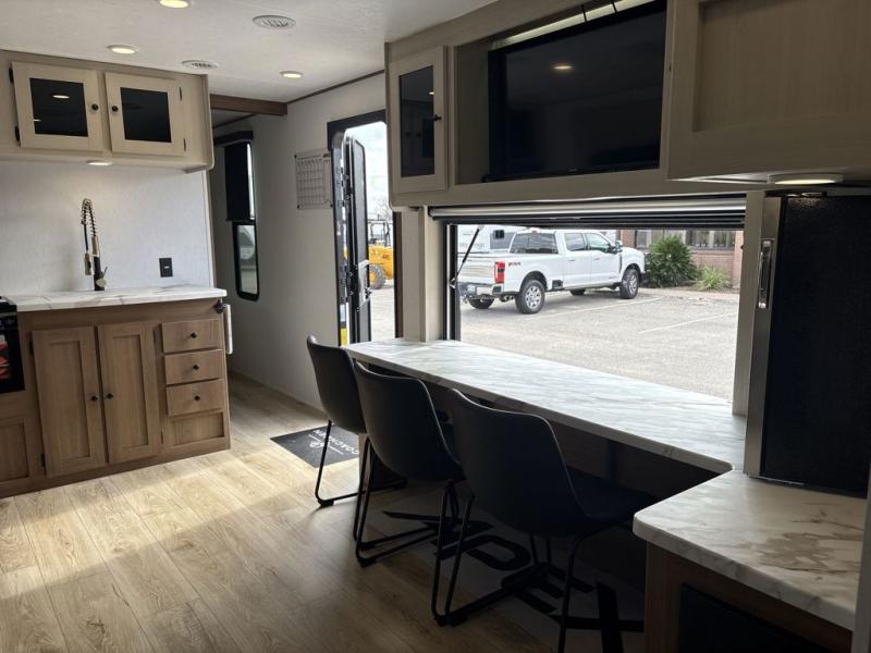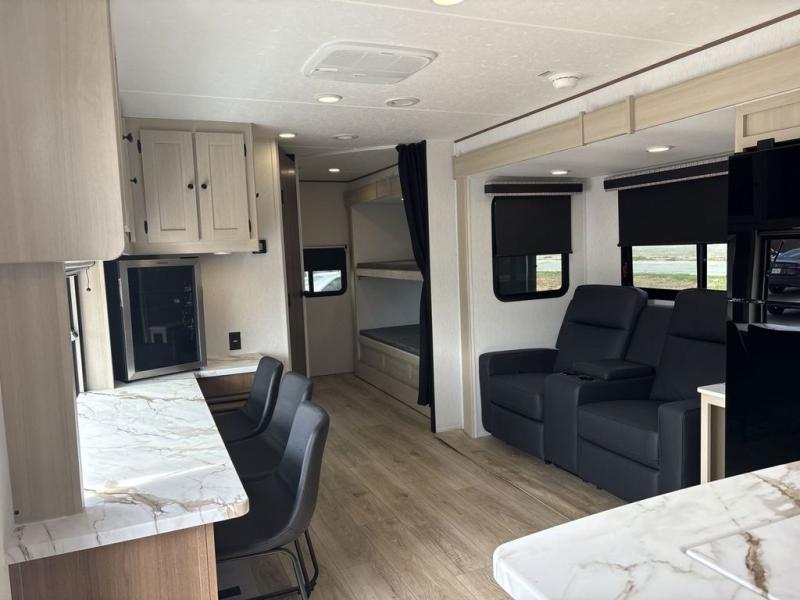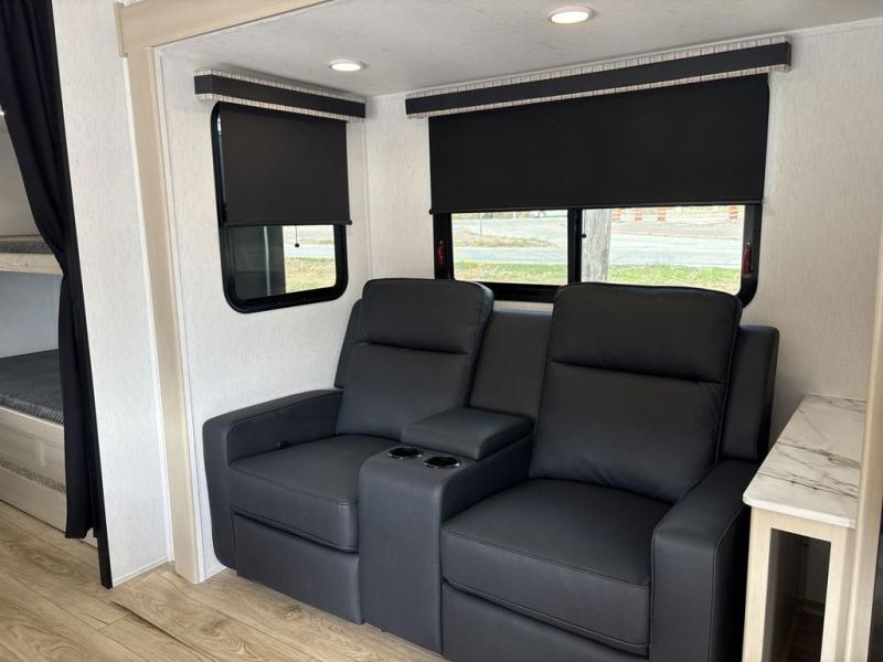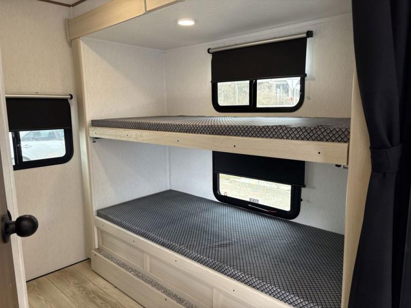 This travel trailer resembles the layout of 242BARV, but you'll enjoy the added semi-private bunkhouse in this unit. There is a 30" x 74" bottom bunk with storage and a 30" x 74" tilt-up bunk above, plus a wardrobe and flip-up TV prep in the wall. The owners will enjoy the front private bedroom with a 60 x 80 queen bed with super storage, dual wardrobes beside the bed and a overhead cabinet. In the kitchen area you will find a 12V refrigerator, pantry, three burner cooktop and a bar countertop with chairs. There is also a tri-fold sofa slide for more seating and sleeping space. This unit also includes a spacious full bath with one of the dual entry doors to the unit for added convenience!
