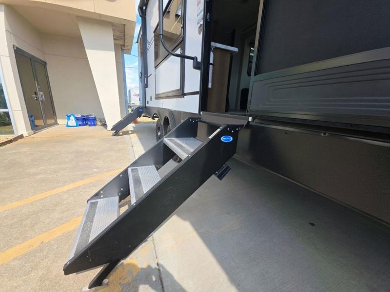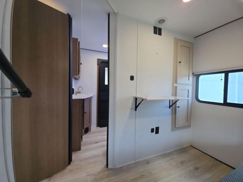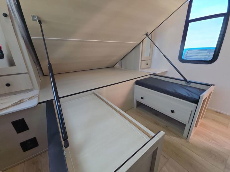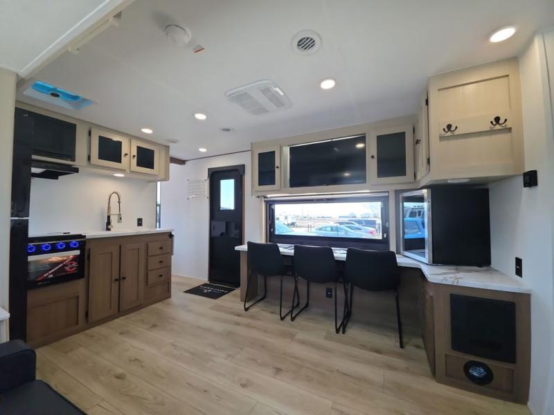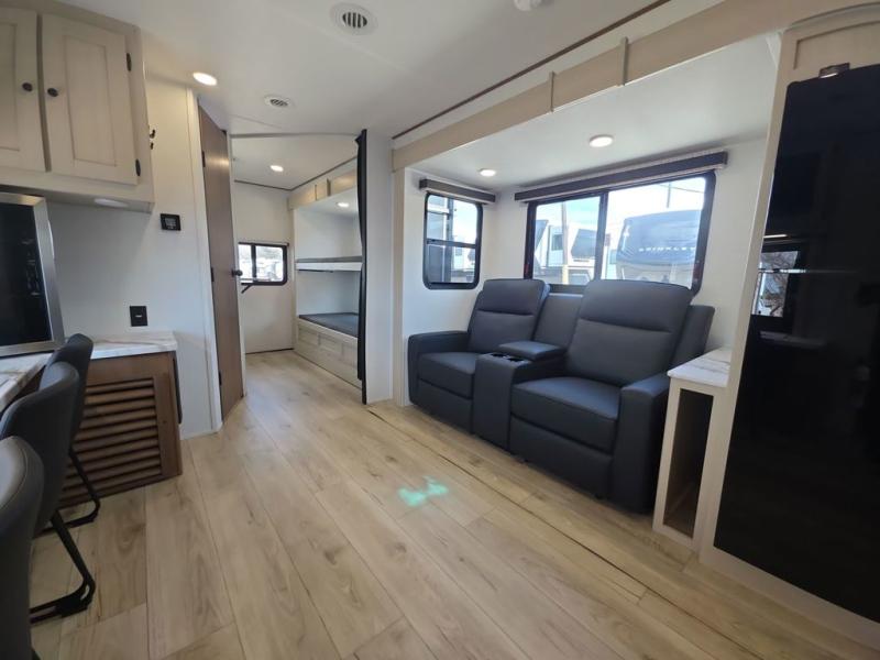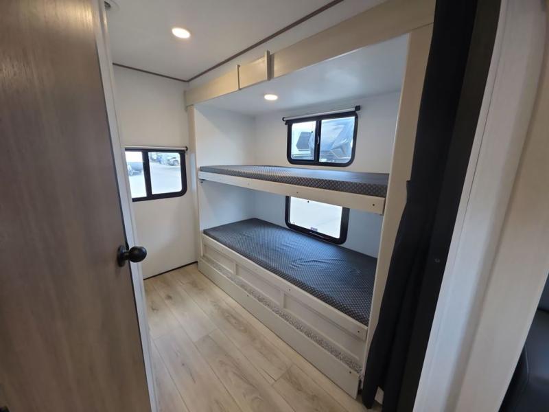 This travel trailer resembles the layout of 242BARV, but you'll enjoy the added semi-private bunkhouse in this unit. There is a 30" x 74" bottom bunk with storage and a 30" x 74" tilt-up bunk above, plus a wardrobe and flip-up TV prep in the wall. The owners will enjoy the front private bedroom with a 60 x 80 queen bed with super storage, dual wardrobes beside the bed and a overhead cabinet. In the kitchen area you will find a 12V refrigerator, pantry, three burner cooktop and a bar countertop with chairs. There is also a tri-fold sofa slide for more seating and sleeping space. This unit also includes a spacious full bath with one of the dual entry doors to the unit for added convenience!