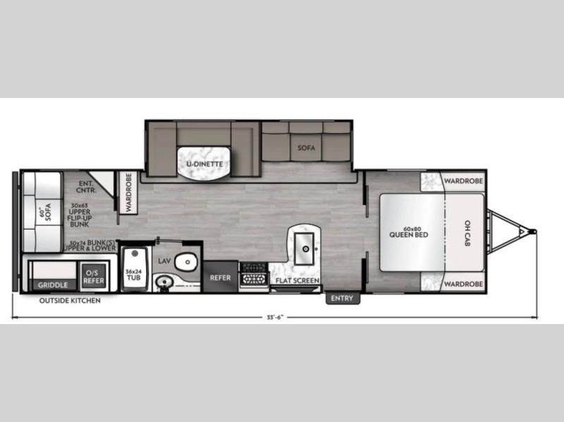 Are you looking for a travel trailer with more interior space and a larger sleeping capacity? This Apex Ultra-Lite trailer may just be the one you've been looking for! Your guests can claim the rear bunkhouse with triple bunks, a sofa, and an entertainment center, while you take the queen bed in the front private bedroom. Everyone can meet in the middle living area and kitchen that includes a sofa and U-shaped dinette, all the kitchen amenities to cook meals, plus a flat screen TV for movie nights. The full bath with a 36" x 24" tub will make bath time easy for the kids or if you need to give the dog a bath! And don't overlook the exterior with its outside kitchen and power awning with an LED light!