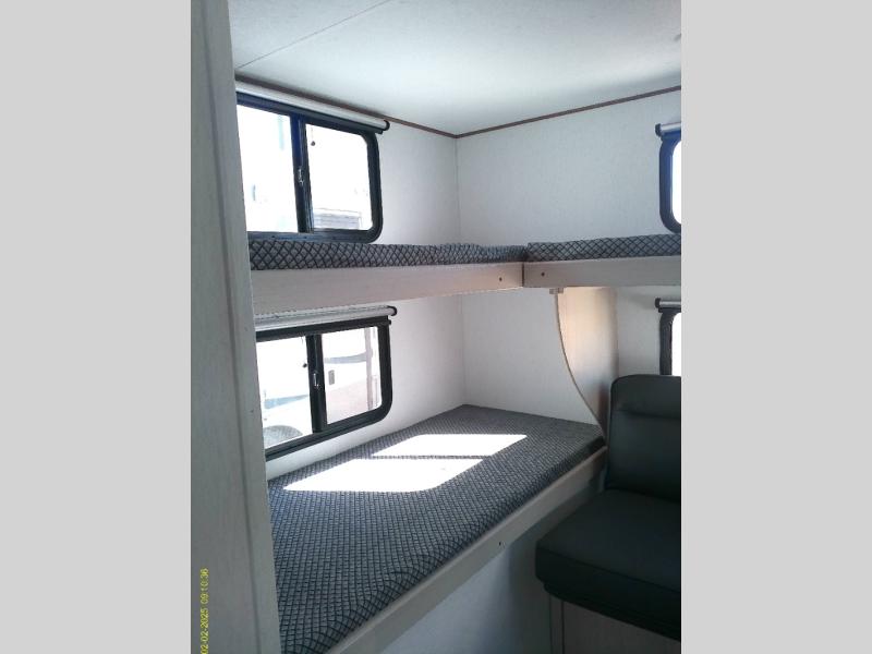 Are you looking for a travel trailer with more interior space and a larger sleeping capacity? This Apex Ultra-Lite trailer may just be the one you've been looking for! Your guests can claim the rear bunkhouse with triple bunks, a sofa, and an entertainment center, while you can take the queen bed in the front private bedroom. Everyone can meet in the middle living area and kitchen that includes a sofa and U-shaped dinette, all the kitchen amenities to cook meals, plus a flat screen TV for movie nights. The full bath with a 36" x 24" tub will make bath time easy for the kids or if you need to give the dog a bath! And don't overlook the exterior with its outside kitchen and power awning with an LED light!