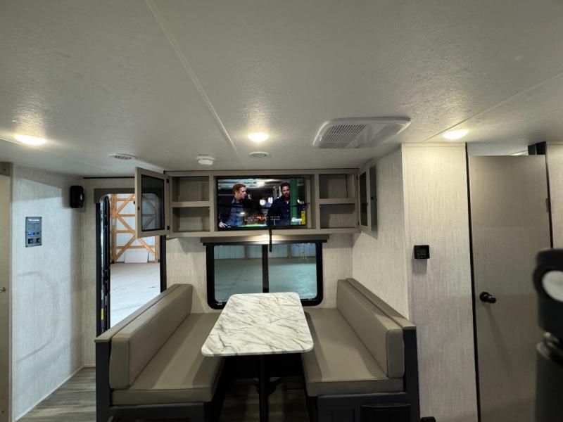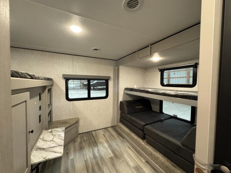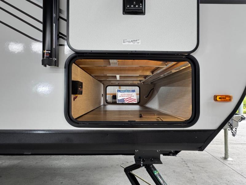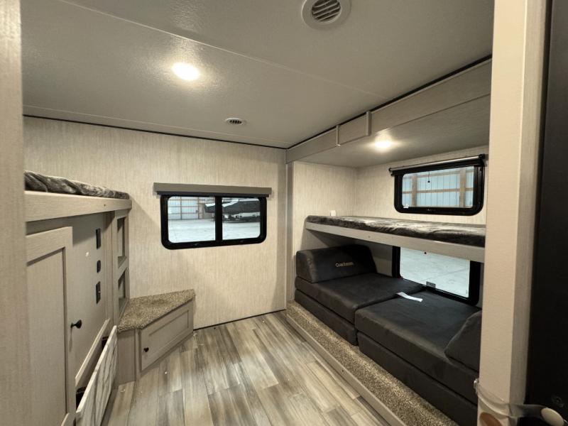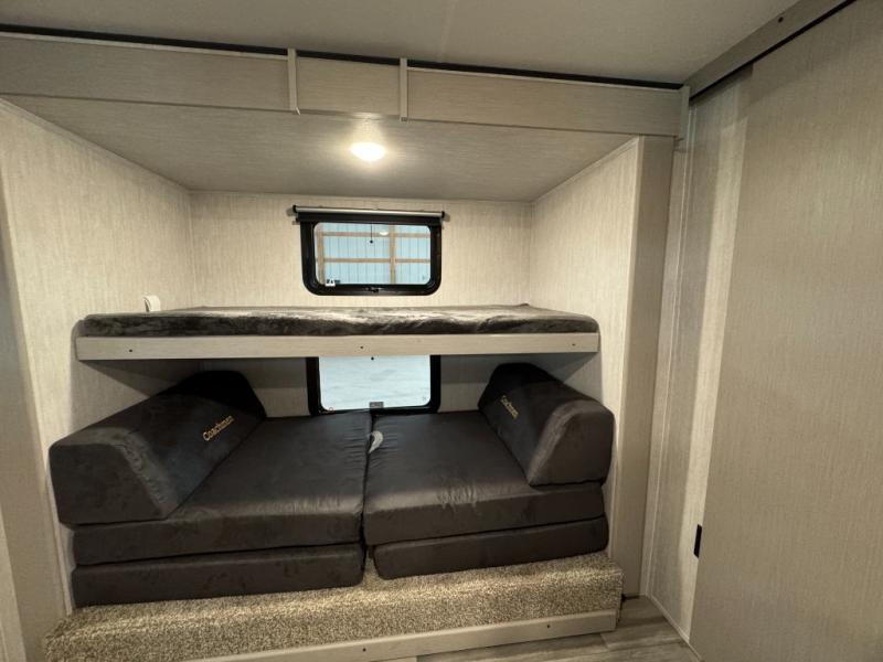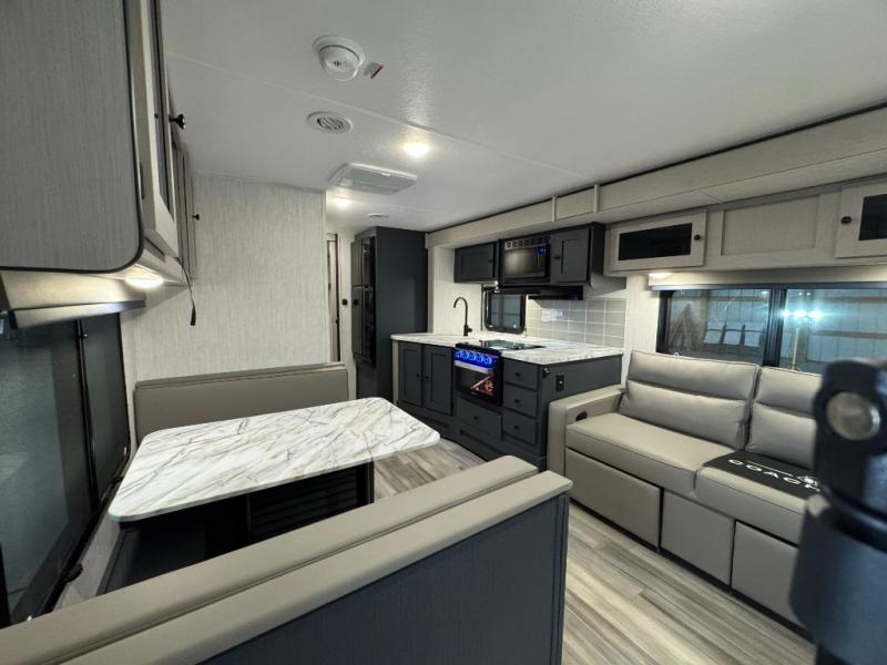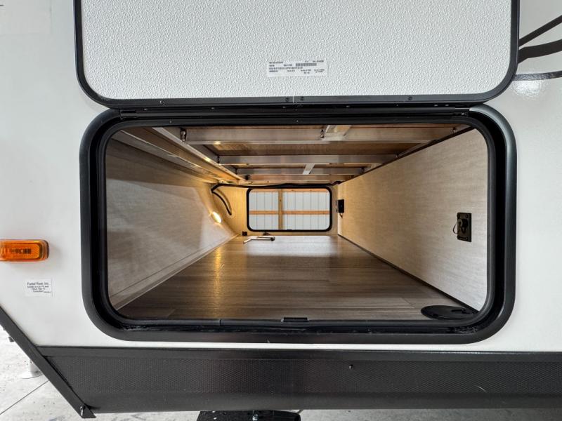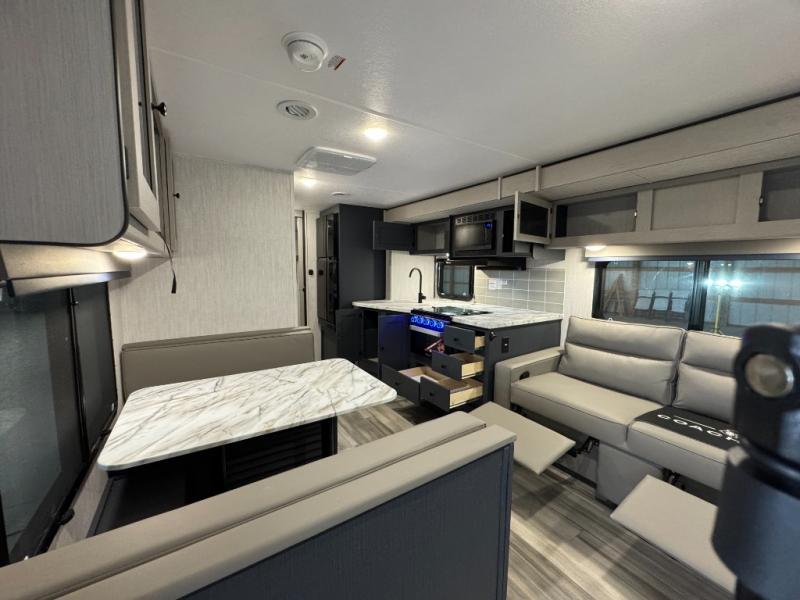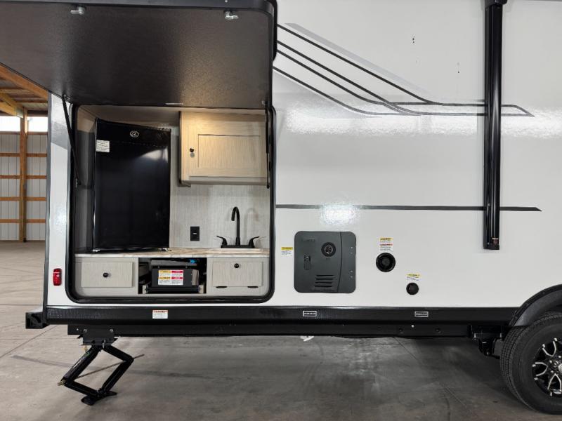 Double slides, a bunkhouse, plus a private bedroom and sleeping for nine make this model ready for anything! There is a private bunkhouse with a slide out futon and an overhead bunk, plus a second bunk for the kids to enjoy. Up front, a queen bed with super storage will provide two a comfortable night's rest in a private bedroom, and any other guests can sleep on the booth dinette and sofa in the main living area. The chef can cook indoors, or outdoors on the outside kitchen, and since there is an 18' power awning with LED lights, you can enjoy a bit of outdoor living space as well!