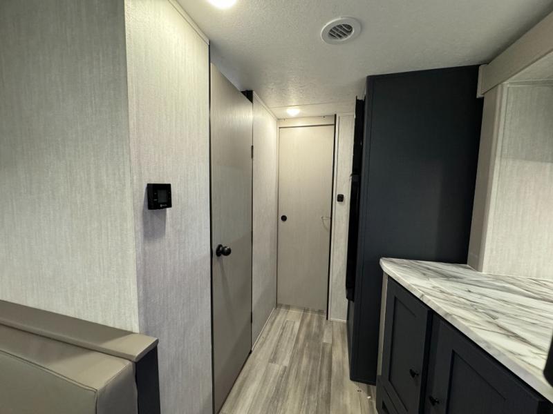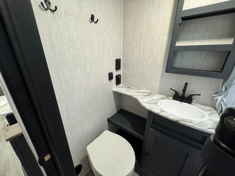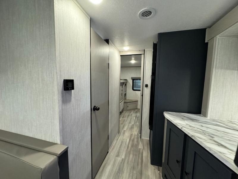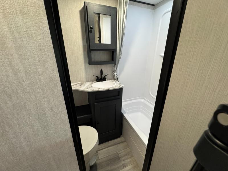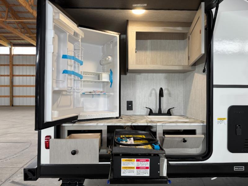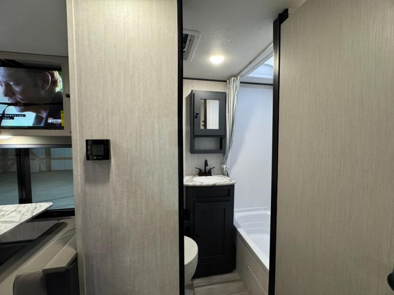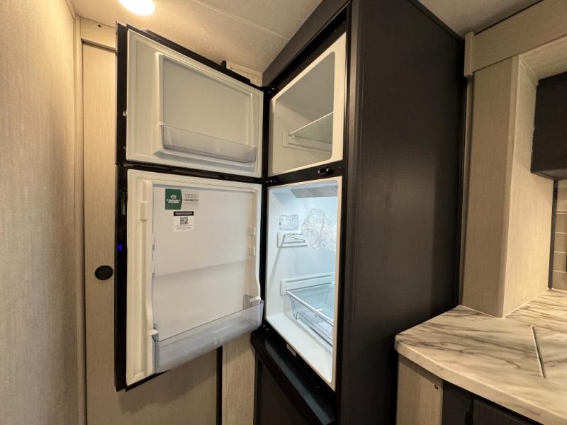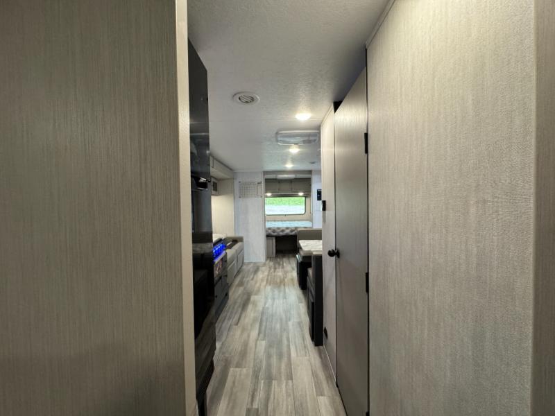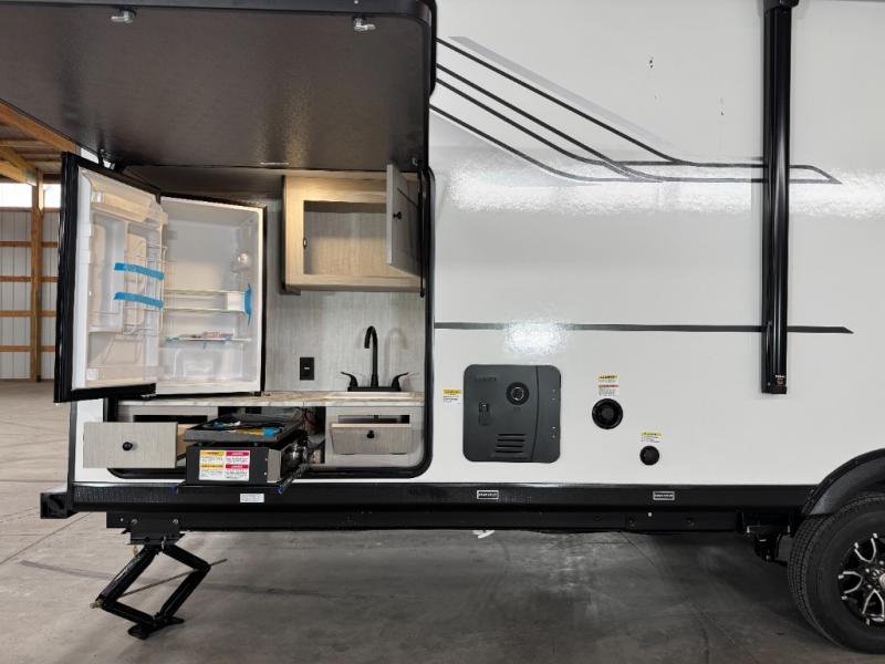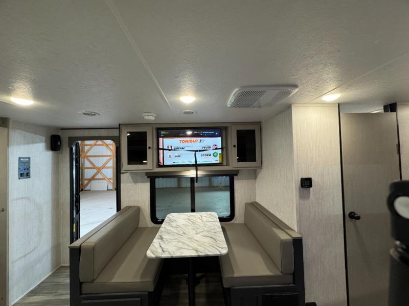 Double slides, a bunkhouse, plus a private bedroom and sleeping for nine make this model ready for anything! There is a private bunkhouse with a slide out futon and an overhead bunk, plus a second bunk for the kids to enjoy. Up front, a queen bed with super storage will provide two a comfortable night's rest in a private bedroom, and any other guests can sleep on the booth dinette and sofa in the main living area. The chef can cook indoors, or outdoors on the outside kitchen, and since there is an 18' power awning with LED lights, you can enjoy a bit of outdoor living space as well!
