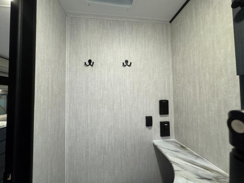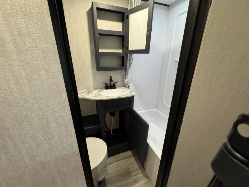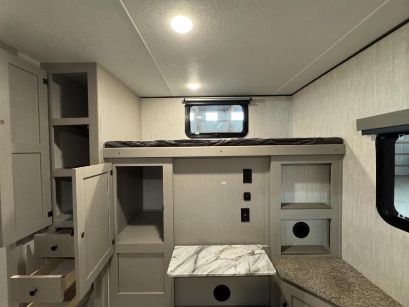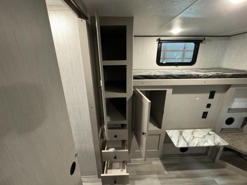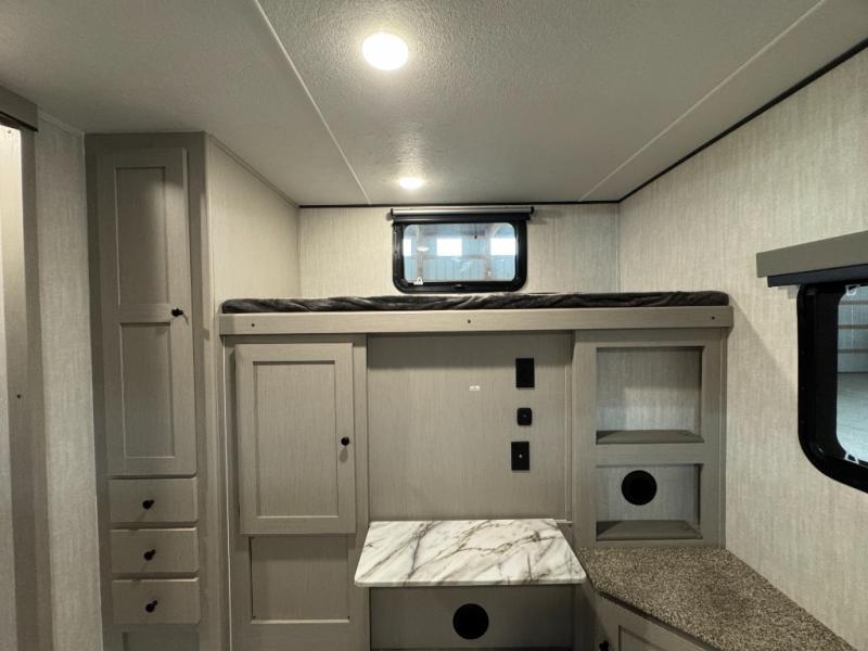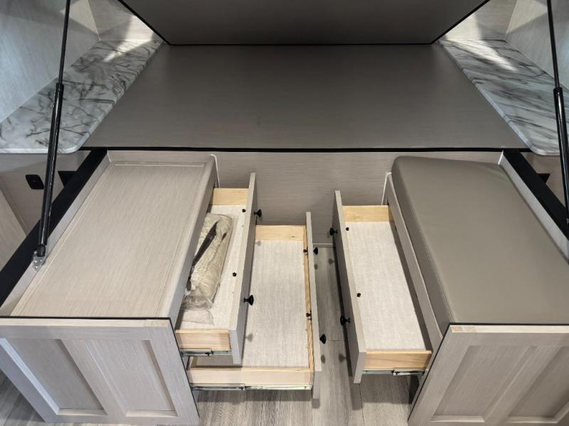 What I liked most: Kitchen counter has a large amount of space. Entertainment Center has lots of storage. Dining booth has one storage cabinet. Kitchen area has plenty of storage. Bunkhouse has plenty of storage with 2 large cabinets, 1 small cabinet and 3 drawers.