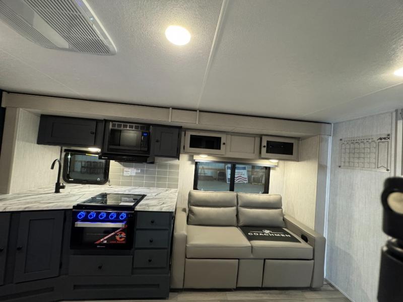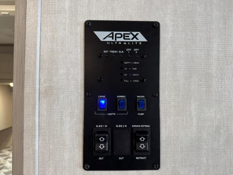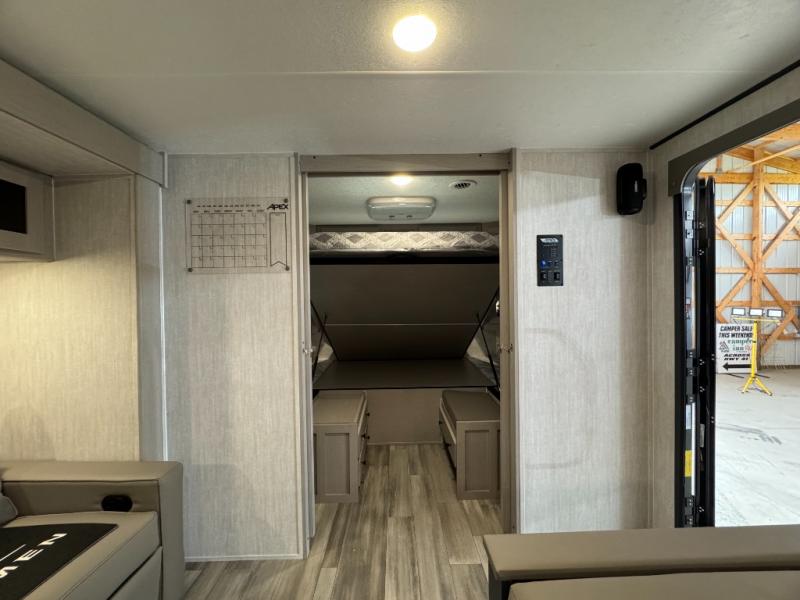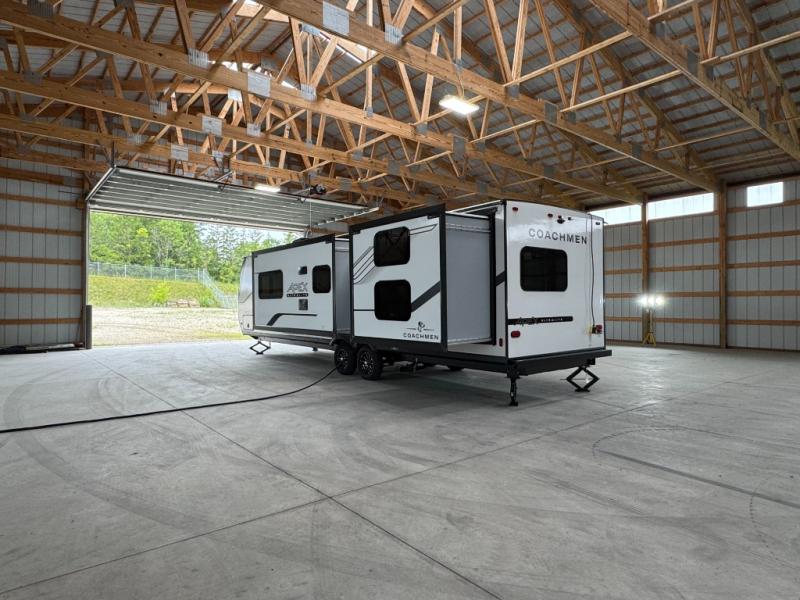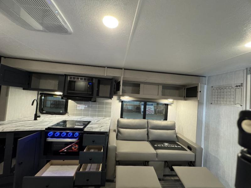 Lightweight living and camping is found with the Apex Ultra-Lite travel trailers by Coachmen. These eco-friendly units are made to last thanks to the Azdel composite sidewalls, the laminated aluminum floor, and the vacuum-bonded laminated crowned roof. Easy lube axles make towing easier than ever, plus there is a friction hinge entrance door, a 200-watt solar panel with a 30 Amp control charger, and slam latch baggage door catches for easy unloading. Some of the interior comforts you'll fall in love with are the one-piece seamless edge countertops, the hard valances with night shades, the matte black hardware, and the Casino Bisque cabinetry. The Apex Ultra-Lite trailers also include a USB charge station, plus a digital TV antenna with cable hook-ups and Wi-Fi capability for the option to stay connected as you camp!