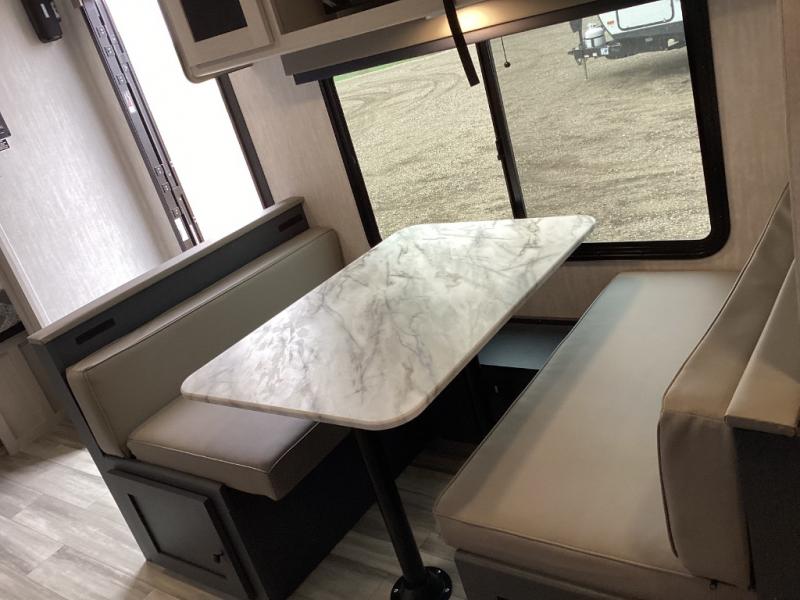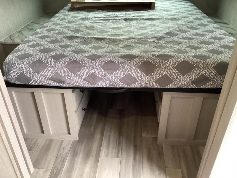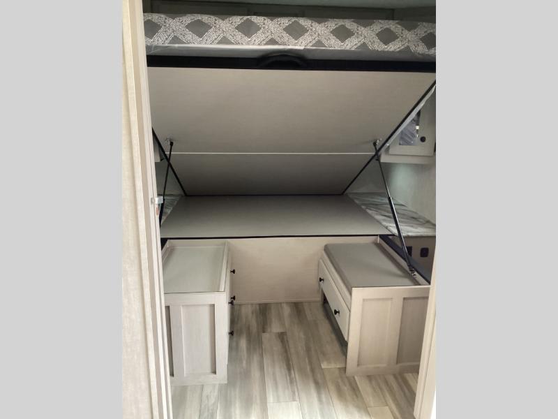 What I liked most: Kitchen counter has a large amount of space. Entertainment Center has lots of storage. Dining booth has one storage cabinet. Kitchen area has plenty of storage. Bunkhouse has plenty of storage with 2 large cabinets, 1 small cabinet and 3 drawers.