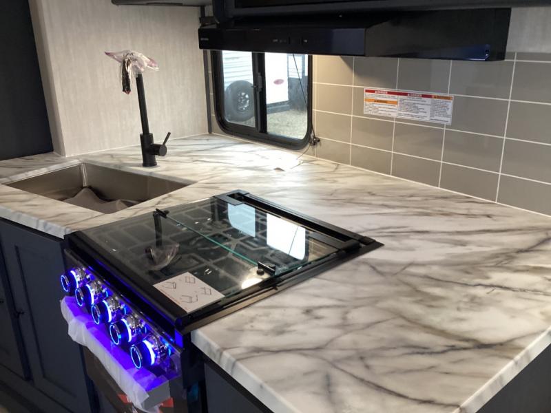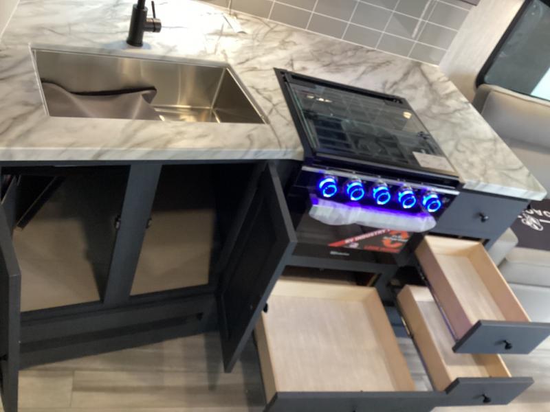 Indoor galley setup includes seamless counters, deep sink, microwave, cooktop, and spacious fridge. Outside, a full kitchen with griddle, sink, and mini-fridge means campsite cooking made easy. -
