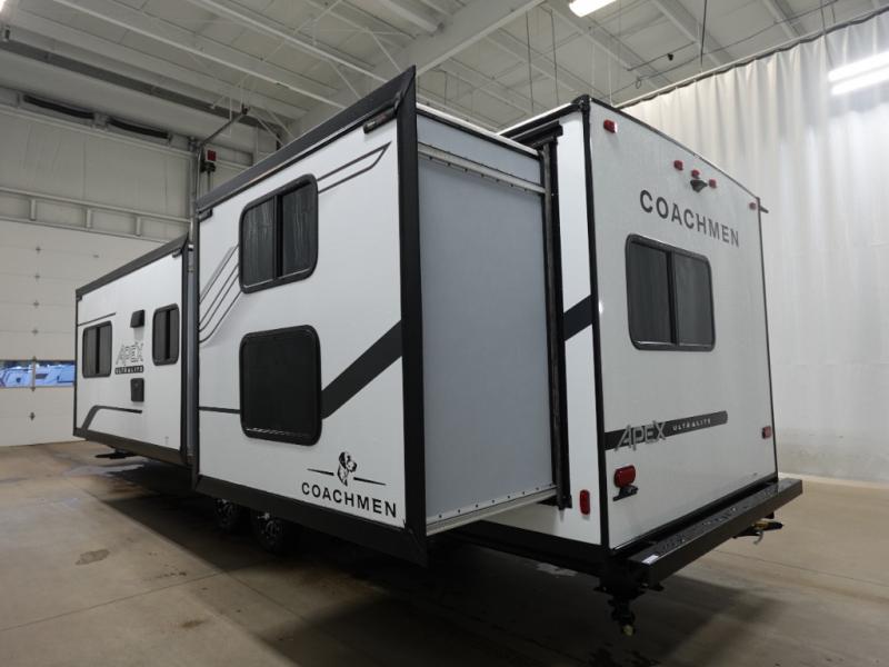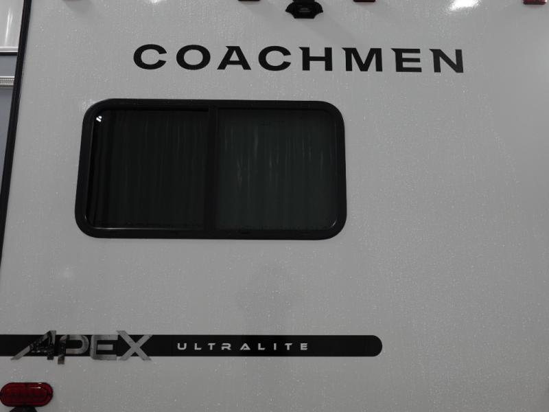 Lightweight living and camping is found with the Apex Ultra-Lite travel trailers by Coachmen. These eco-friendly units are made to last thanks to the Azdel composite sidewalls, the laminated aluminum floor, and the vacuum-bonded laminated trussed roof. Super lube axles make towing easier than ever, plus there is a friction hinge entrance door, a 200-watt solar panel with a 30 Amp control charger, and slam latch baggage door catches for easy unloading. Some of the interior comforts you'll fall in love with are the one-piece seamless edge countertops, the hard valances with roller shades, the matte black hardware, and the Casino Bisque cabinetry. The Apex Ultra-Lite trailers also include a USB charge station, plus a digital TV antenna with cable hook-ups and Wi-Fi capability for the option to stay connected as you camp!
