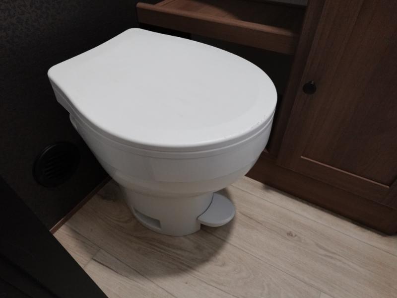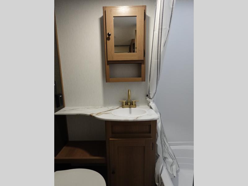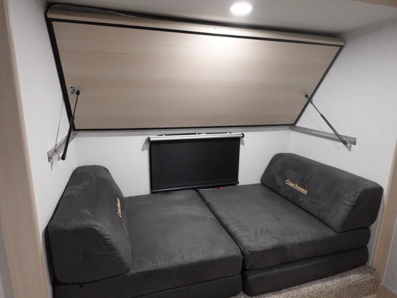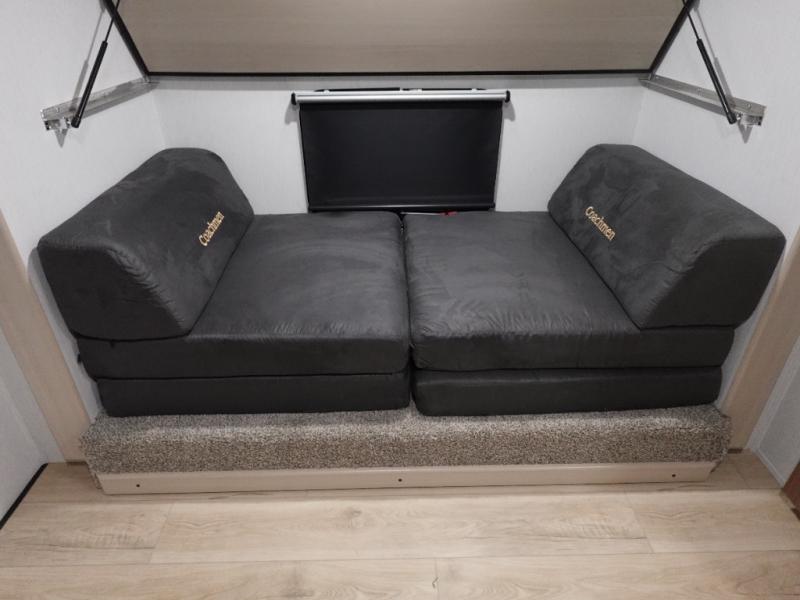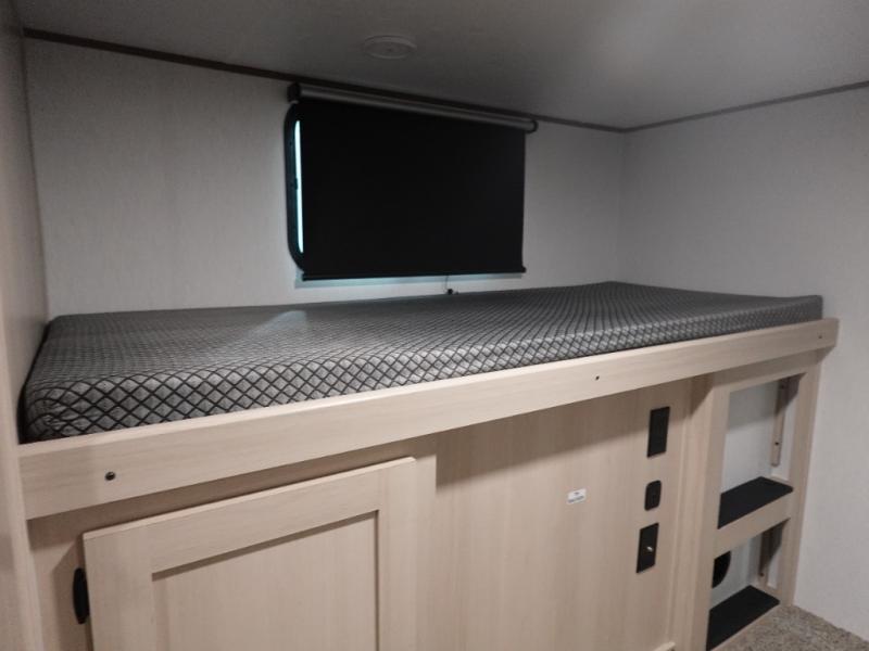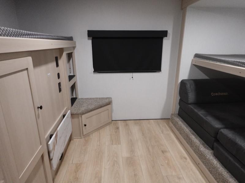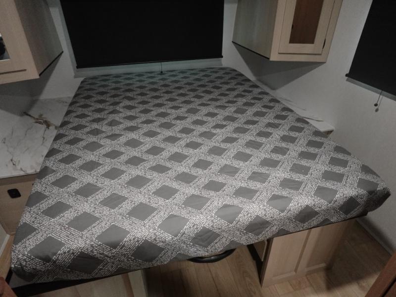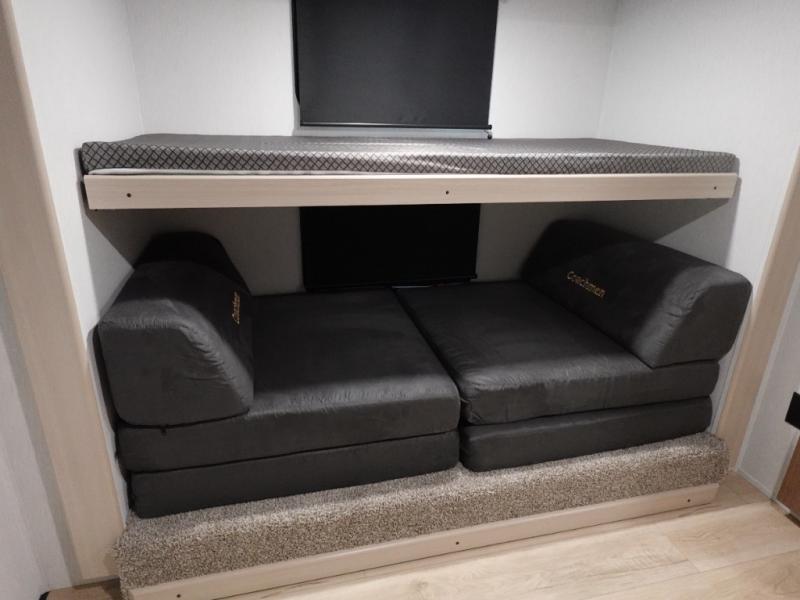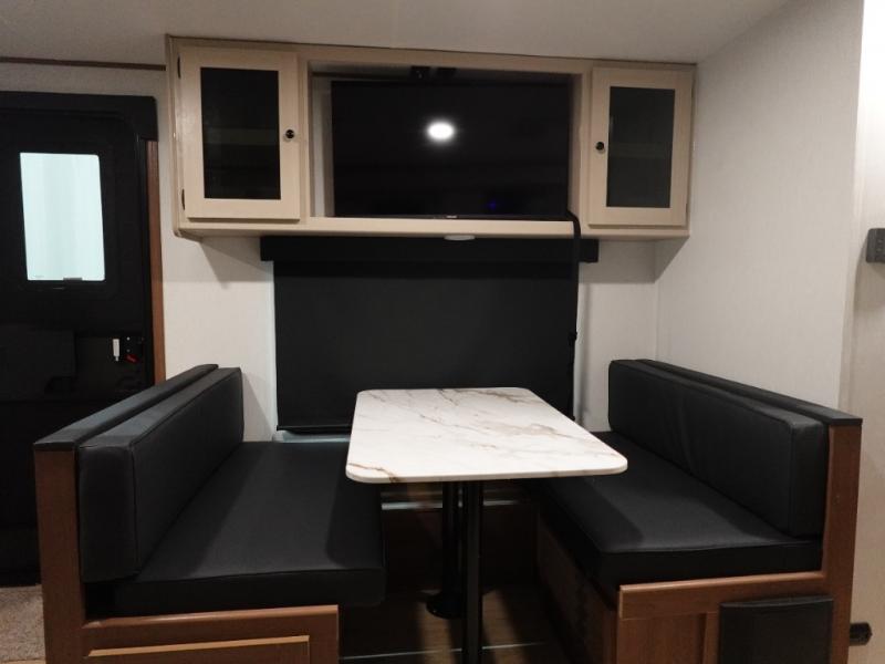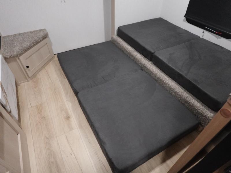 What I liked most: Kitchen counter has a large amount of space. Entertainment Center has lots of storage. Dining booth has one storage cabinet. Kitchen area has plenty of storage. Bunkhouse has plenty of storage with 2 large cabinets, 1 small cabinet and 3 drawers.