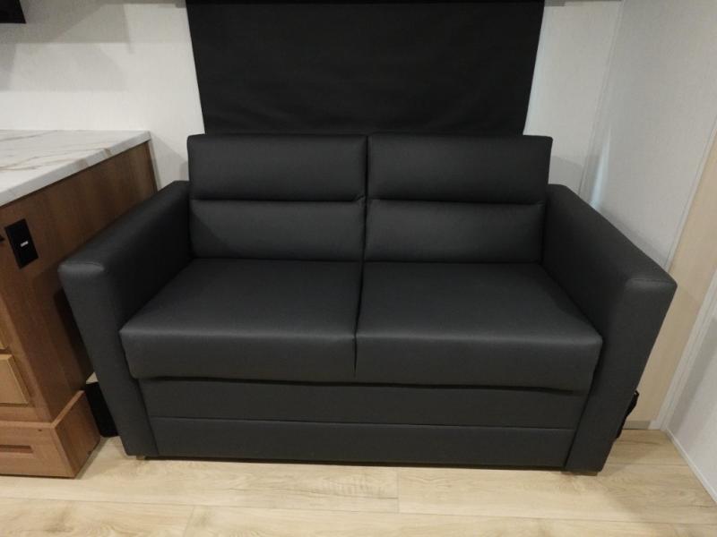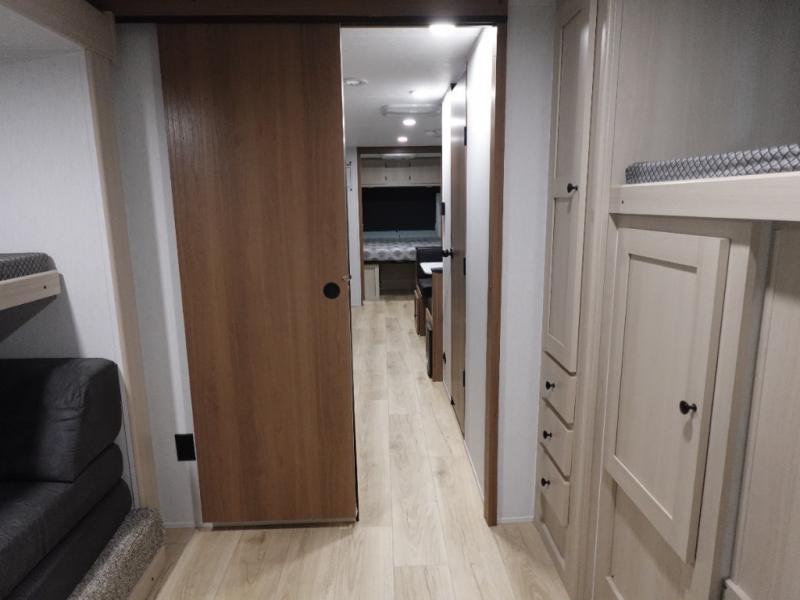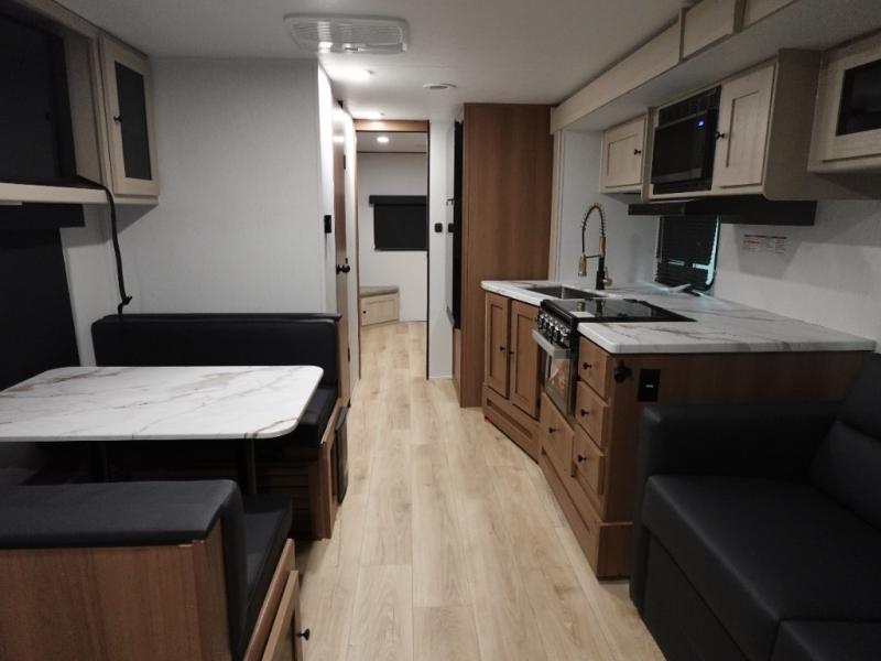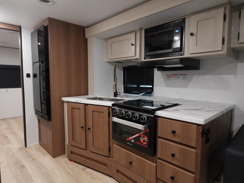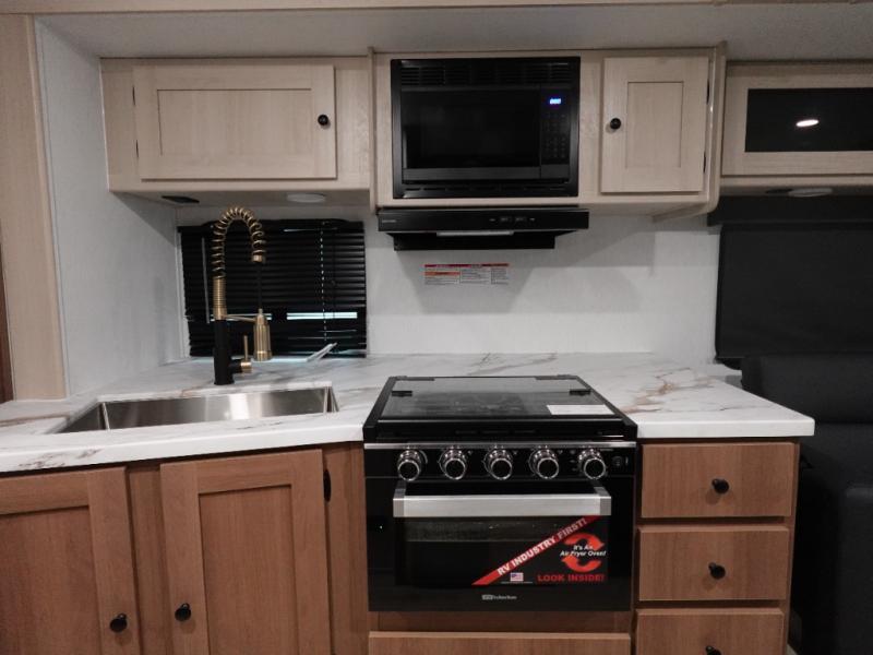 Double slides, a bunkhouse, plus a private bedroom and sleeping for nine make this model ready for anything! There is a private bunkhouse with a slide out futon and an overhead bunk, plus a second bunk for the kids to enjoy. Up front, a queen bed with super storage will provide two a comfortable night's rest in a private bedroom, and any other guests can sleep on the booth dinette and sofa in the main living area. The chef can cook indoors, or outdoors on the outside kitchen, and since there is an 18' power awning with LED lights, you can enjoy a bit of outdoor living space as well!
