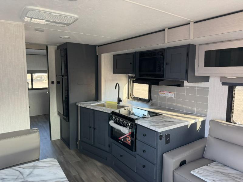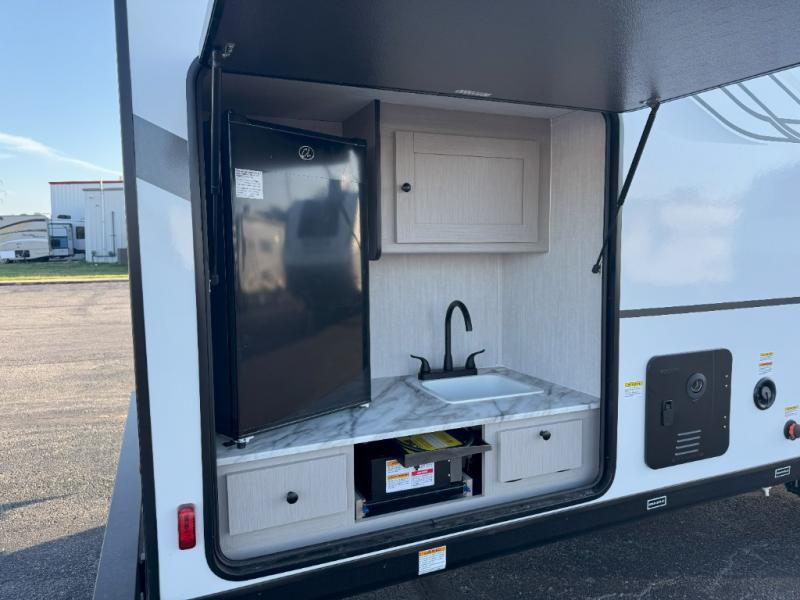 Double slides, a bunkhouse, plus a private bedroom and sleeping for nine make this model ready for anything! There is a private bunkhouse with a slide out futon and an overhead bunk, plus a second bunk for the kids to enjoy. Up front, a queen bed with super storage will provide two a comfortable night's rest in a private bedroom, and any other guests can sleep on the booth dinette and sofa in the main living area. The chef can cook indoors, or outdoors on the outside kitchen, and since there is an 18' power awning with LED lights, you can enjoy a bit of outdoor living space as well!