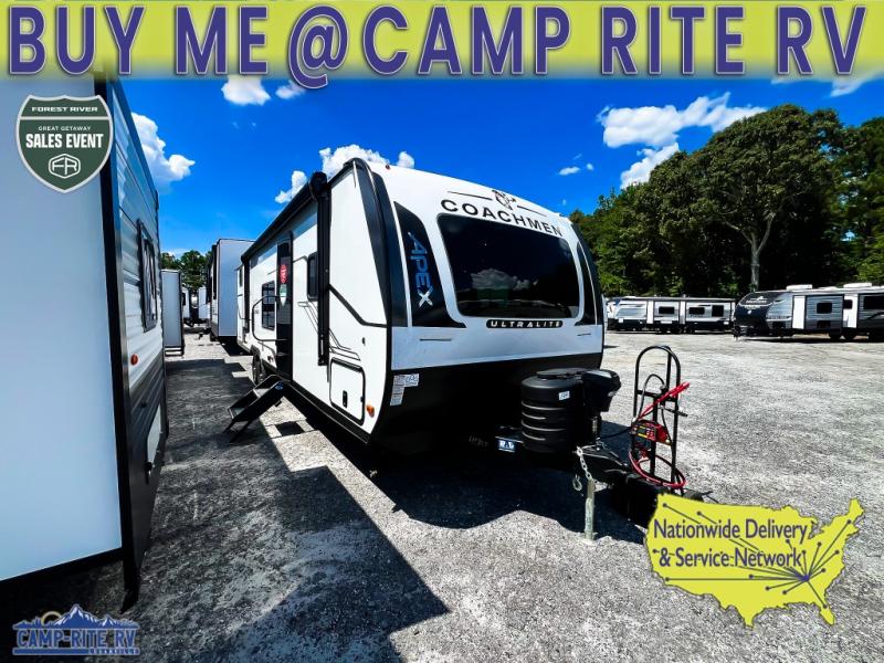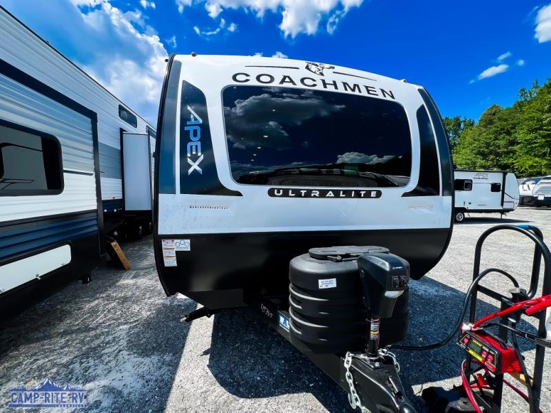 Lightweight living and camping is found with the Apex Ultra-Lite travel trailers by Coachmen. These eco-friendly units are made to last thanks to the Azdel composite sidewalls, the laminated aluminum floor, and the vacuum-bonded laminated crowned roof. Easy lube axles make towing easier than ever, plus there is a friction hinge entrance door, a 200-watt solar panel with a 30 Amp control charger, and slam latch baggage door catches for easy unloading. Some of the interior comforts you'll fall in love with are the one-piece seamless edge countertops, the hard valances with night shades, the matte black hardware, and the Casino Bisque cabinetry. The Apex Ultra-Lite trailers also include a USB charge station, plus a digital TV antenna with cable hook-ups and Wi-Fi capability for the option to stay connected as you camp!