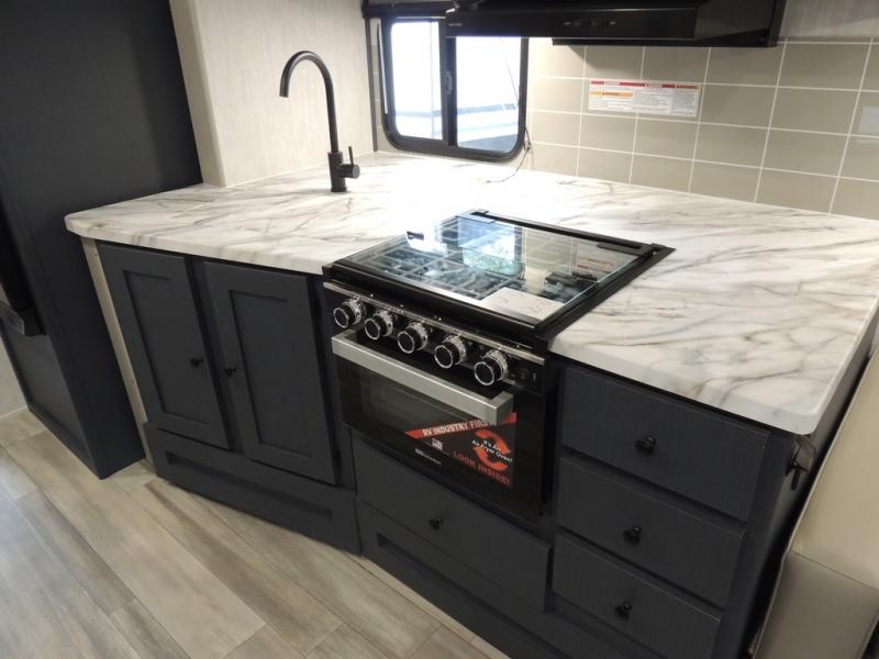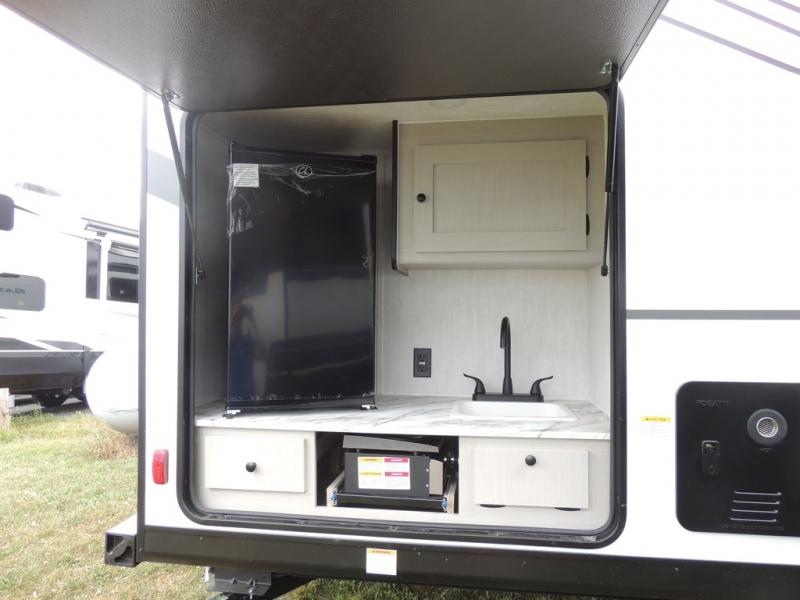 Double slides, a bunkhouse, plus a private bedroom and sleeping for nine make this model ready for anything! There is a private bunkhouse with a slide out futon and an overhead bunk, plus a second bunk for the kids to enjoy. Up front, a queen bed with super storage will provide two a comfortable night's rest in a private bedroom, and any other guests can sleep on the booth dinette and sofa in the main living area. The chef can cook indoors, or outdoors on the outside kitchen, and since there is an 18' power awning with LED lights, you can enjoy a bit of outdoor living space as well!
