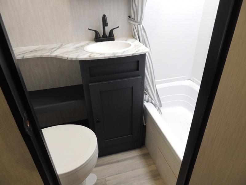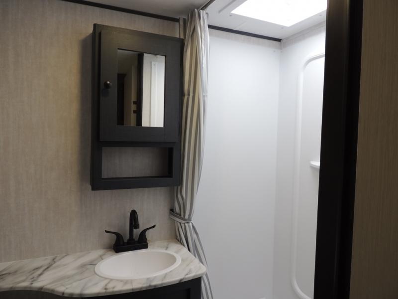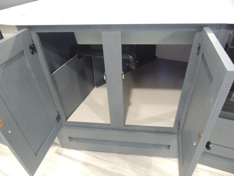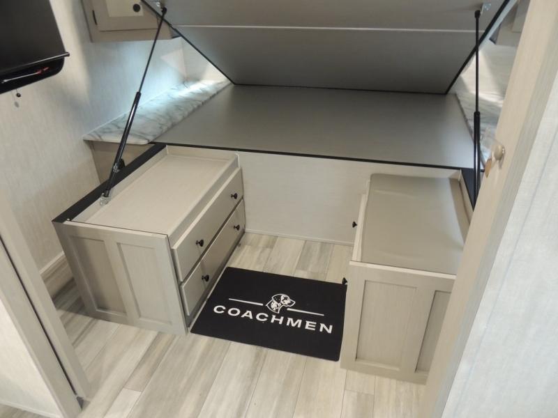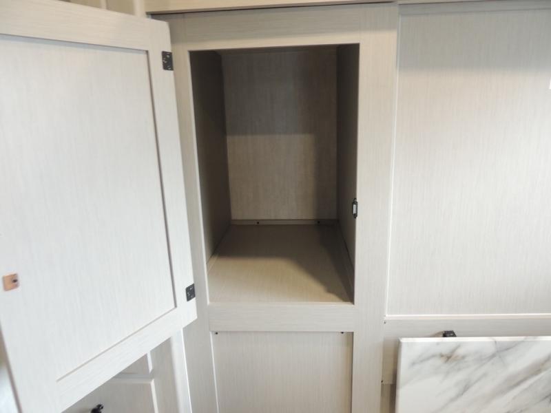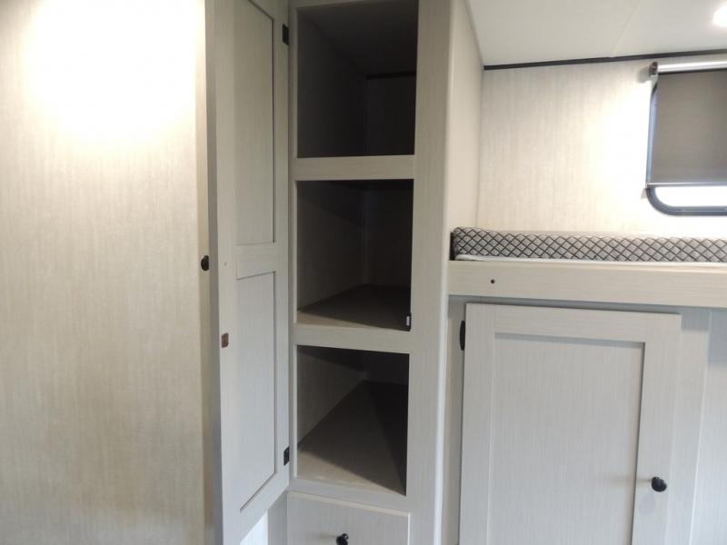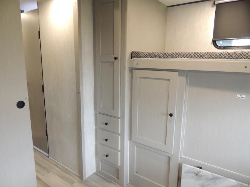 What I liked most: Kitchen counter has a large amount of space. Entertainment Center has lots of storage. Dining booth has one storage cabinet. Kitchen area has plenty of storage. Bunkhouse has plenty of storage with 2 large cabinets, 1 small cabinet and 3 drawers.