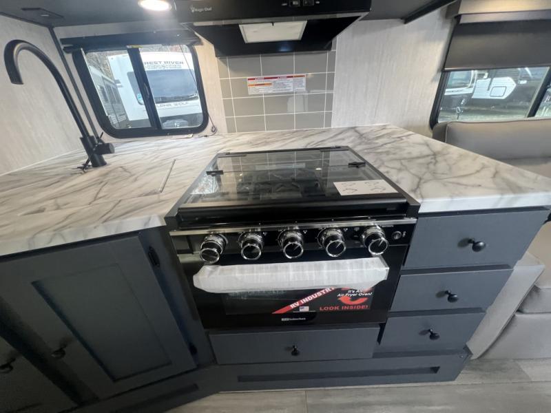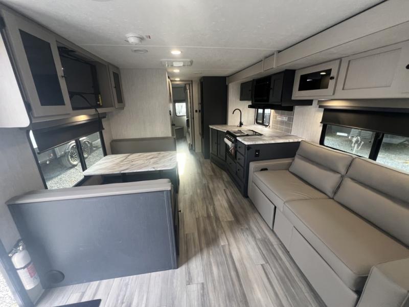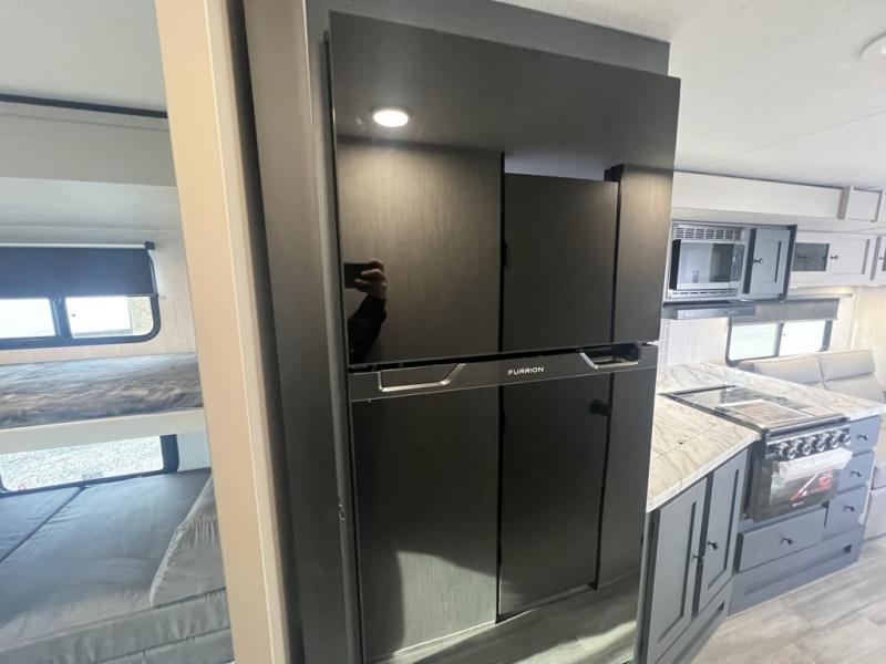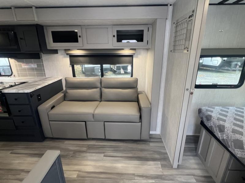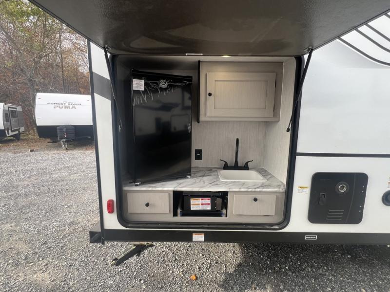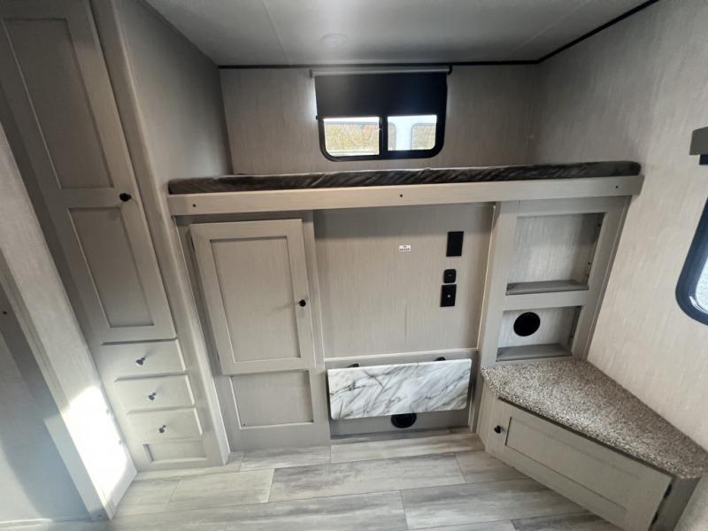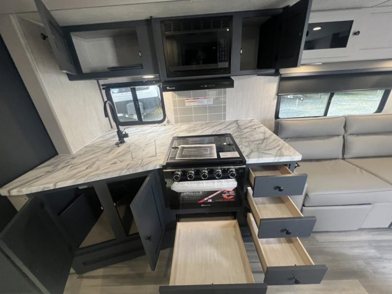 Double slides, a bunkhouse, plus a private bedroom and sleeping for nine make this model ready for anything! There is a private bunkhouse with a slide out futon and an overhead bunk, plus a second bunk for the kids to enjoy. Up front, a queen bed with super storage will provide two a comfortable night's rest in a private bedroom, and any other guests can sleep on the booth dinette and sofa in the main living area. The chef can cook indoors, or outdoors on the outside kitchen, and since there is an 18' power awning with LED lights, you can enjoy a bit of outdoor living space as well!