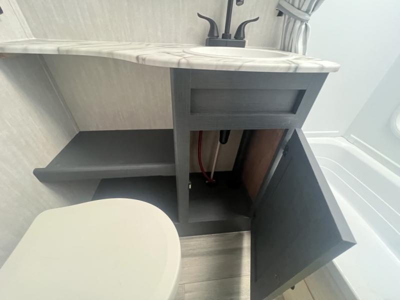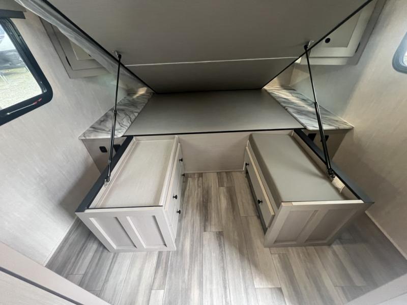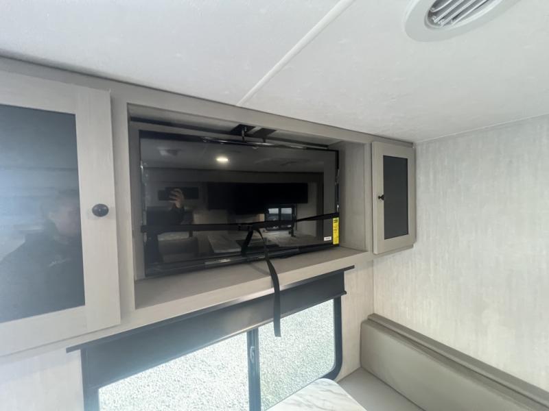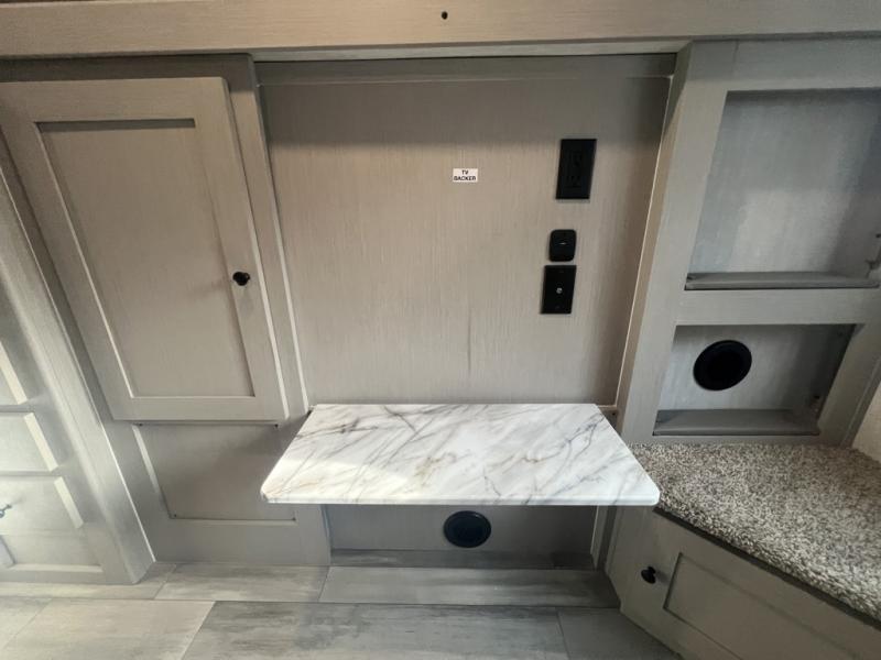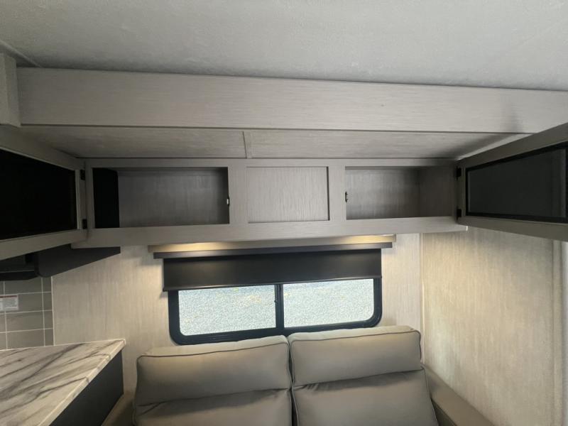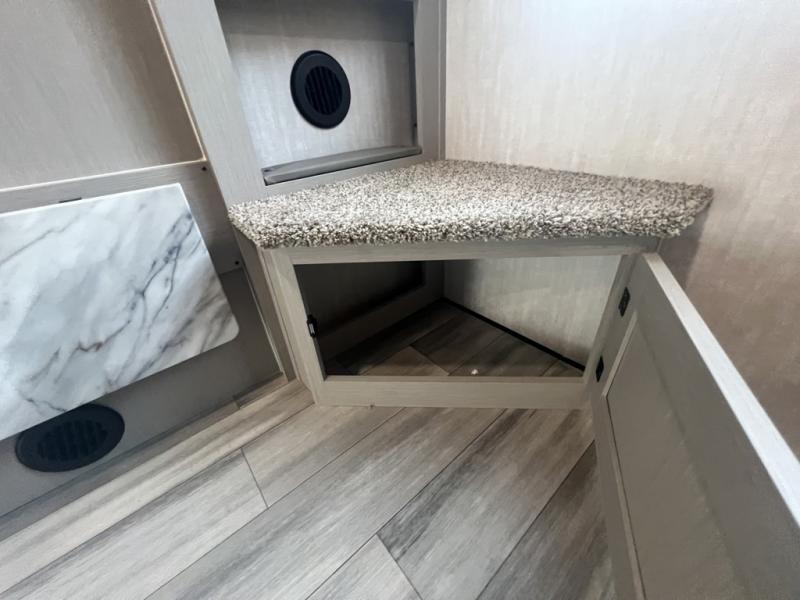 What I liked most: Kitchen counter has a large amount of space. Entertainment Center has lots of storage. Dining booth has one storage cabinet. Kitchen area has plenty of storage. Bunkhouse has plenty of storage with 2 large cabinets, 1 small cabinet and 3 drawers.