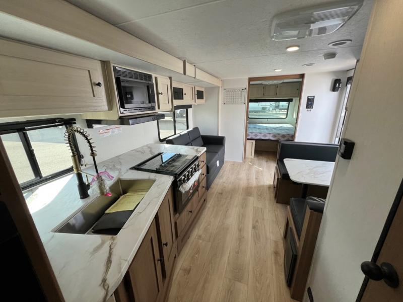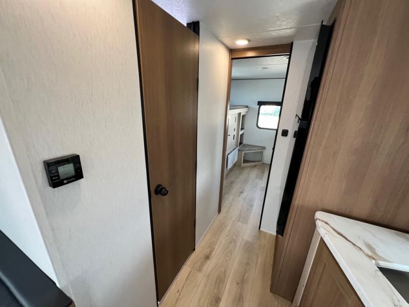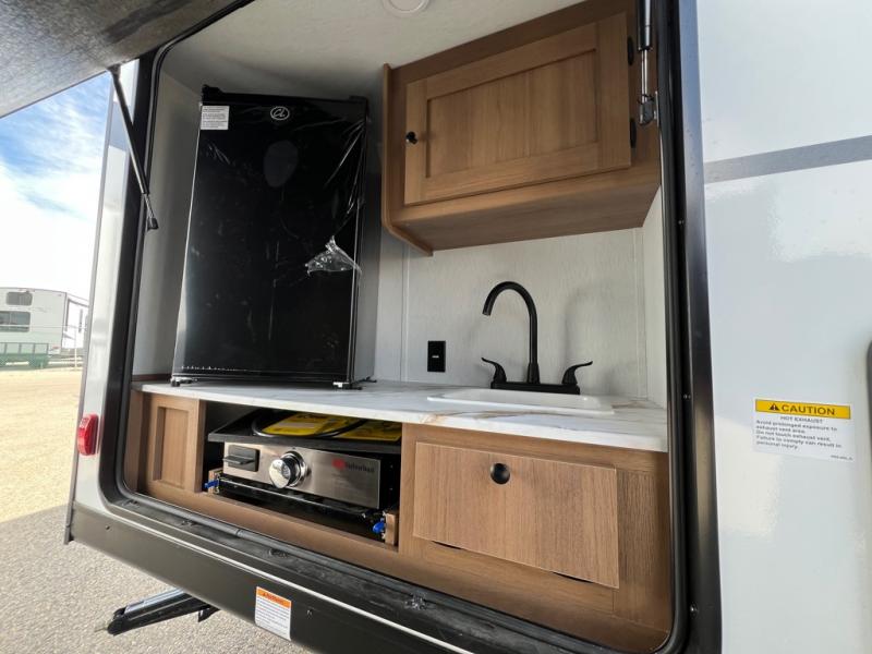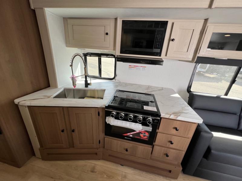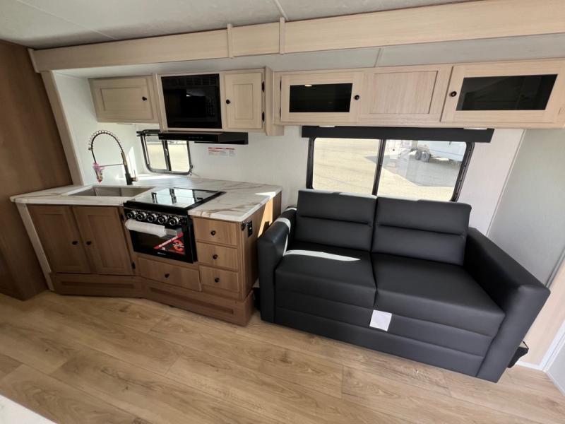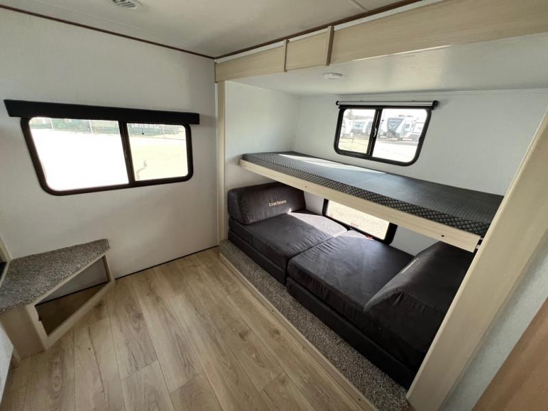 Double slides, a bunkhouse, plus a private bedroom and sleeping for nine make this model ready for anything! There is a private bunkhouse with a slide out futon and an overhead bunk, plus a second bunk for the kids to enjoy. Up front, a queen bed with super storage will provide two a comfortable night's rest in a private bedroom, and any other guests can sleep on the booth dinette and sofa in the main living area. The chef can cook indoors, or outdoors on the outside kitchen, and since there is an 18' power awning with LED lights, you can enjoy a bit of outdoor living space as well!