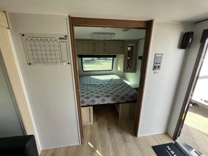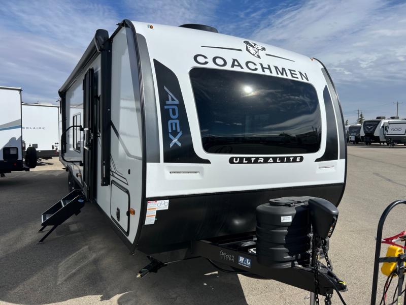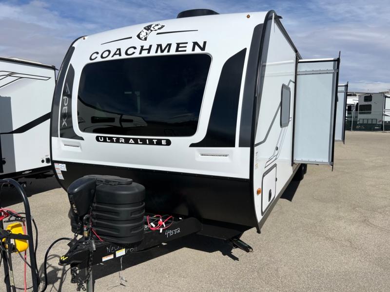 Lightweight living and camping is found with the Apex Ultra-Lite travel trailers by Coachmen. These eco-friendly units are made to last thanks to the Azdel composite sidewalls, the laminated aluminum floor, and the vacuum-bonded laminated trussed roof. Super lube axles make towing easier than ever, plus there is a friction hinge entrance door, a 200-watt solar panel with a 30 Amp control charger, and slam latch baggage door catches for easy unloading. Some of the interior comforts you'll fall in love with are the one-piece seamless edge countertops, the hard valances with roller shades, the matte black hardware, and the Casino Bisque cabinetry. The Apex Ultra-Lite trailers also include a USB charge station, plus a digital TV antenna with cable hook-ups and Wi-Fi capability for the option to stay connected as you camp!