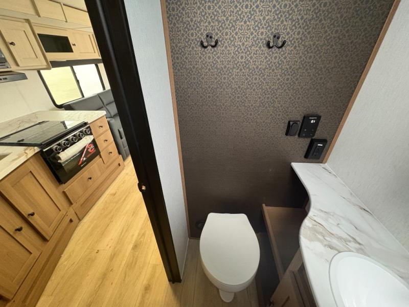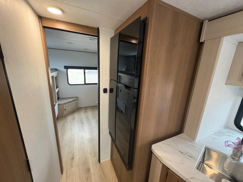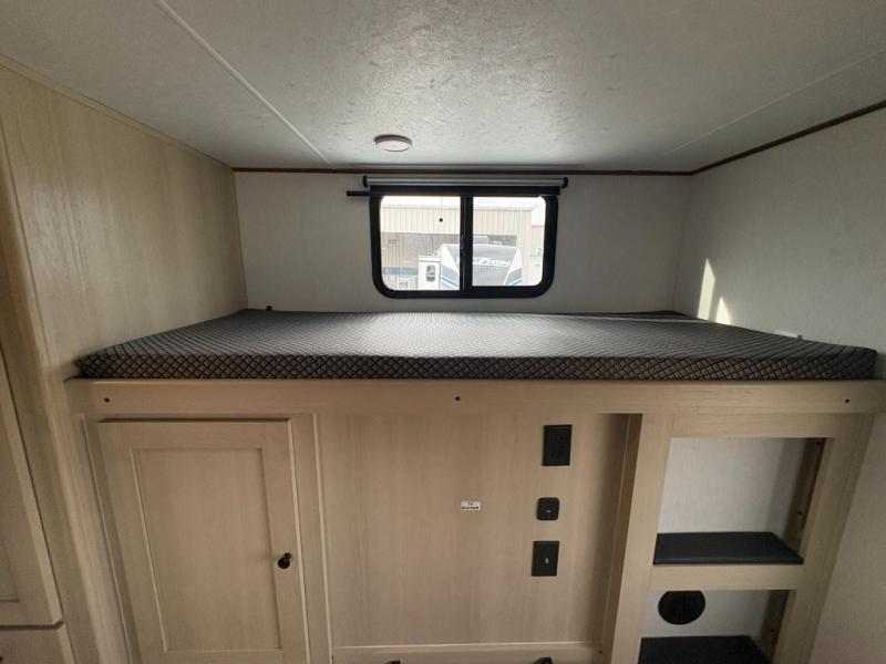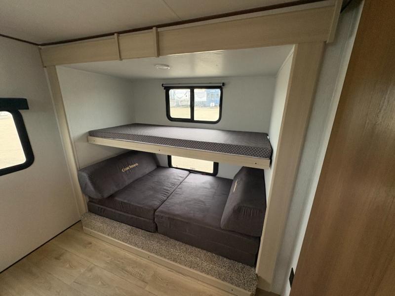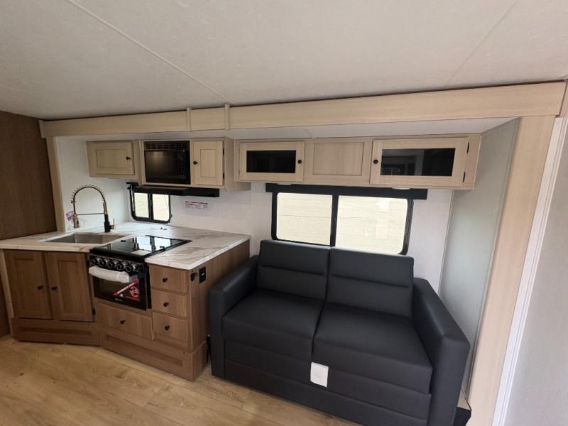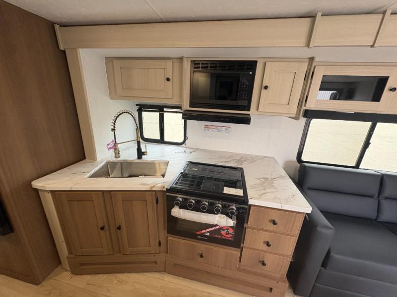 Double slides, a bunkhouse, plus a private bedroom and sleeping for nine make this model ready for anything! There is a private bunkhouse with a slide out futon and an overhead bunk, plus a second bunk for the kids to enjoy. Up front, a queen bed with super storage will provide two a comfortable night's rest in a private bedroom, and any other guests can sleep on the booth dinette and sofa in the main living area. The chef can cook indoors, or outdoors on the outside kitchen, and since there is an 18' power awning with LED lights, you can enjoy a bit of outdoor living space as well!