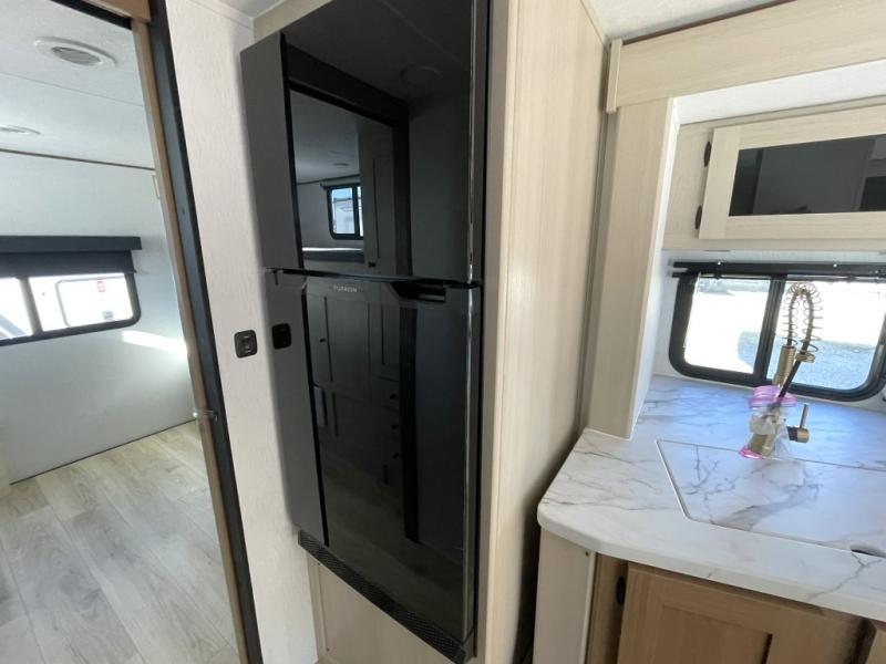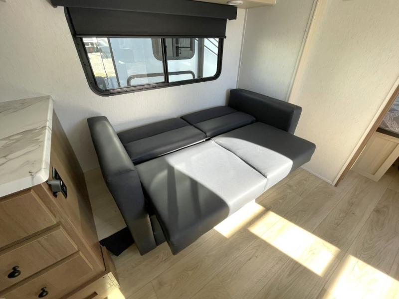 Inside, you'll appreciate high-end finishes like Casino Bisque cabinetry, matte black hardware, roller shades, and seamless edge countertops. It’s a travel trailer that balances rugged construction with residential comfort.
