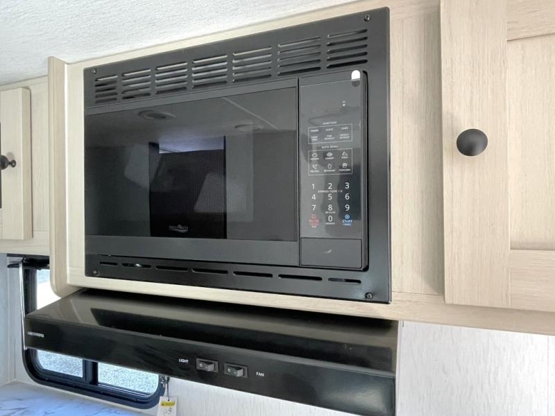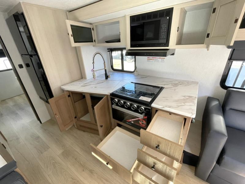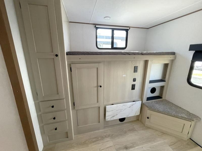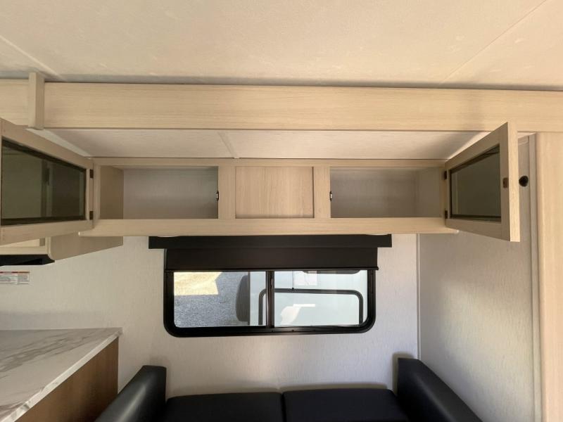 What I liked most: Kitchen counter has a large amount of space. Entertainment Center has lots of storage. Dining booth has one storage cabinet. Kitchen area has plenty of storage. Bunkhouse has plenty of storage with 2 large cabinets, 1 small cabinet and 3 drawers.