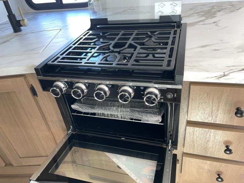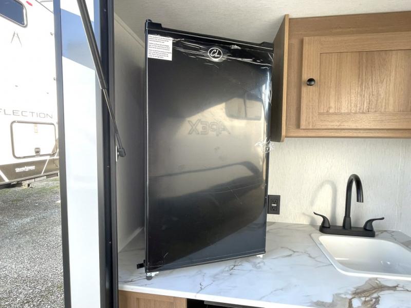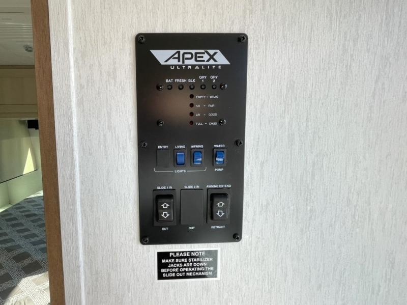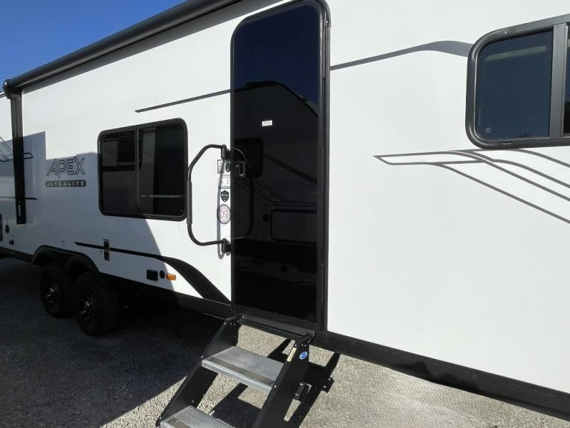The Apex Ultra-Lite is built with eco-friendly Azdel sidewalls, vacuum-bonded construction, and laminated aluminum floors, making it strong, lightweight, and more resistant to moisture and rot. A 200-watt solar panel with a 30 Amp controller helps you stay off-grid longer, while features like USB charging stations, digital TV antenna, and Wi-Fi capability keep you connected on the road.