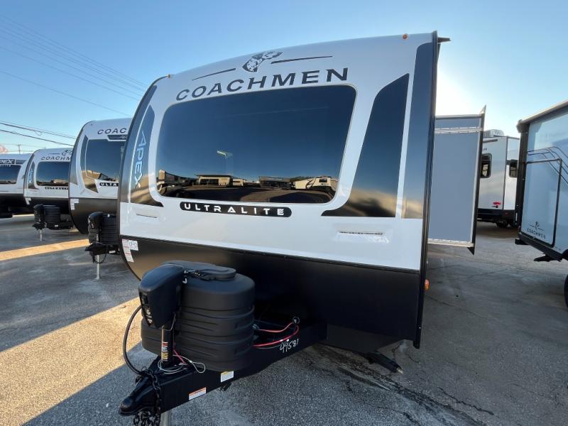 Lightweight living and camping is found with the Apex Ultra-Lite travel trailers by Coachmen. These eco-friendly units are made to last thanks to the Azdel composite sidewalls, the laminated aluminum floor, and the vacuum-bonded laminated trussed roof. Super lube axles make towing easier than ever, plus there is a friction hinge entrance door, a 200-watt solar panel with a 30 Amp control charger, and slam latch baggage door catches for easy unloading. Some of the interior comforts you'll fall in love with are the one-piece seamless edge countertops, the hard valances with roller shades, the matte black hardware, and the Casino Bisque cabinetry. The Apex Ultra-Lite trailers also include a USB charge station, plus a digital TV antenna with cable hook-ups and Wi-Fi capability for the option to stay connected as you camp!