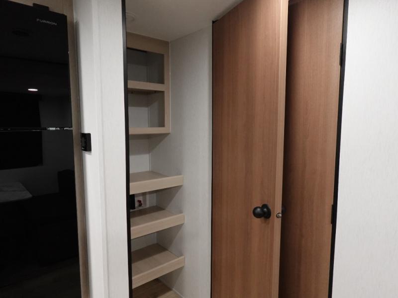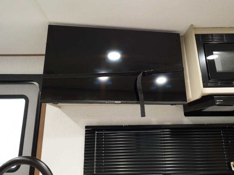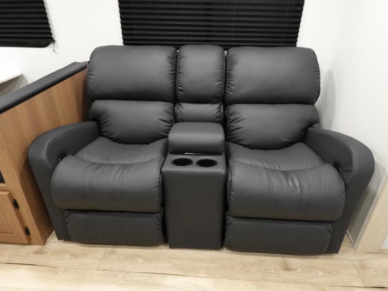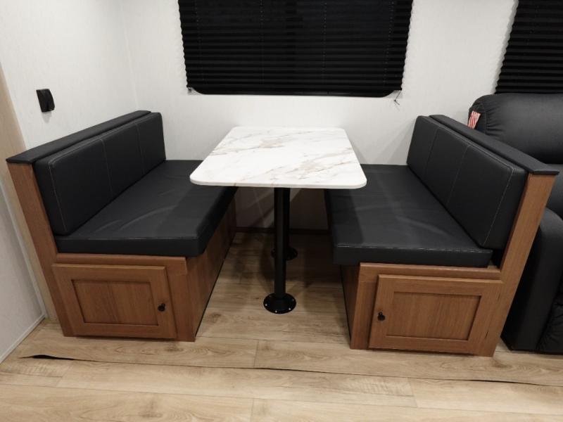 Answer the call of the wild with this travel trailer in tow! You will love having your own bedroom up front that includes a queen bed with storage below plus an overhead cabinet for books and more. A large slide out in the combined kitchen and living area houses the theater seats and booth dinette, and these pieces of furniture can double as sleeping space for guests as well. The chef of your group will appreciate the L-shaped kitchen counter with a large sink, a microwave and range plus a refrigerator and pantry for food storage. And the full rear bath will let you freshen up each day. There is a counter with a sink, toilet, and a radius shower/tub!