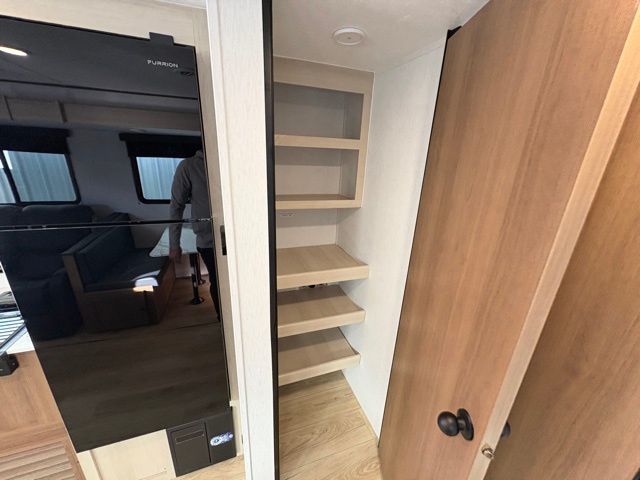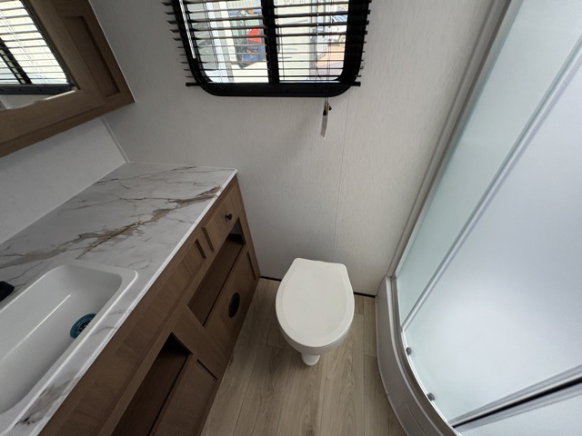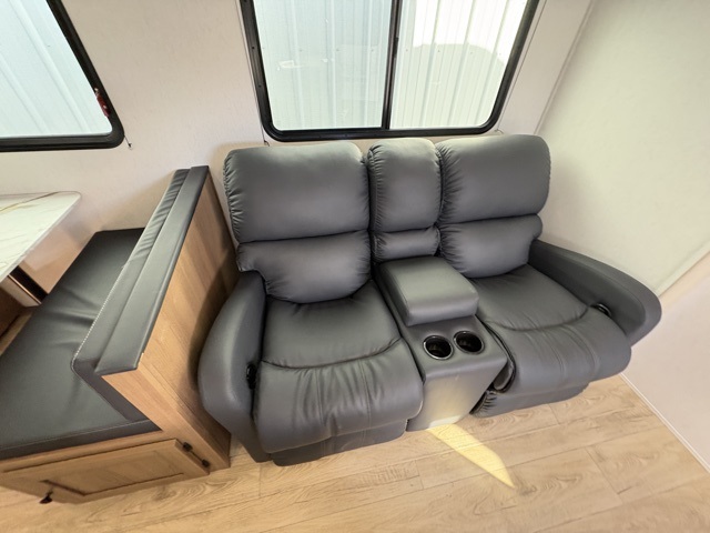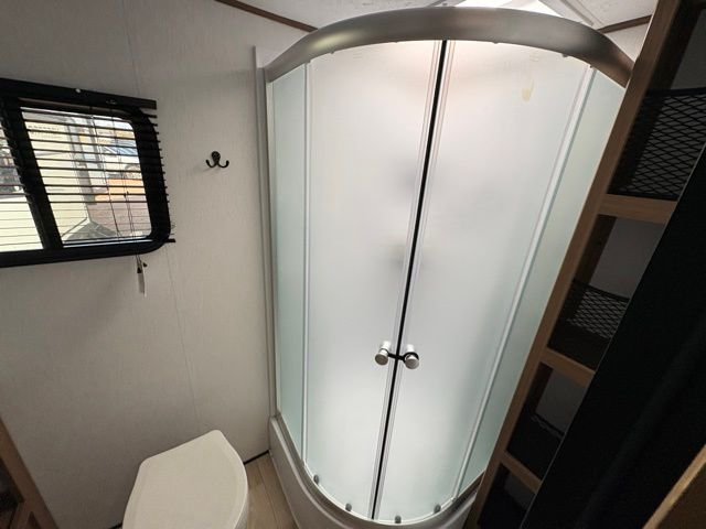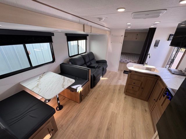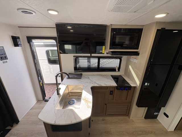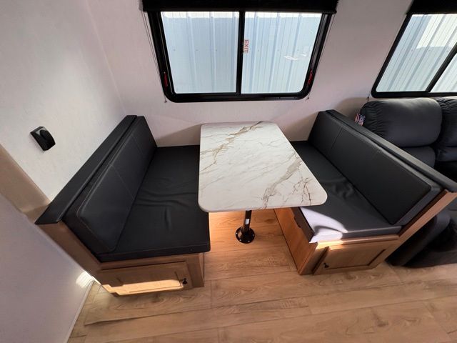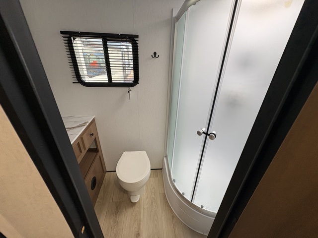 Answer the call of the wild with this travel trailer in tow! You will love having your own bedroom up front that includes a queen bed with storage below plus an overhead cabinet for books and more. A large slide out in the combined kitchen and living area houses the sofa and booth dinette, and these pieces of furniture can double as sleeping space for guests as well. The chef of your group will appreciate the L-shaped kitchen counter with a large sink, a microwave and range plus a refrigerator and pantry for food storage. And the full rear bath will let you freshen up each day. There is a counter with a sink, toilet, and a radius shower/tub!