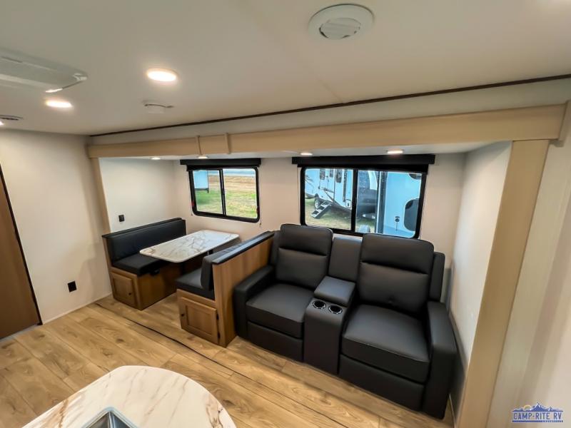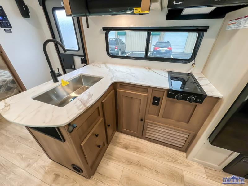 Answer the call of the wild with this travel trailer in tow! You will love having your own bedroom up front that includes a queen bed with storage below plus an overhead cabinet for books and more. A large slide out in the combined kitchen and living area houses the sofa and booth dinette, and these pieces of furniture can double as sleeping space for guests as well. The chef of your group will appreciate the L-shaped kitchen counter with a large sink, a microwave and range plus a refrigerator and pantry for food storage. And the full rear bath will let you freshen up each day. There is a counter with a sink, toilet, and a radius shower/tub!