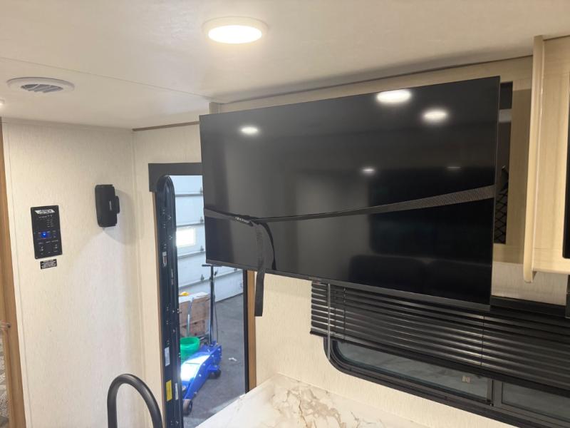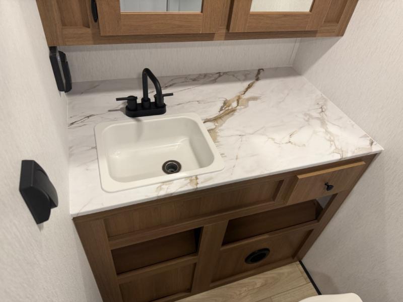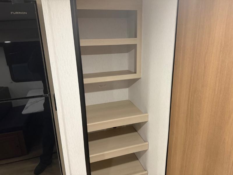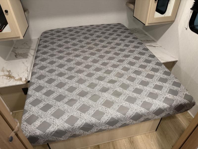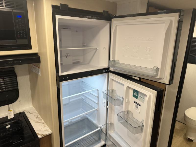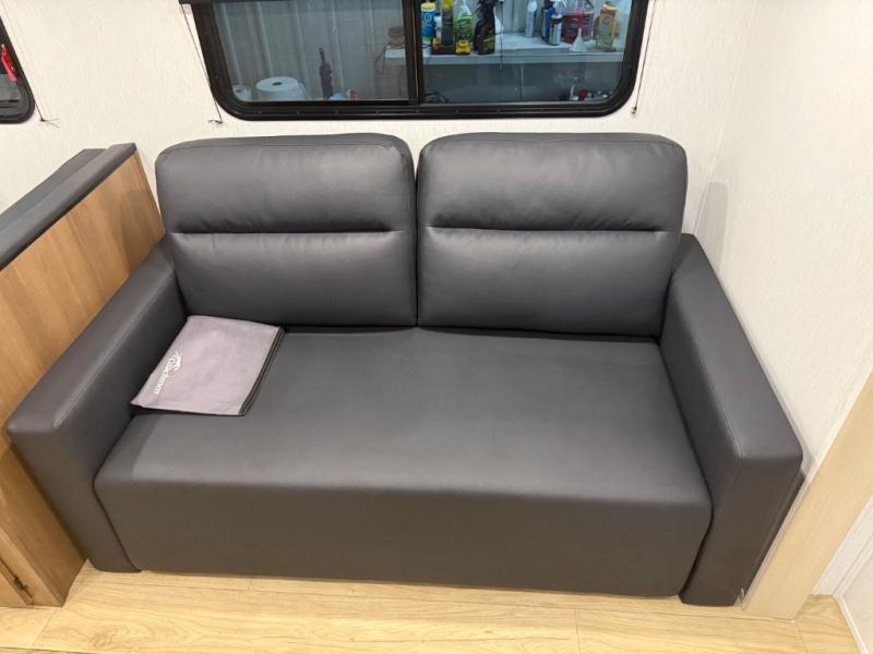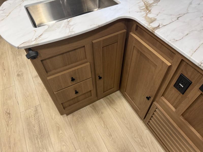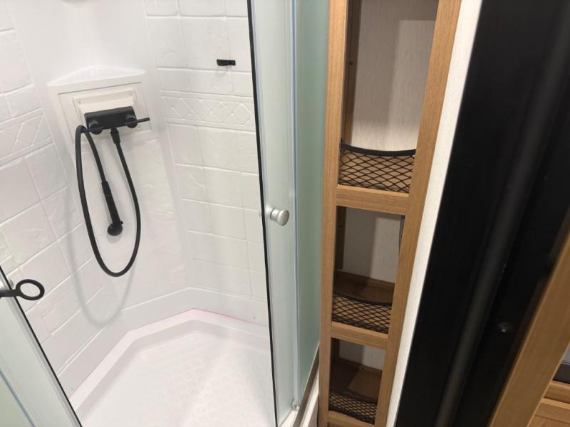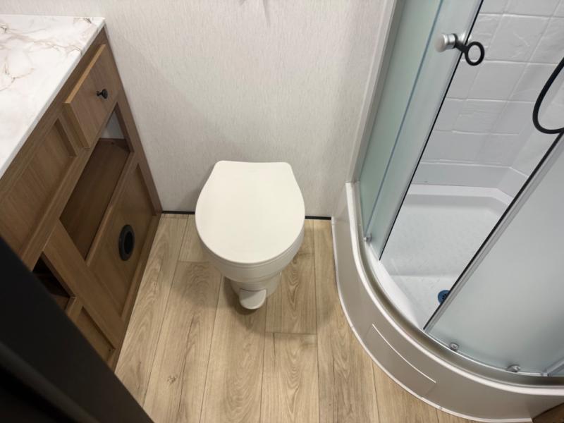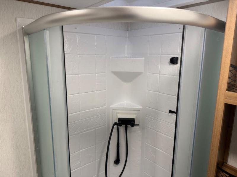 You will love having your own bedroom up front that includes a queen bed with storage below plus an overhead cabinet for books and more. A large slide out in the combined kitchen and living area houses the sofa and booth dinette, and these pieces of furniture can double as sleeping space for guests as well. The chef of your group will appreciate the L-shaped kitchen counter with a large sink, a microwave and range plus a refrigerator and pantry for food storage. And the full rear bath will let you freshen up each day. There is a counter with a sink, toilet, and a radius shower/tub!