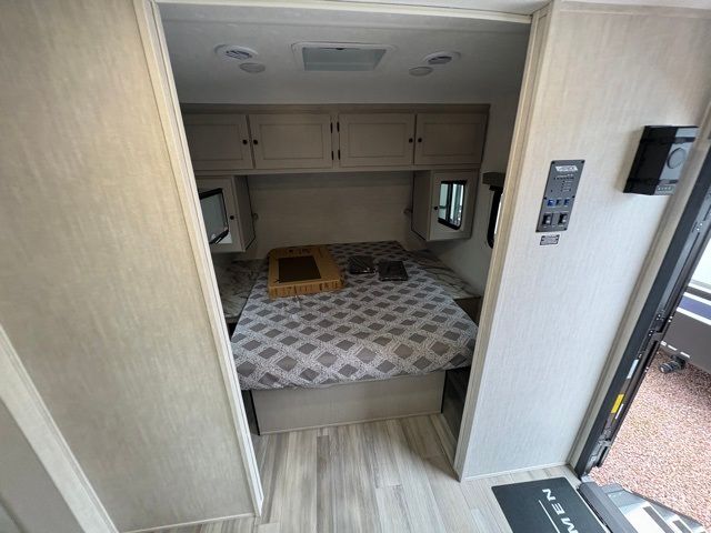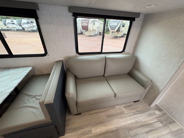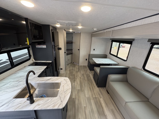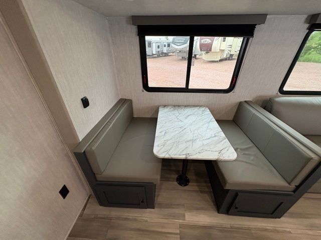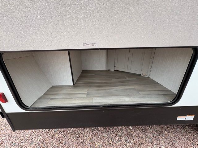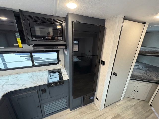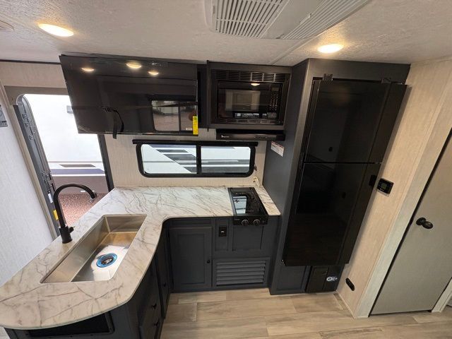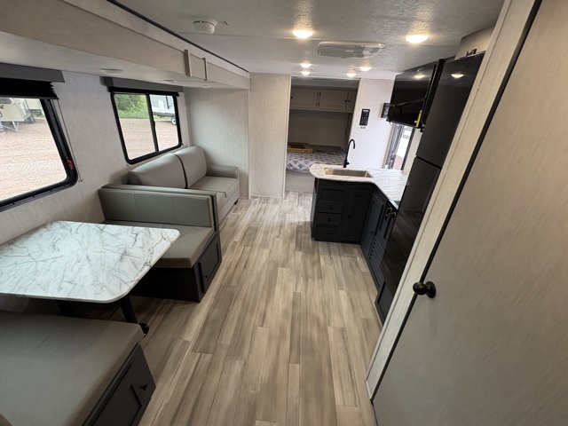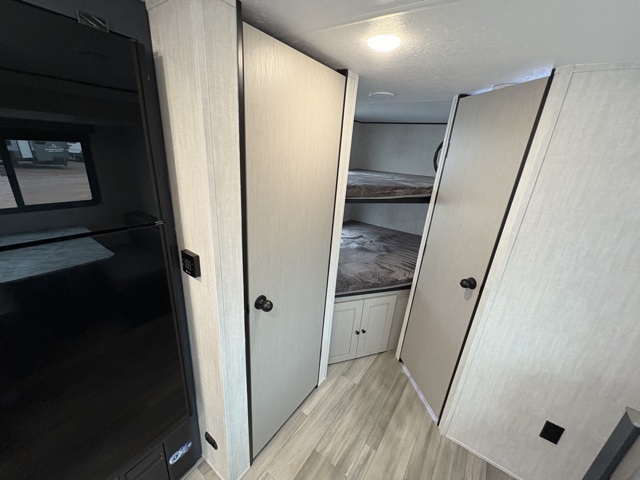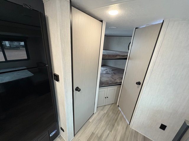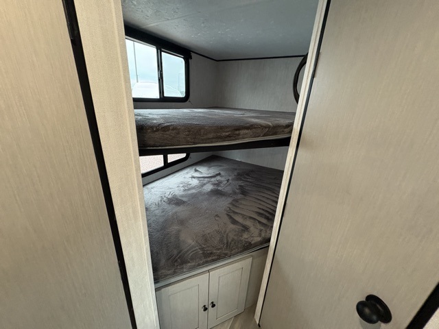 Make each camping trip count in this spacious travel trailer! You will love having your own bedroom up front that includes a queen bed with super storage below plus an overhead cabinet for books and more. A large slide out in the combined kitchen and living area houses the sofa and booth dinette, and these pieces of furniture can double as sleeping space for guests as well. The chef of your group will appreciate the L-shaped kitchen counter with a large sink, a microwave and range plus a refrigerator and pantry for food storage. This unit also includes 30" x 74" double-size bunks for your guests or kids!