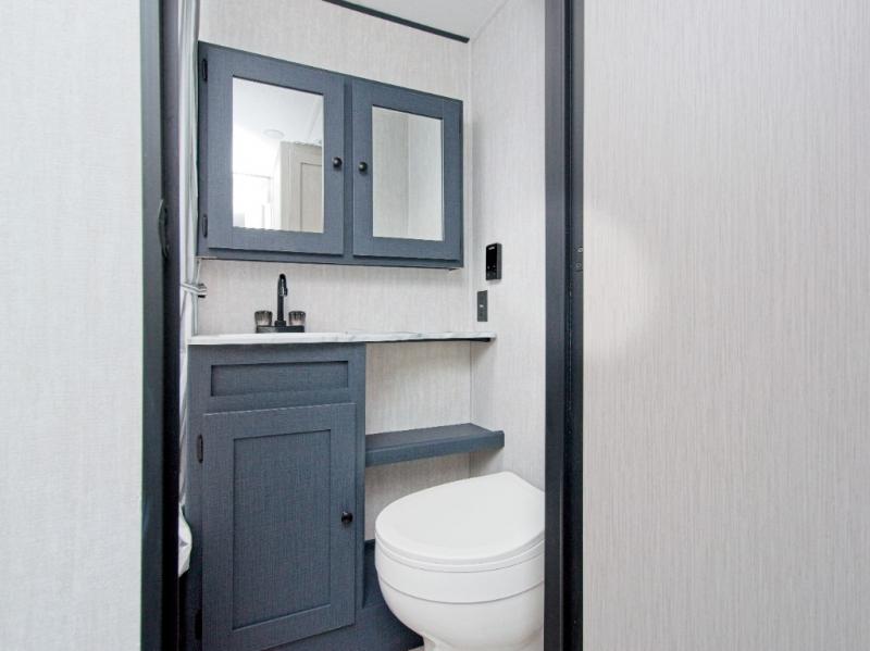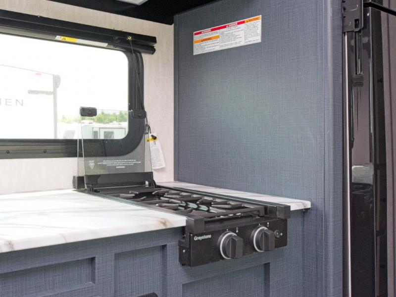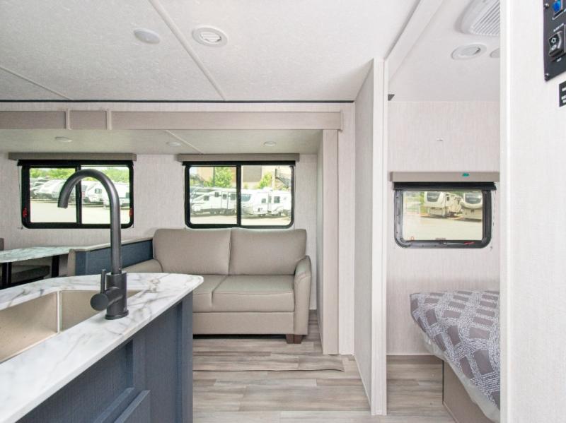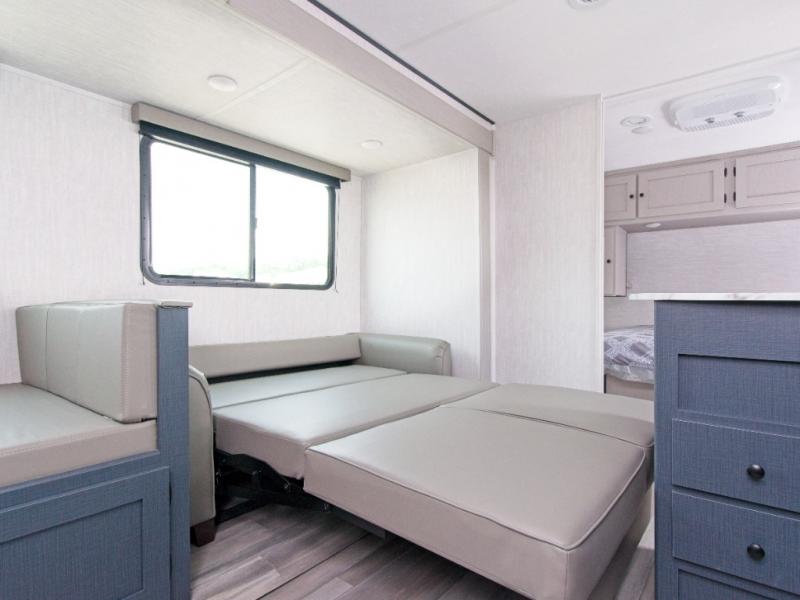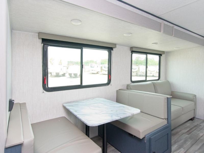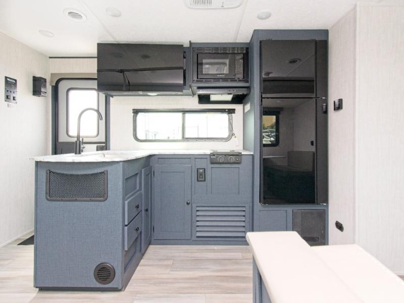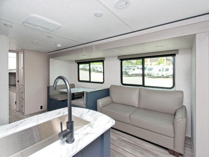 The Coachmen Apex X Series travel trailer 29BHX is ideal for family camping trips, featuring a rear bunkhouse with four bunks for guests and a front private bedroom with a queen bed for you. The large slide-out in the kitchen and living area includes a sofa and booth dinette, both of which can be converted into sleeping spaces for extra guests. The L-shaped kitchen counter is equipped with a large sink, microwave, range, refrigerator, and pantry, making meal preparation a breeze.