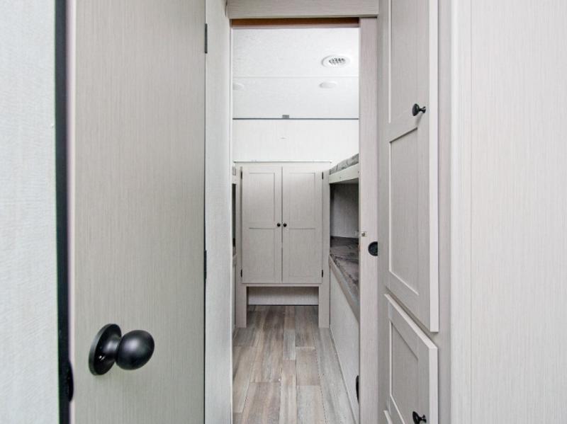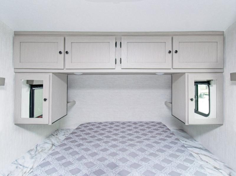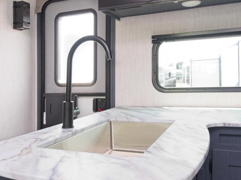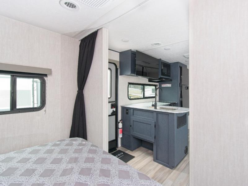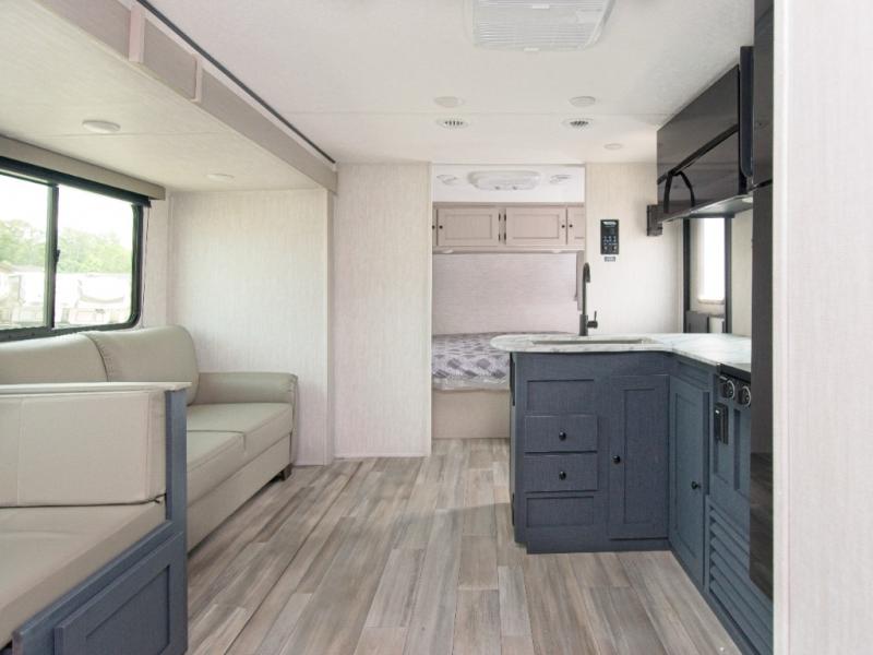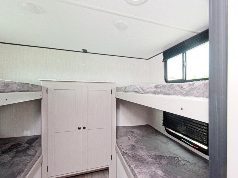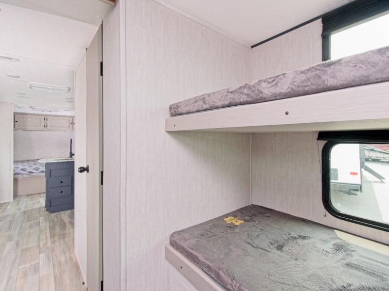 Enjoy family camping trips with the Coachmen Apex X Series 29BHX, featuring a spacious rear bunkhouse with four bunks and an L-shaped kitchen counter for effortless meal preparation.
