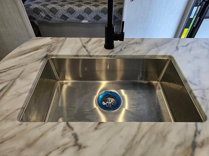 L-shaped counter with large sink for easy prep and clean-up