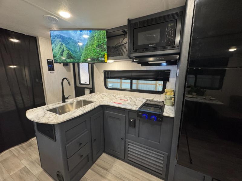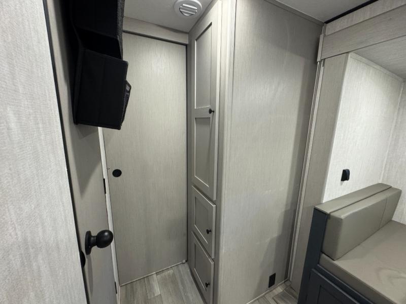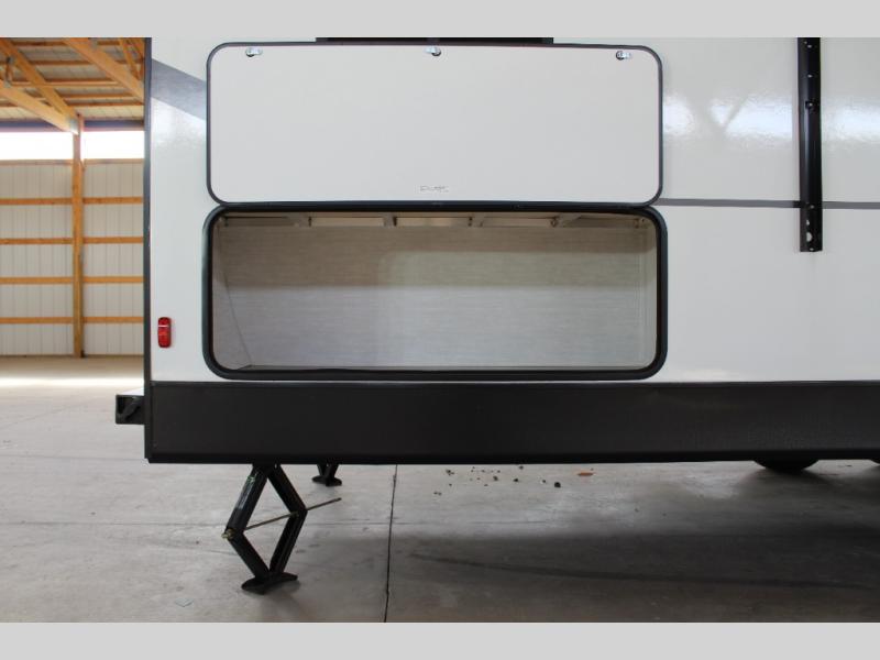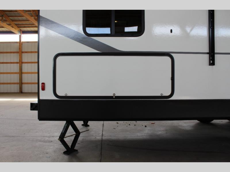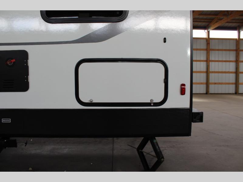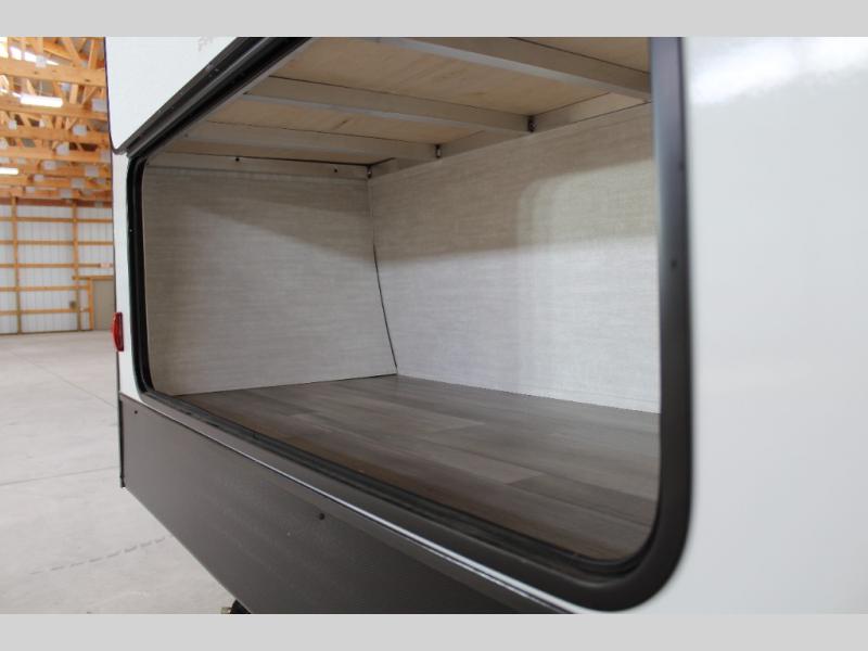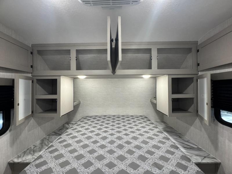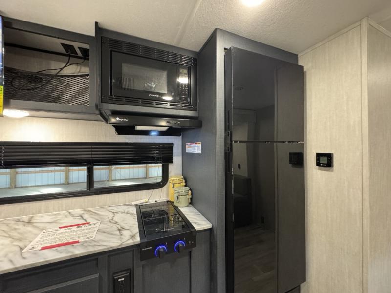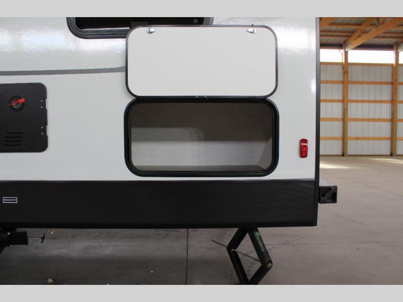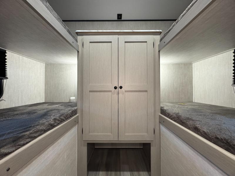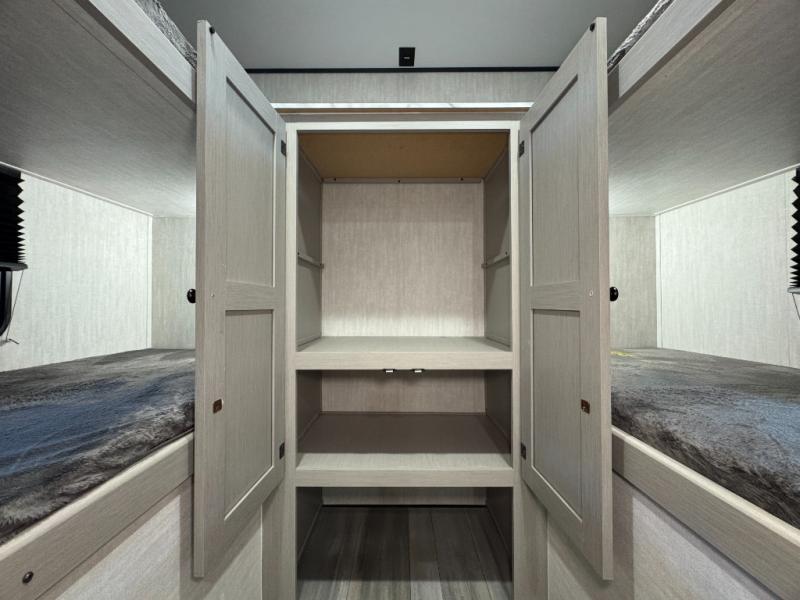 The whole crew will love camping this travel trailer since there is a rear bunkhouse with four bunks for guests and a front private bedroom with a queen bed for you. A large slide out in the combined kitchen and living area houses the sofa and booth dinette, and these pieces of furniture can double as sleeping space for extra guests as well. The chef of your group will appreciate the L-shaped kitchen counter with a large sink, a microwave and range plus a refrigerator and pantry for food storage.