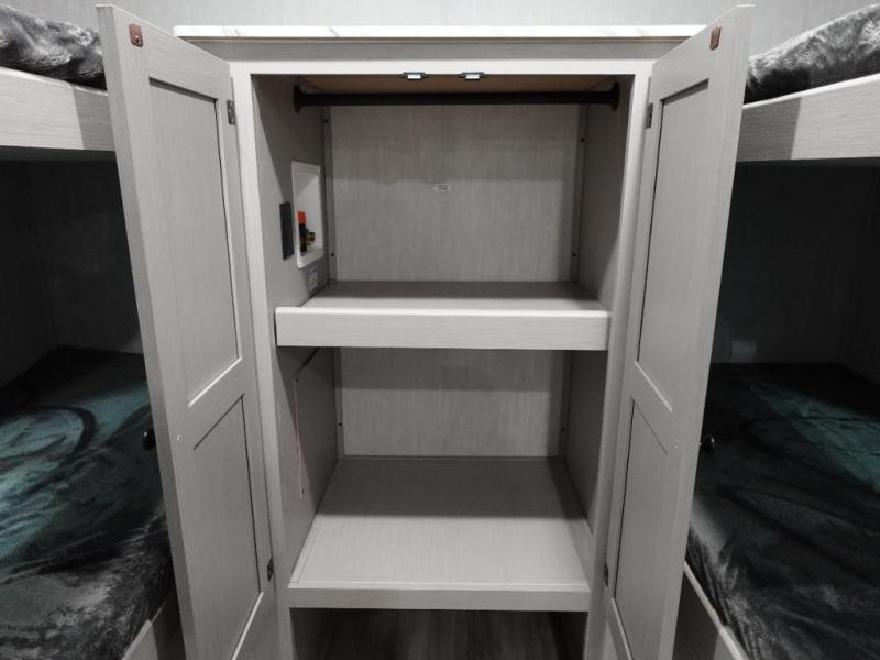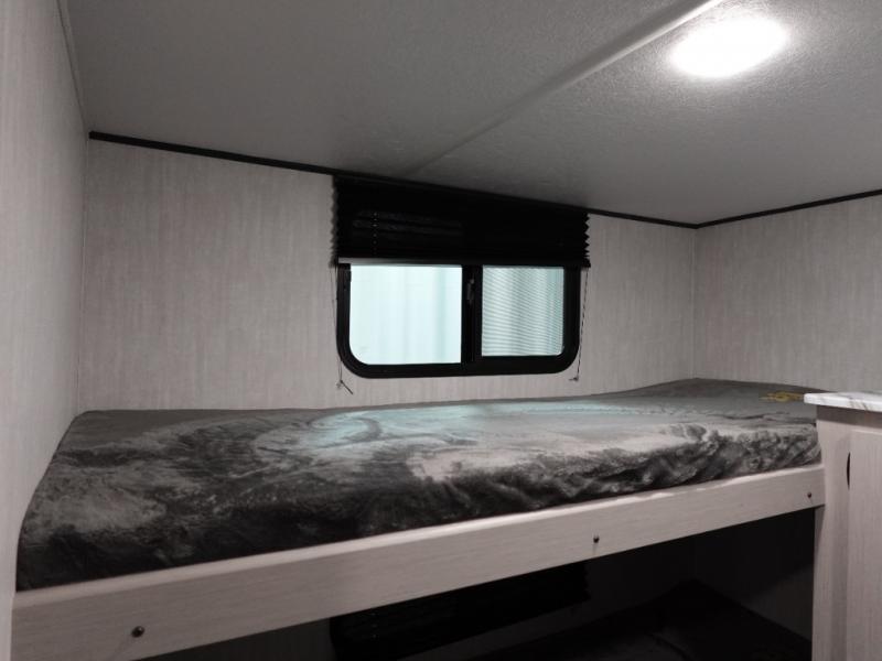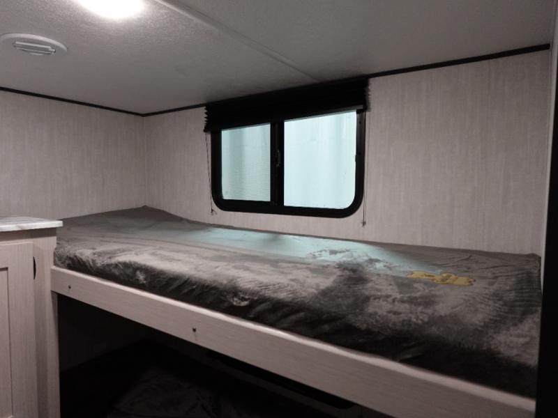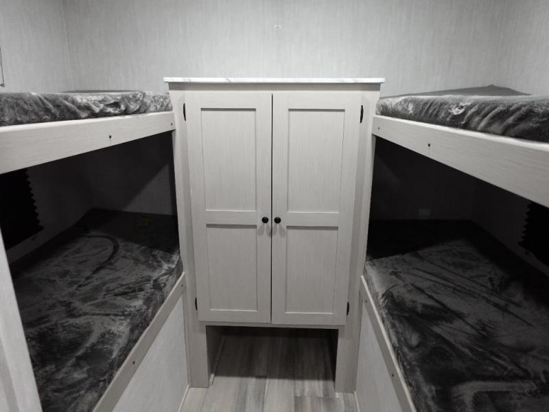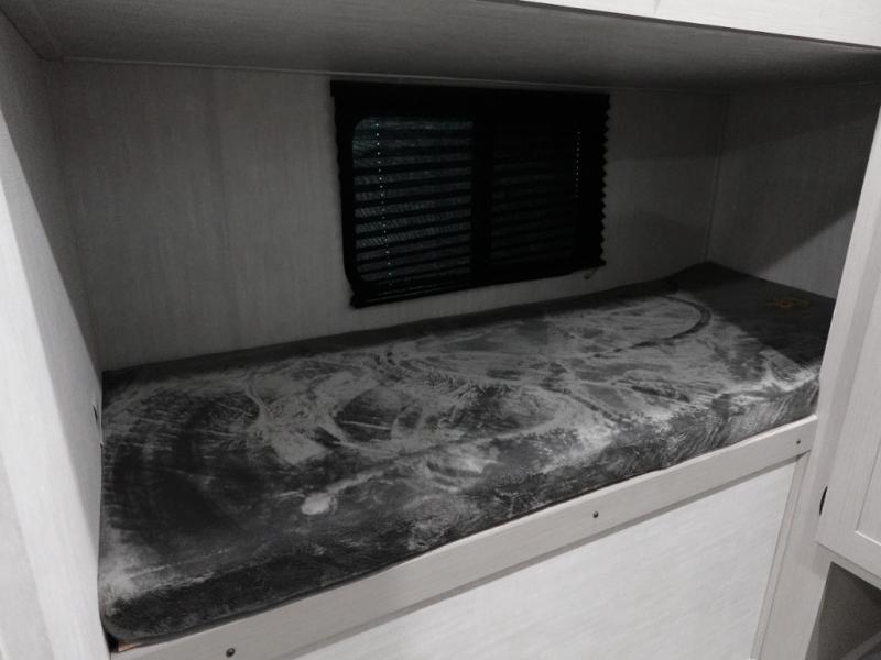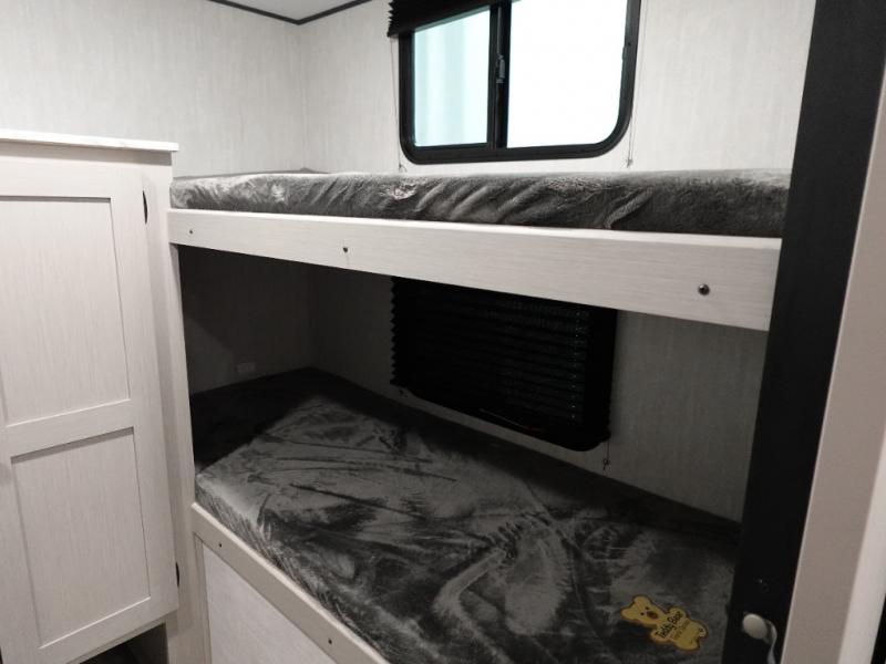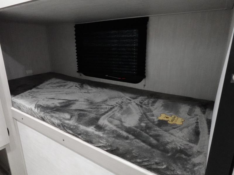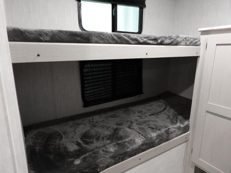 The whole crew will love camping this travel trailer since there is a rear bunkhouse with four bunks for guests and a front private bedroom with a queen bed for you. A large slide out in the combined kitchen and living area houses the theater seats and booth dinette. The chef of your group will appreciate the L-shaped kitchen counter with a large sink, a microwave and range plus a refrigerator and pantry for food storage.