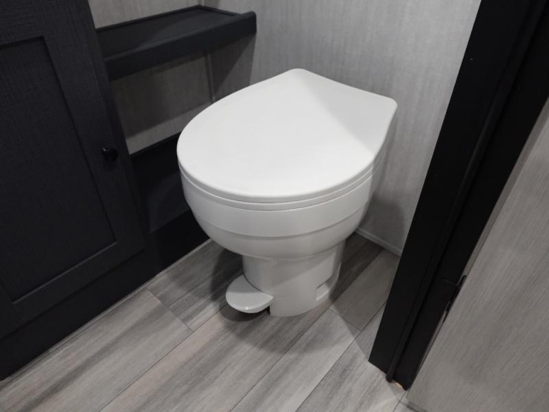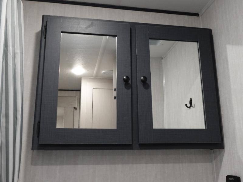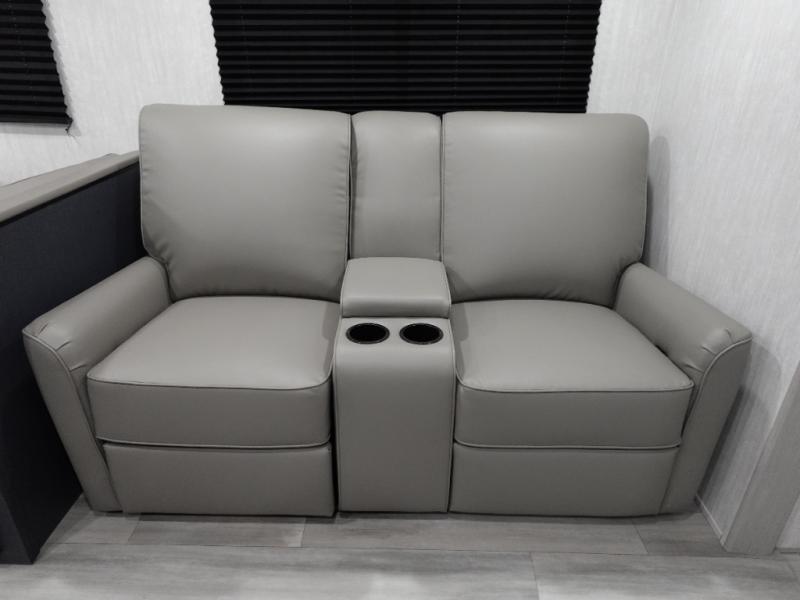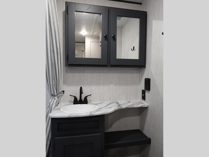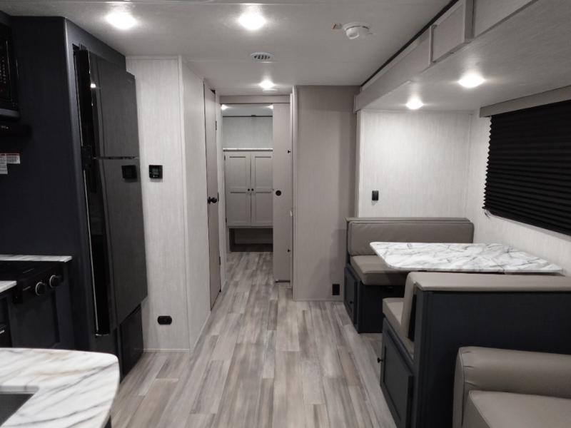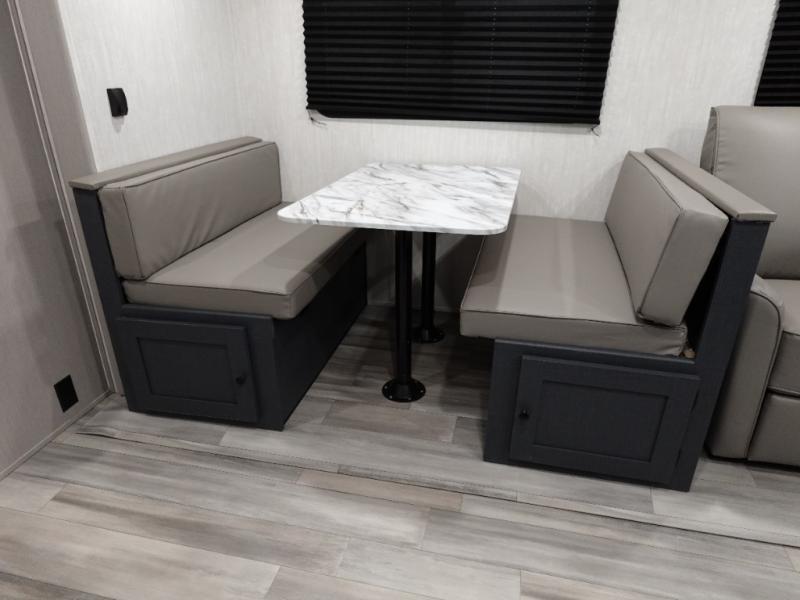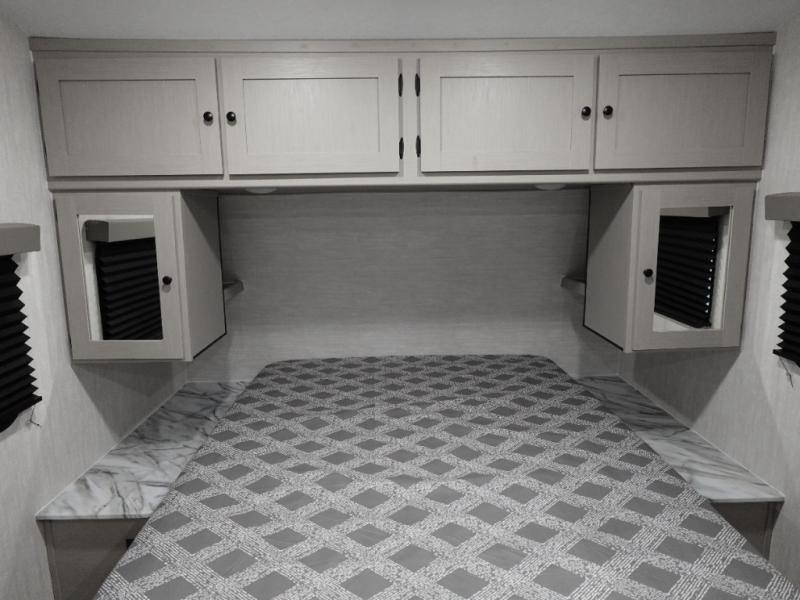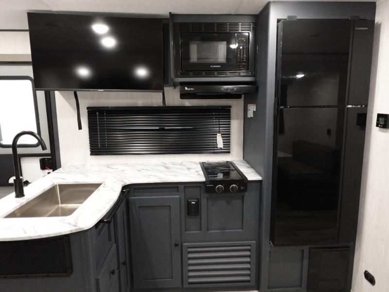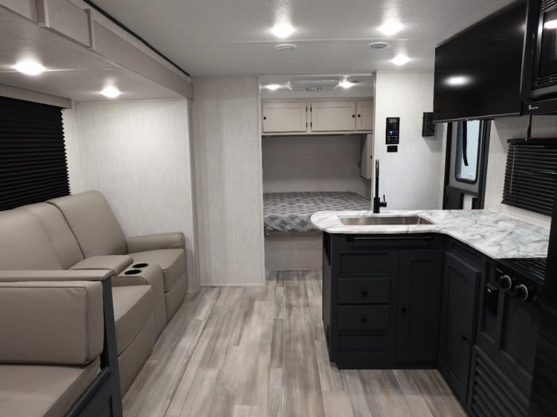 The whole crew will love camping this travel trailer since there is a rear bunkhouse with four bunks for guests and a front private bedroom with a queen bed for you. A large slide out in the combined kitchen and living area houses the theater seats and booth dinette. The chef of your group will appreciate the L-shaped kitchen counter with a large sink, a microwave and range plus a refrigerator and pantry for food storage.