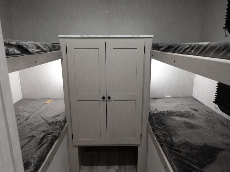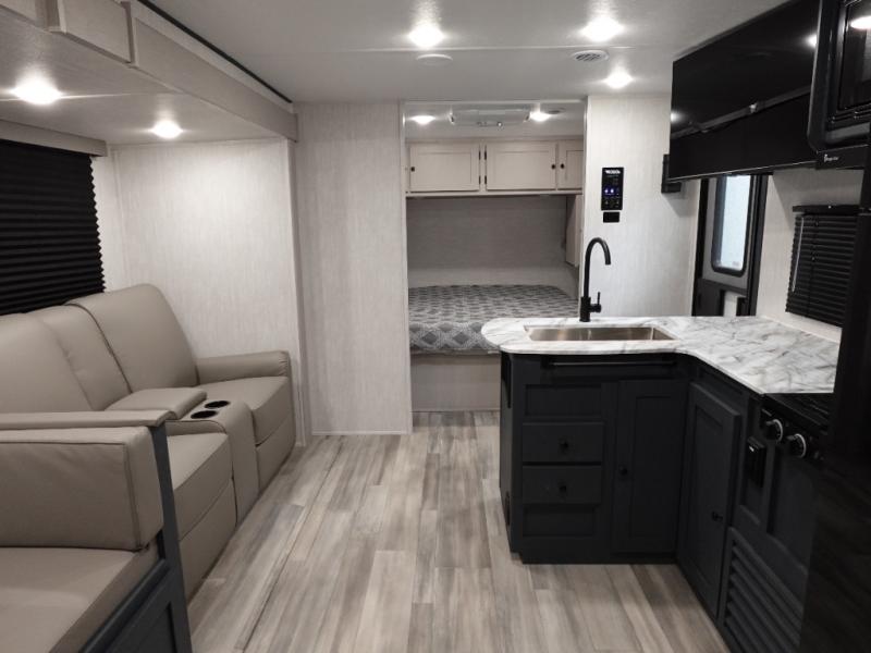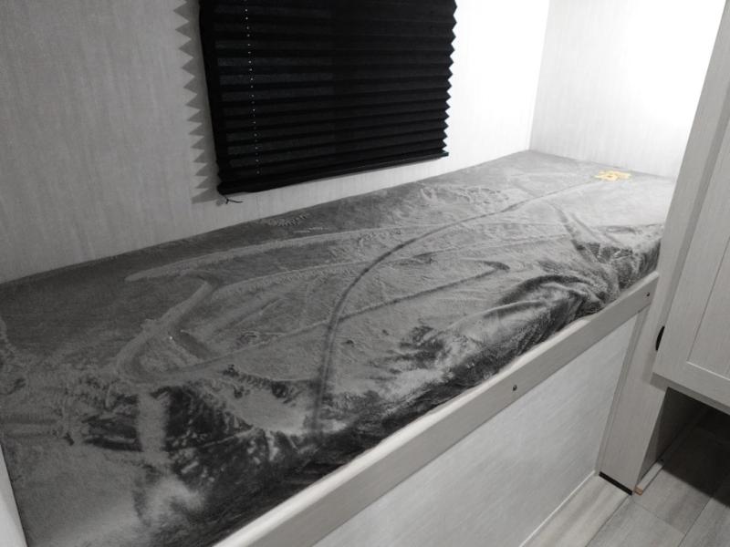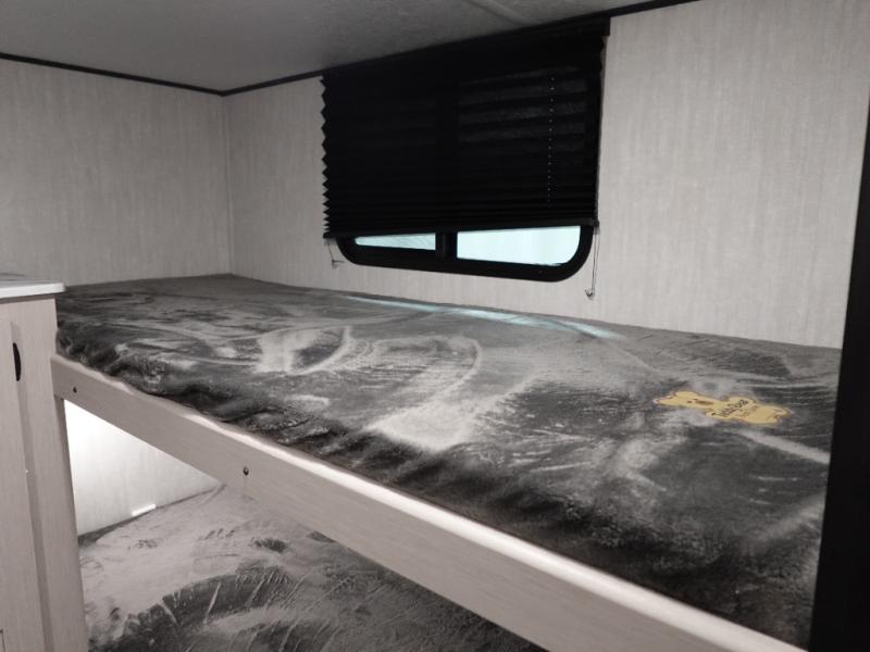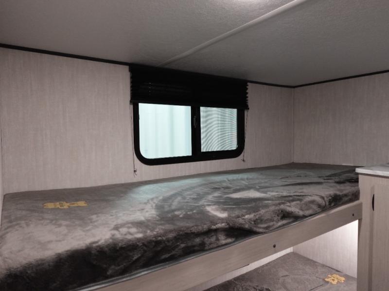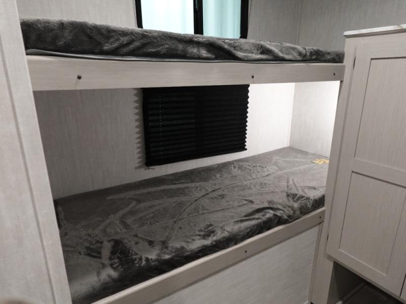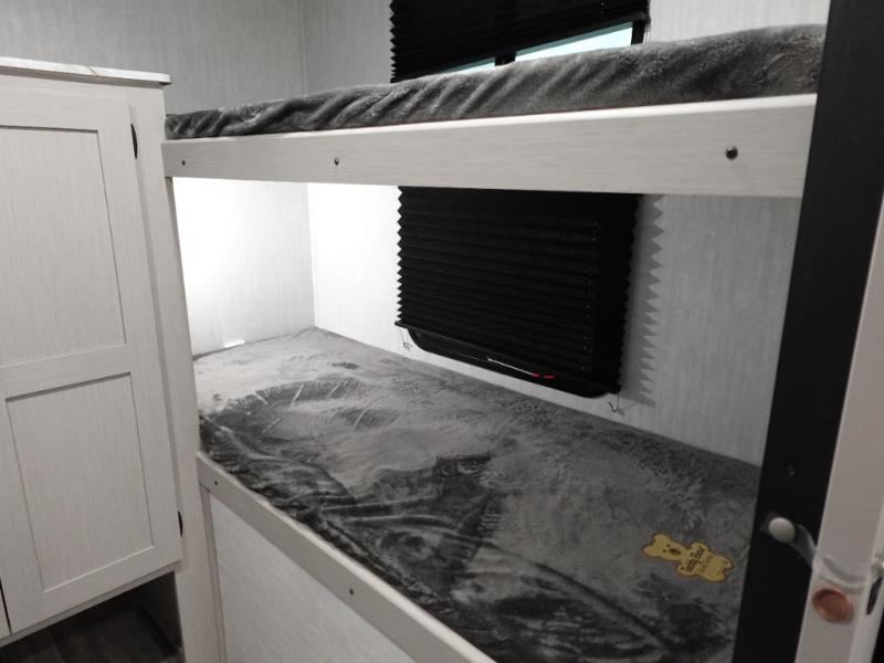 The whole crew will love camping this travel trailer since there is a rear bunkhouse with four bunks for guests and a front private bedroom with a queen bed for you. A large slide out in the combined kitchen and living area houses the sofa and booth dinette, and these pieces of furniture can double as sleeping space for extra guests as well. The chef of your group will appreciate the L-shaped kitchen counter with a large sink, a microwave and range plus a refrigerator and pantry for food storage.