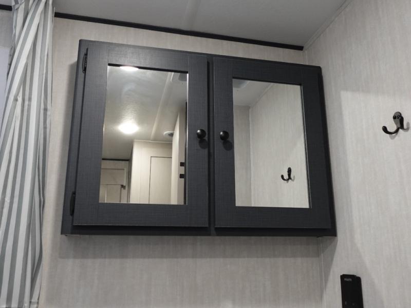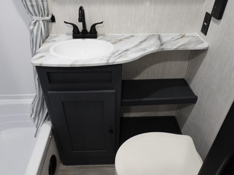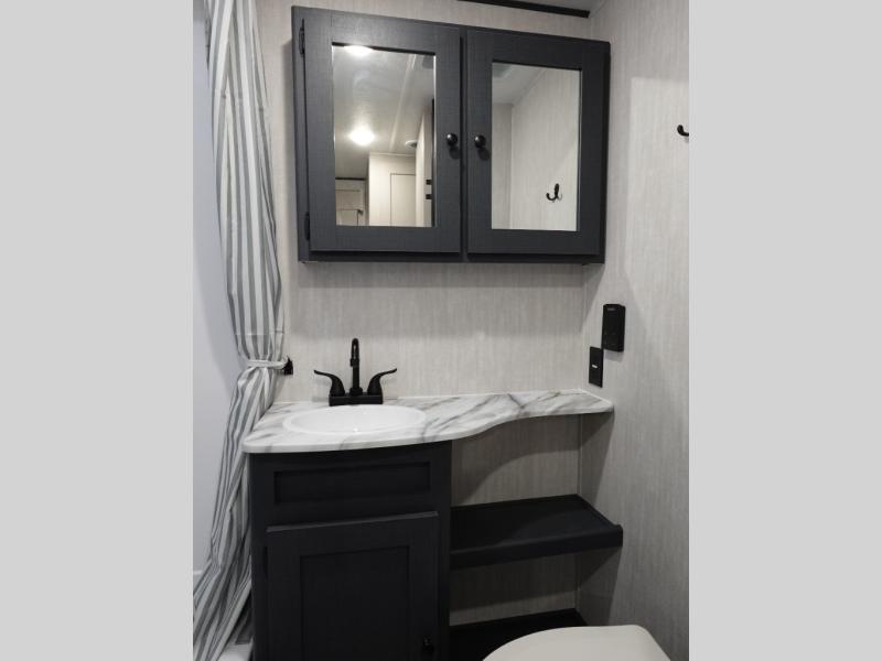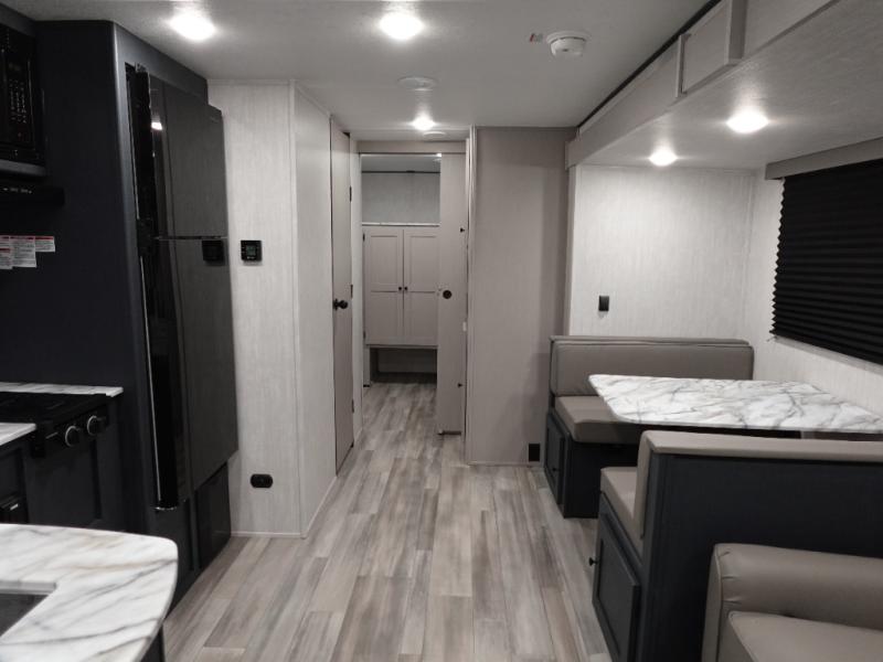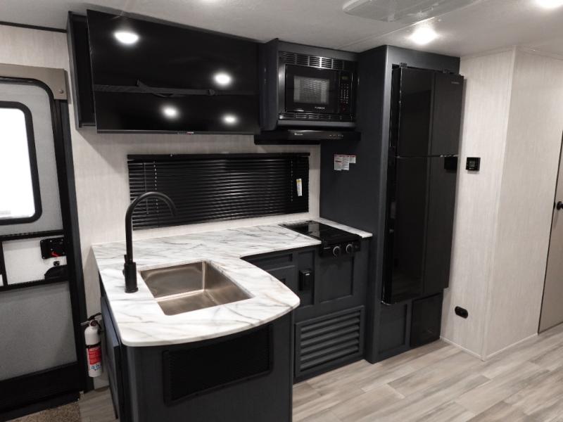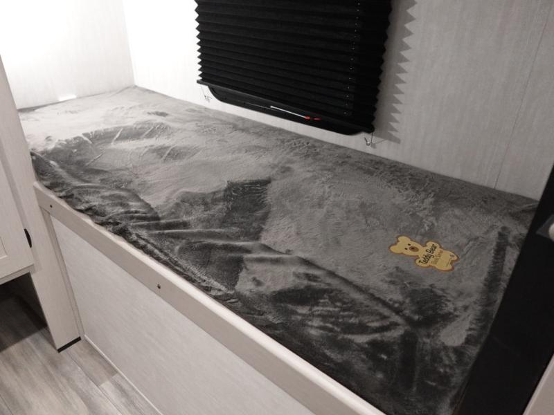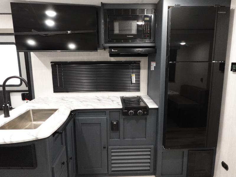 The whole crew will love camping this travel trailer since there is a rear bunkhouse with four bunks for guests and a front private bedroom with a queen bed for you. A large slide out in the combined kitchen and living area houses the sofa and booth dinette, and these pieces of furniture can double as sleeping space for extra guests as well. The chef of your group will appreciate the L-shaped kitchen counter with a large sink, a microwave and range plus a refrigerator and pantry for food storage.
