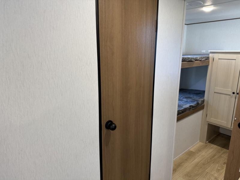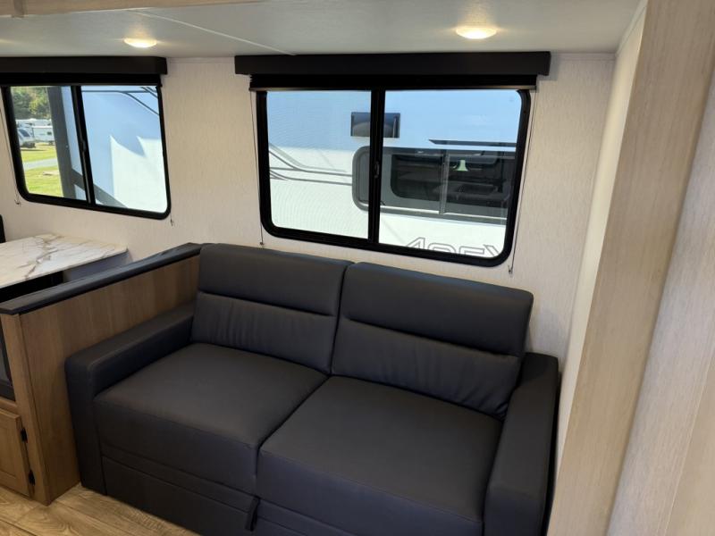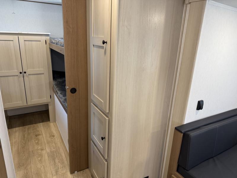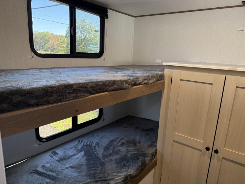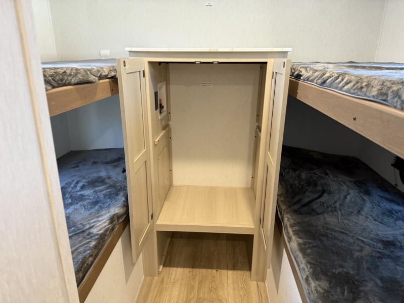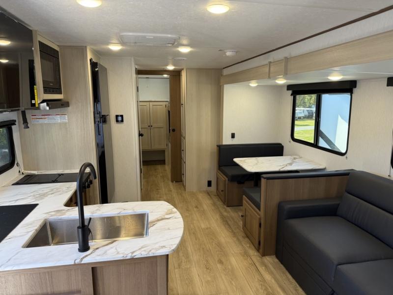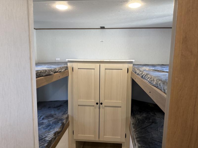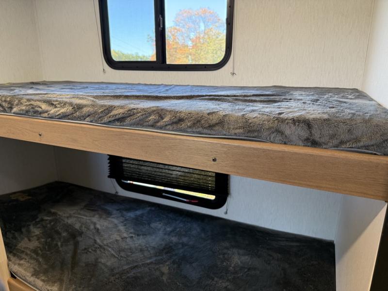 The whole crew will love camping this travel trailer since there is a rear bunkhouse with four bunks for guests and a front private bedroom with a queen bed for you. A large slide out in the combined kitchen and living area houses the sofa and booth dinette, and these pieces of furniture can double as sleeping space for extra guests as well. The chef of your group will appreciate the L-shaped kitchen counter with a large sink, a microwave and range plus a refrigerator and pantry for food storage.