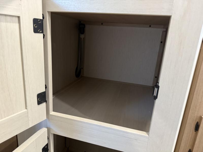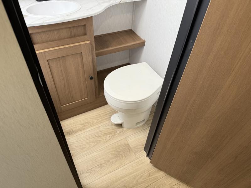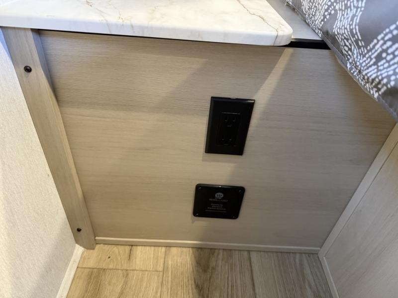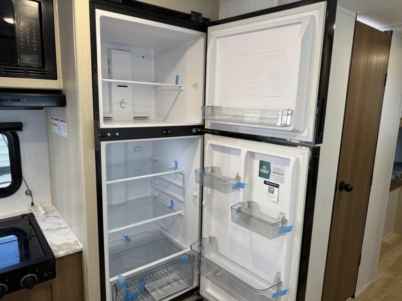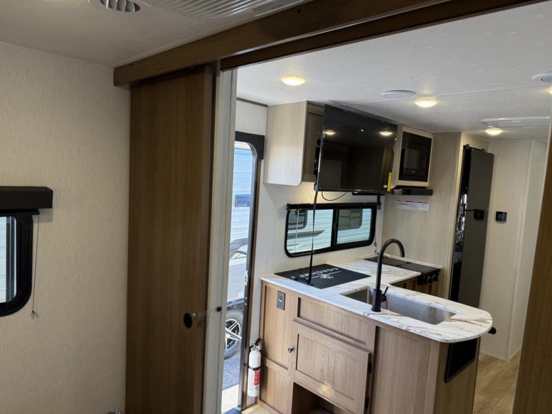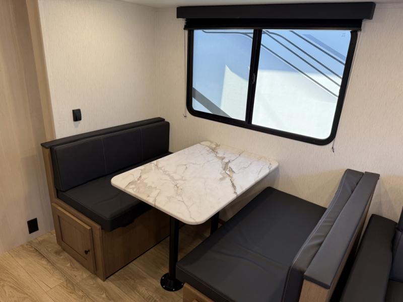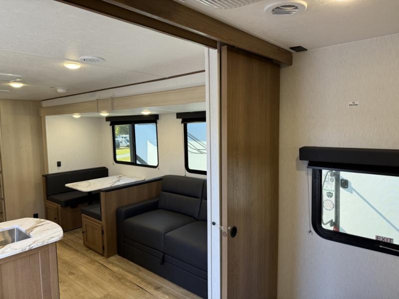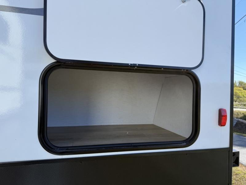 The whole crew will love camping this travel trailer since there is a rear bunkhouse with four bunks for guests and a front private bedroom with a queen bed for you. A large slide out in the combined kitchen and living area houses the sofa and booth dinette, and these pieces of furniture can double as sleeping space for extra guests as well. The chef of your group will appreciate the L-shaped kitchen counter with a large sink, a microwave and range plus a refrigerator and pantry for food storage.