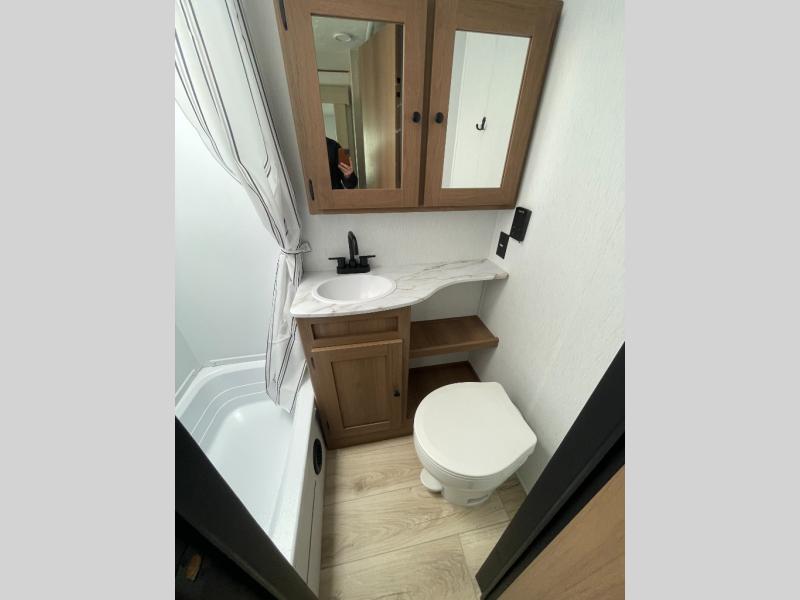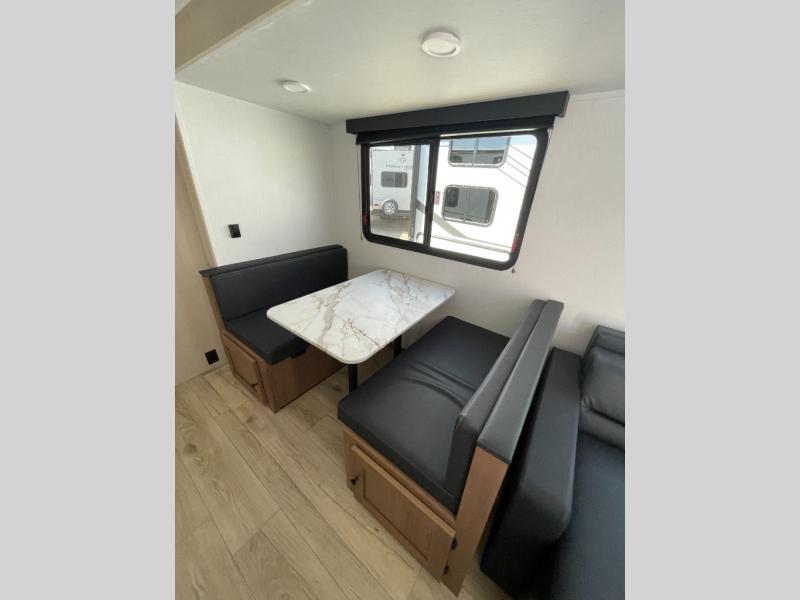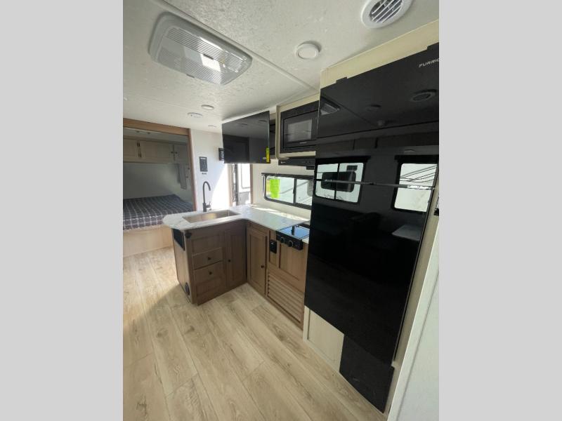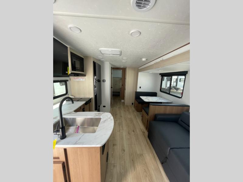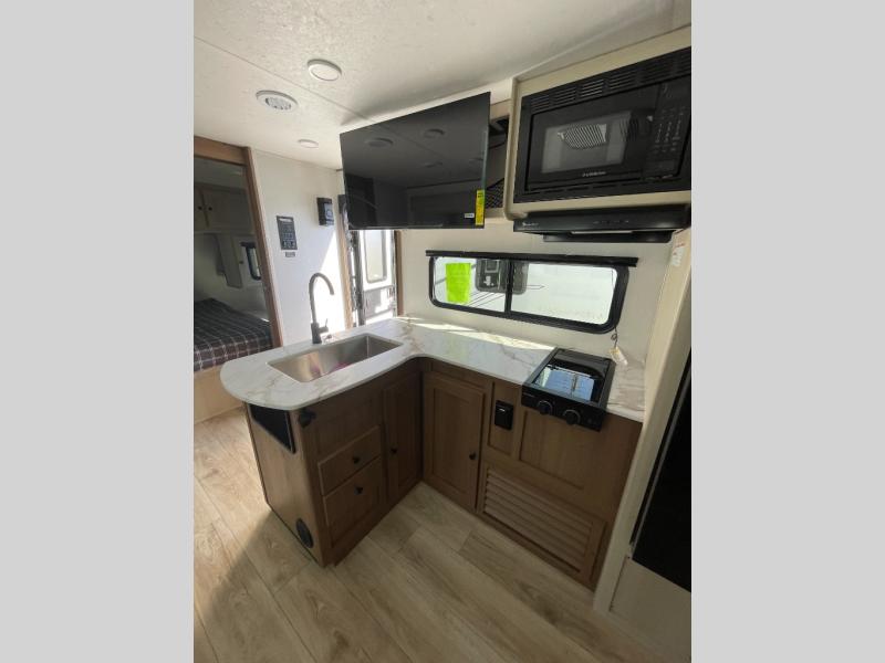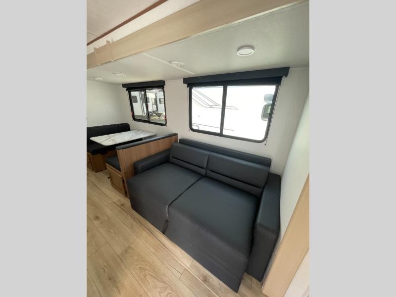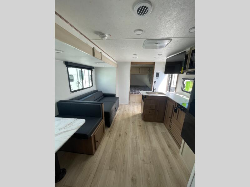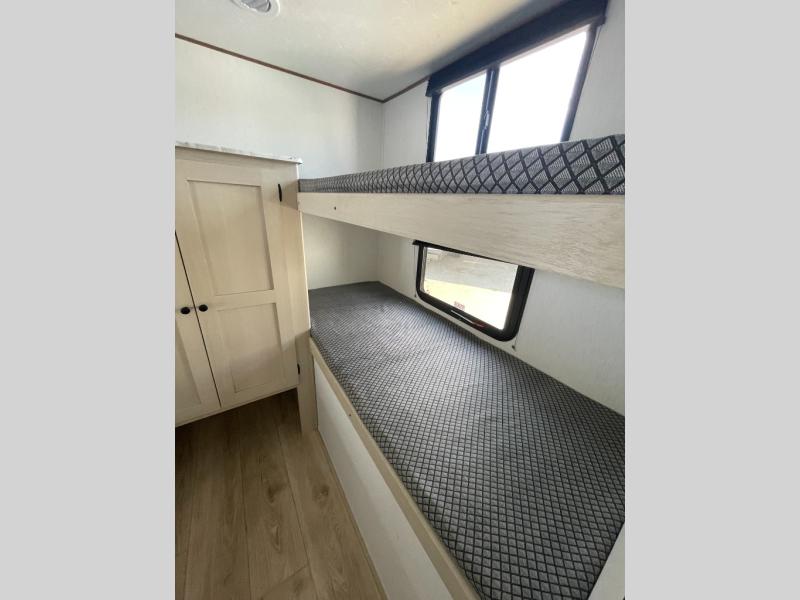 The whole crew will love camping this travel trailer since there is a rear bunkhouse with four bunks for guests and a front private bedroom with a queen bed for you. A large slide out in the combined kitchen and living area houses the sofa and booth dinette, and these pieces of furniture can double as sleeping space for extra guests as well. The chef of your group will appreciate the L-shaped kitchen counter with a large sink, a microwave and range plus a refrigerator and pantry for food storage.