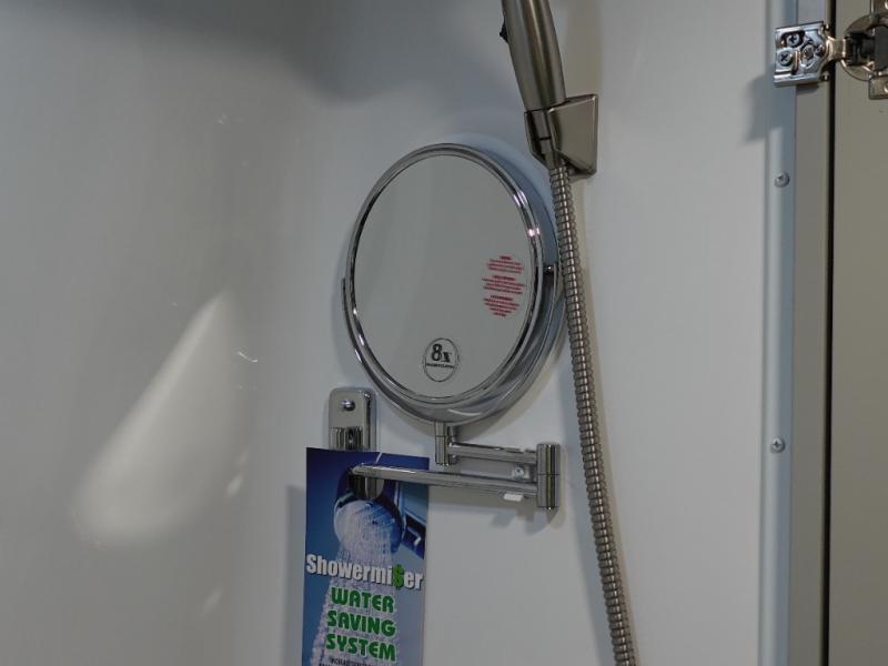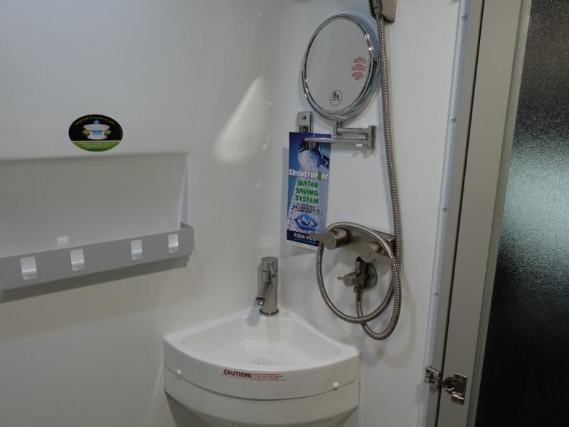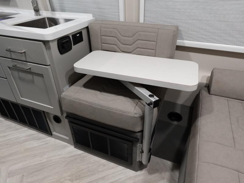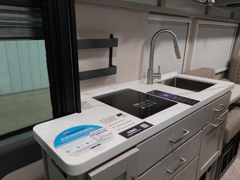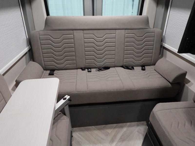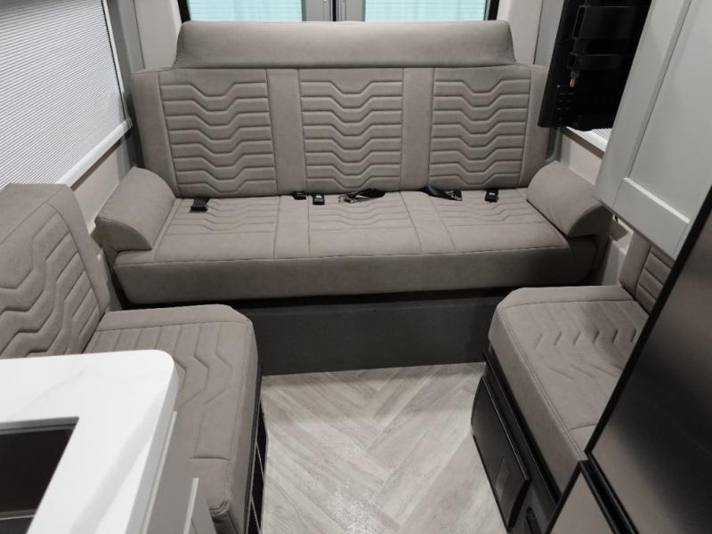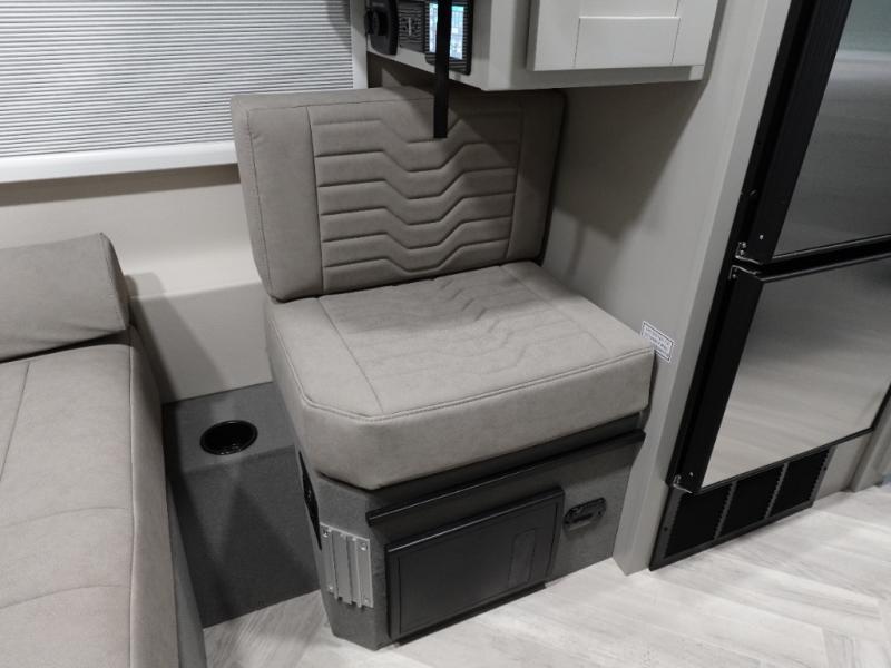 This all-wheel drive coach is perfect for trips near and far. Once you park, you can swivel the captain's seats around to enjoy lunch at the swivel table, and you can freshen up in the convenient wet bath before heading out to stretch your legs. There is an induction cooktop, a round sink, plus a Nova Kool compressor refrigerator for your perishables. The two jump seats and rear power sofa will convert to a comfortable bed at night, and the swivel table in between will allow you to play a game of cards before bed. And don't worry about storage space since this model includes overhead compartments and a wardrobe to keep your clothes wrinkle-free!
