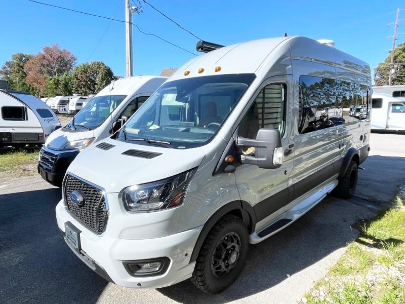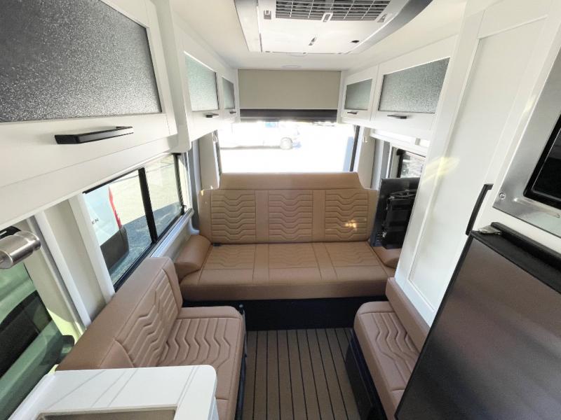This all-wheel drive coach is perfect for trips near and far. Once you park, you can swivel the captain's seats around to enjoy lunch at the swivel table, and you can freshen up in the convenient wet bath before heading out to stretch your legs. There is an induction cooktop, a round sink, plus a Nova Kool compressor refrigerator for your perishables. The two jump seats and rear power sofa will convert to a comfortable bed at night, and the swivel table in between will allow you to play a game of cards before bed. And don't worry about storage space since this model includes overhead compartments and a wardrobe to keep your clothes wrinkle-free!