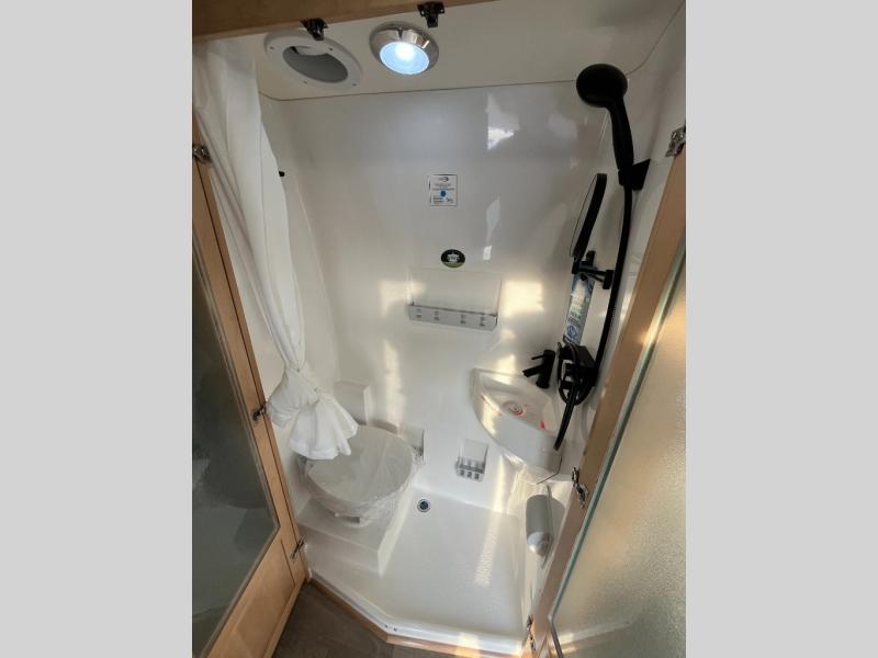 This all-wheel drive coach is perfect for trips near and far. Once you park, you can swivel the captain's seats around to enjoy lunch at the swivel table, and you can freshen up in the convenient wet bath before heading out to stretch your legs. There is an induction cooktop, a round sink, plus a Nova Kool compressor refrigerator for your perishables. The two jump seats and rear power sofa will convert to a comfortable bed at night, and the swivel table in between will allow you to play a game of cards before bed. And don't worry about storage space since this model includes overhead compartments and a wardrobe to keep your clothes wrinkle-free!